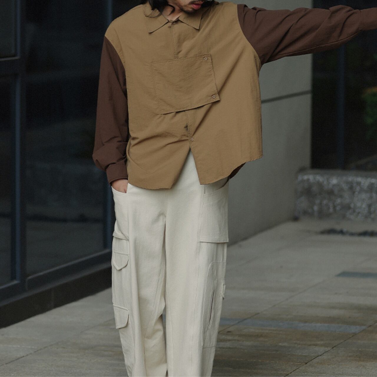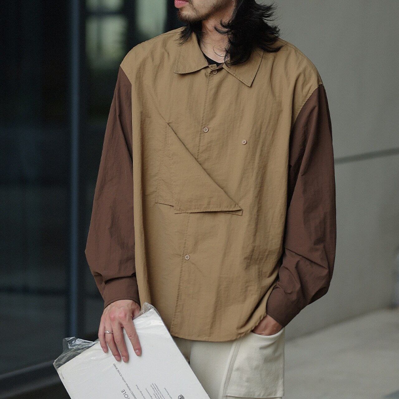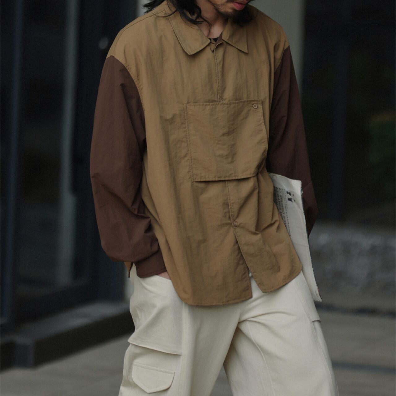 ツートーンのカラーリングが際立つ、軽量で快適なナイロンシャツ。フロントの変形ポケットデザインがアクセントとなり、個性的なスタイリングに。シンプルながらもアウトドアやアーバンスタイルにマッチする汎用性の高い一着。