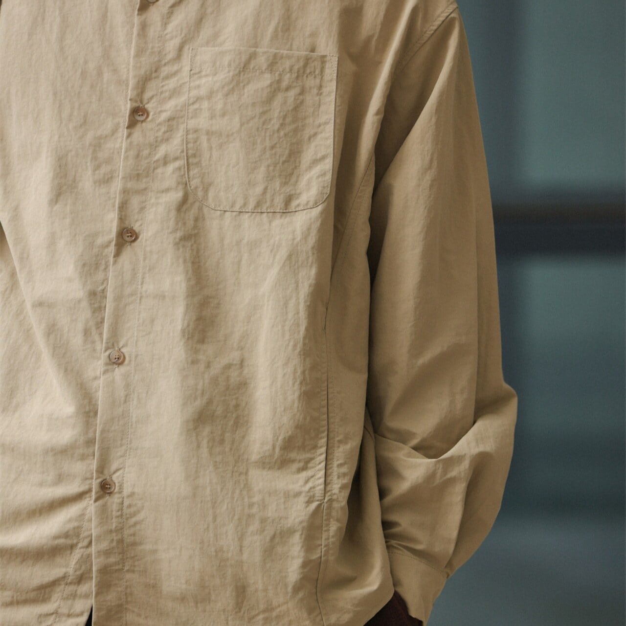 軽やかでシワになりにくいナイロン素材を使用した、機能性とデザイン性を兼ね備えた長袖シャツ。ほどよい光沢感としっかりした風合いが特徴で、インナーにもアウターにも活用できる万能な一枚です。胸元のポケットがアクセントとなり、実用性も◎