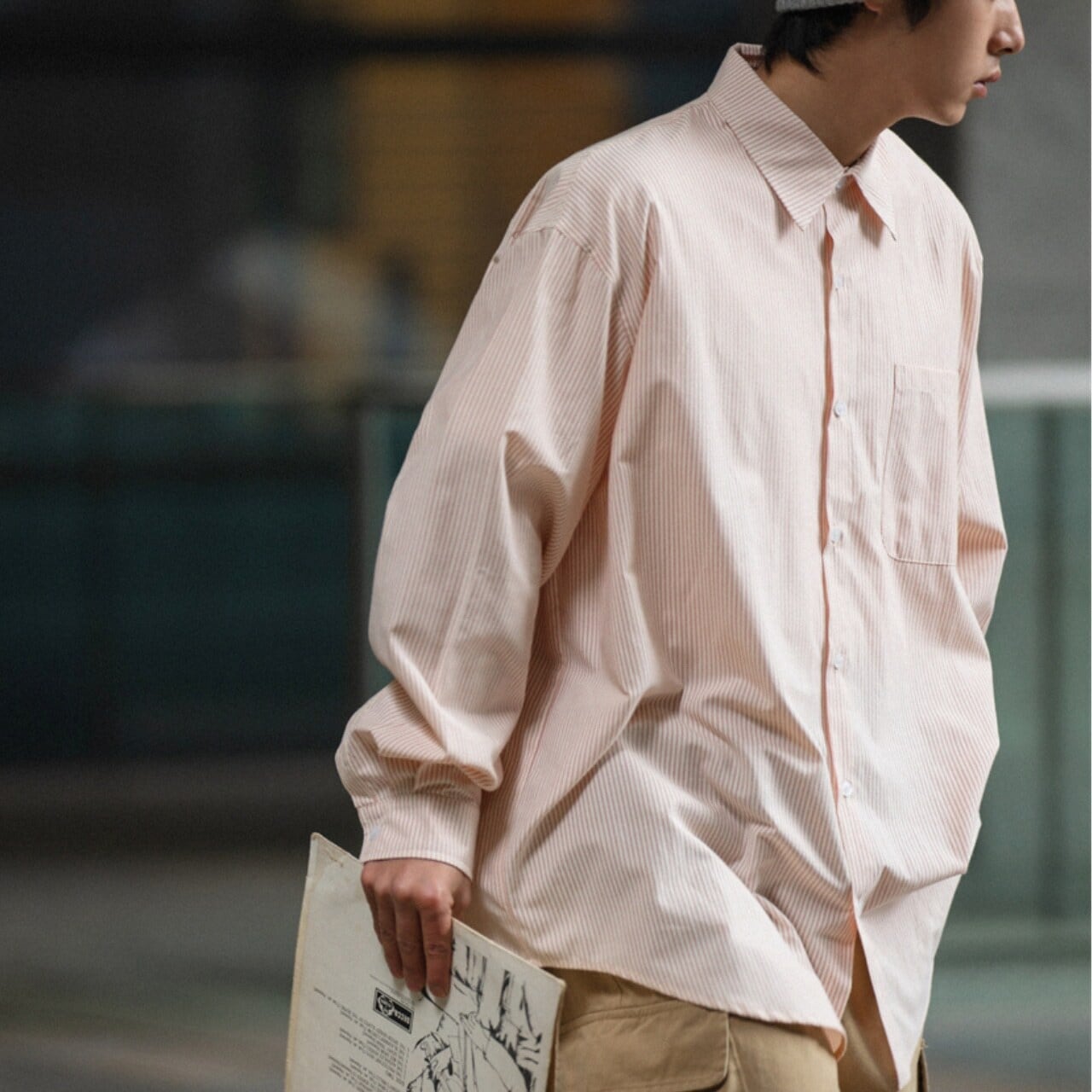 細かなストライプ柄とシンプルなディテールが特徴の長袖シャツ。ドロップショルダーとワイドシルエットで、リラックスした雰囲気とトレンド感を演出します。軽量でハリのあるポリエステル混紡素材が、型崩れしにくく扱いやすい一枚。春のレイヤードスタイルにもぴったりです。