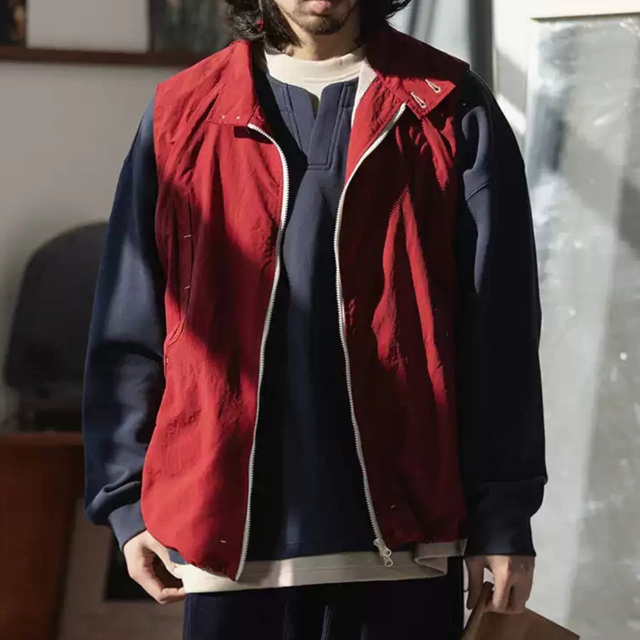 シンプルでスタイリッシュな機能性ジャケット。快適な着心地と洗練されたデザインを兼ね備えた多目的アウターウェア。袖の着脱が可能で持ち運びできます。