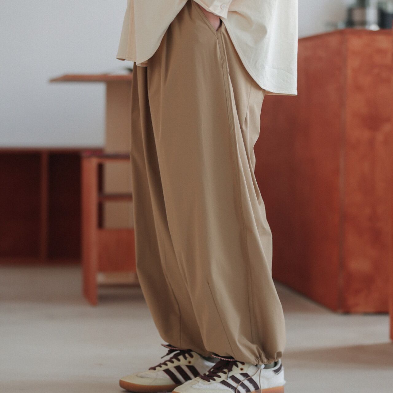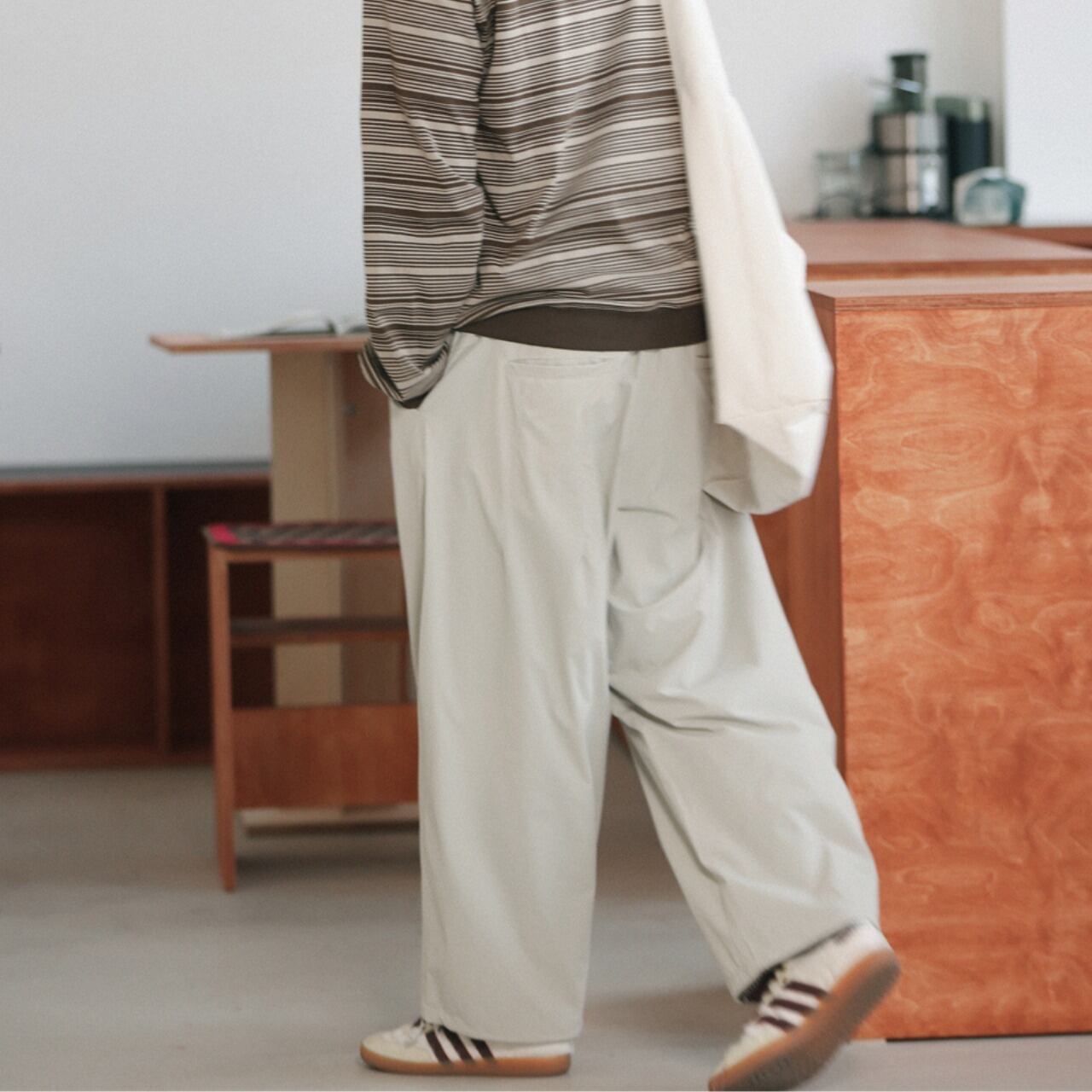 裾にドローコードを備えたワイドテーパードシルエットのナイロンパンツ。軽量で程よいハリ感のあるナイロン素材に、ストレッチ性を持たせて快適な穿き心地を実現。ウエストは総ゴム仕様で、フロントにボタン付きデザインをプラス。ミニマルな見た目ながら、サイドポケットやヒップポケットも完備され、日常使いにぴったり。カジュアルからストリートまで幅広いスタイルにフィットする万能ボトムスです。