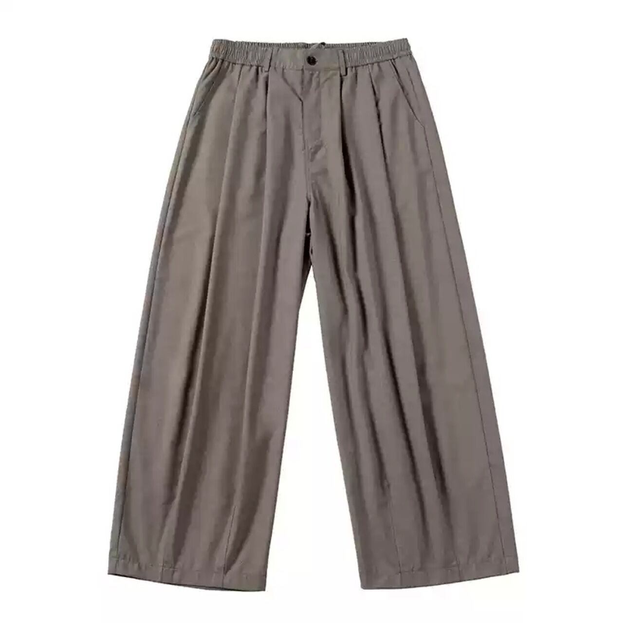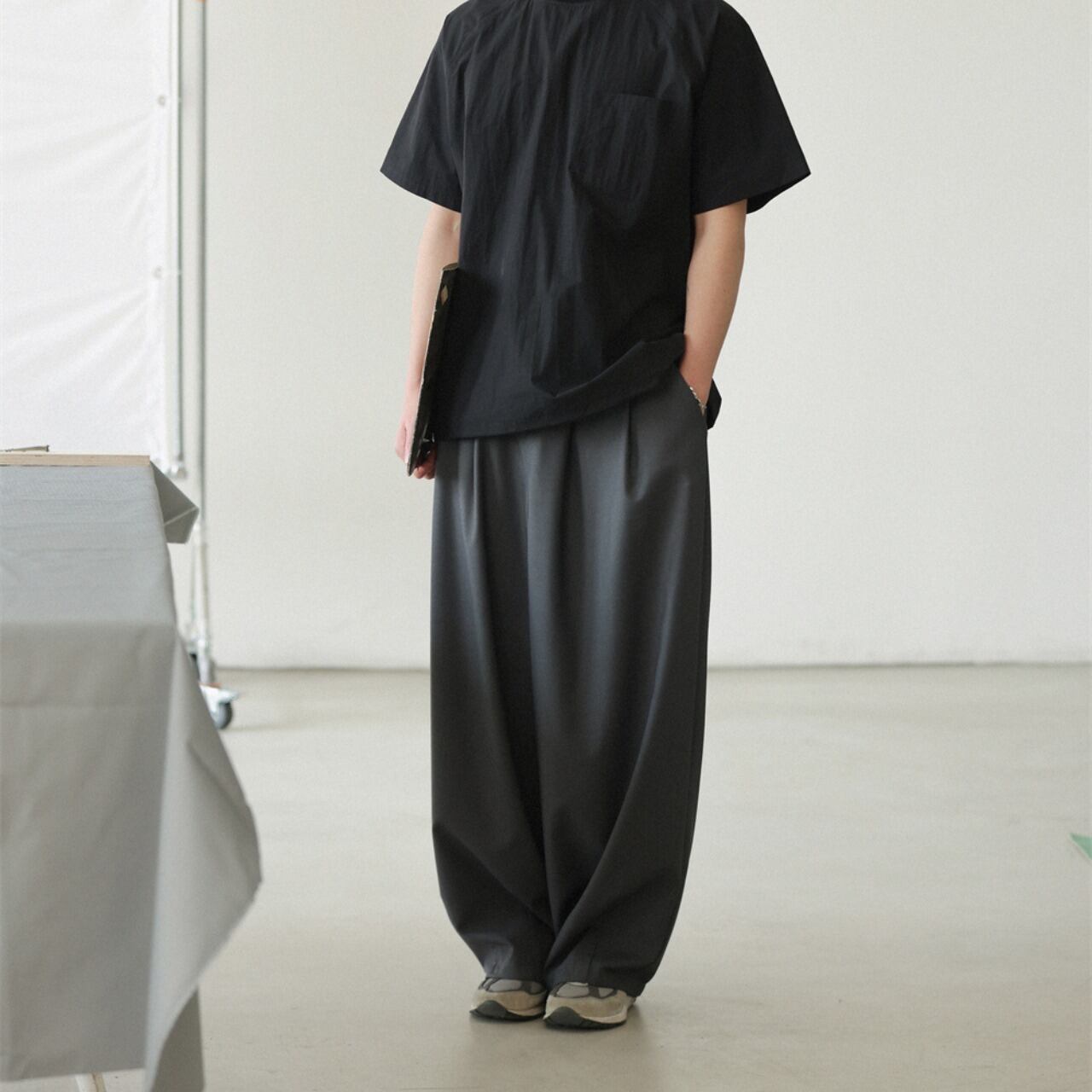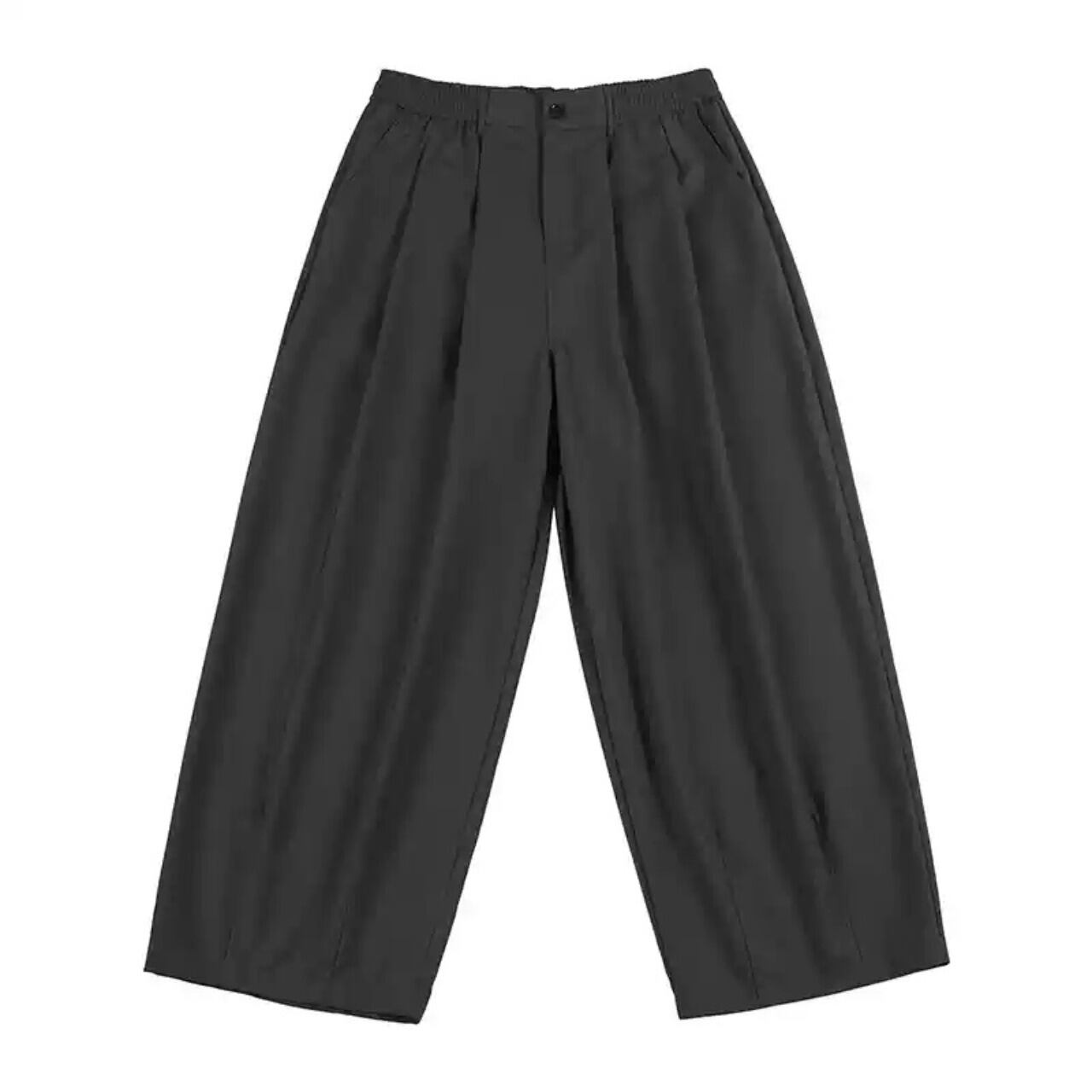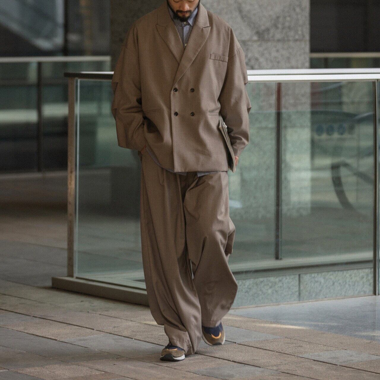 ハリ感と落ち感を兼ね備えた上品なツイル素材を使用したワイドスラックス。シルエットはゆったりとしたストレートタイプで、裾にかけての美しいドレープが特徴。イージーなウエストゴム+内紐仕様で、リラックス感のある穿き心地ながらも、フロントのタックが程よくきちんと感も演出します。