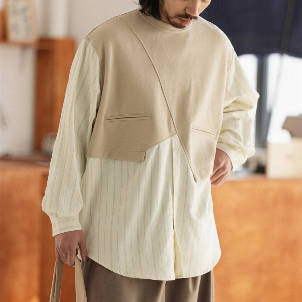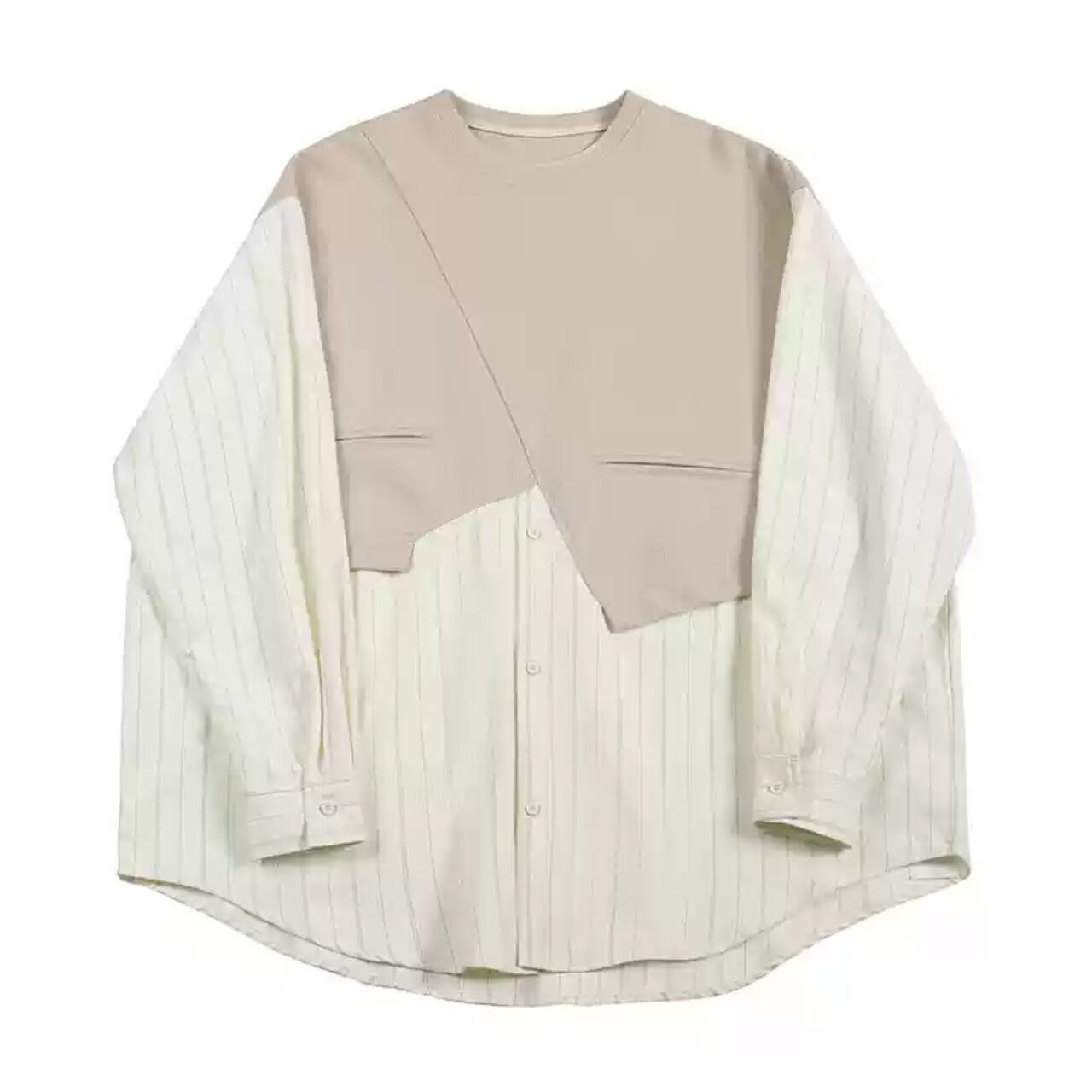 スウェットとシャツをドッキングさせたような異素材切り替えデザインのトップス。上部は伸縮性のあるコットン混素材、下部は爽やかなストライプシャツ生地を使用し、1枚でレイヤードスタイルが完成します。斜めの切り替えラインや両胸のポケット風ディテールがデザイン性を高め、リラックス感のある着心地とこなれ感を両立しています。