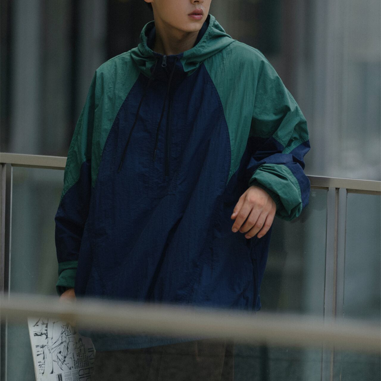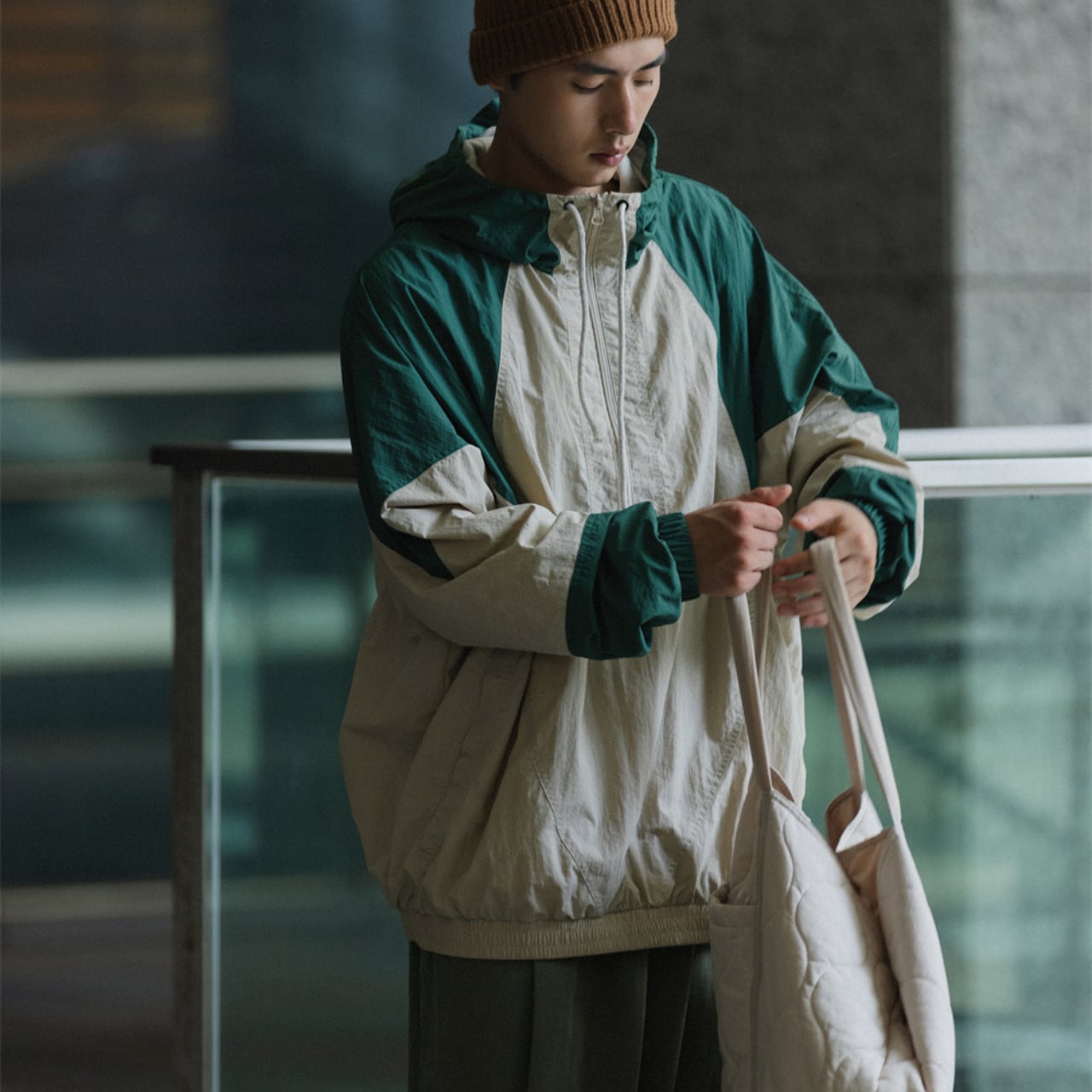 90年代のスポーツミックスを彷彿とさせる、大胆なカラーブロックが魅力のアノラックパーカー。軽量ながらしっかりとしたナイロン素材で、秋のストリートスタイルやアウトドアシーンに最適。フロントにはハーフジップ、袖や裾はギャザー仕上げで、トレンド感のあるルーズシルエットです。