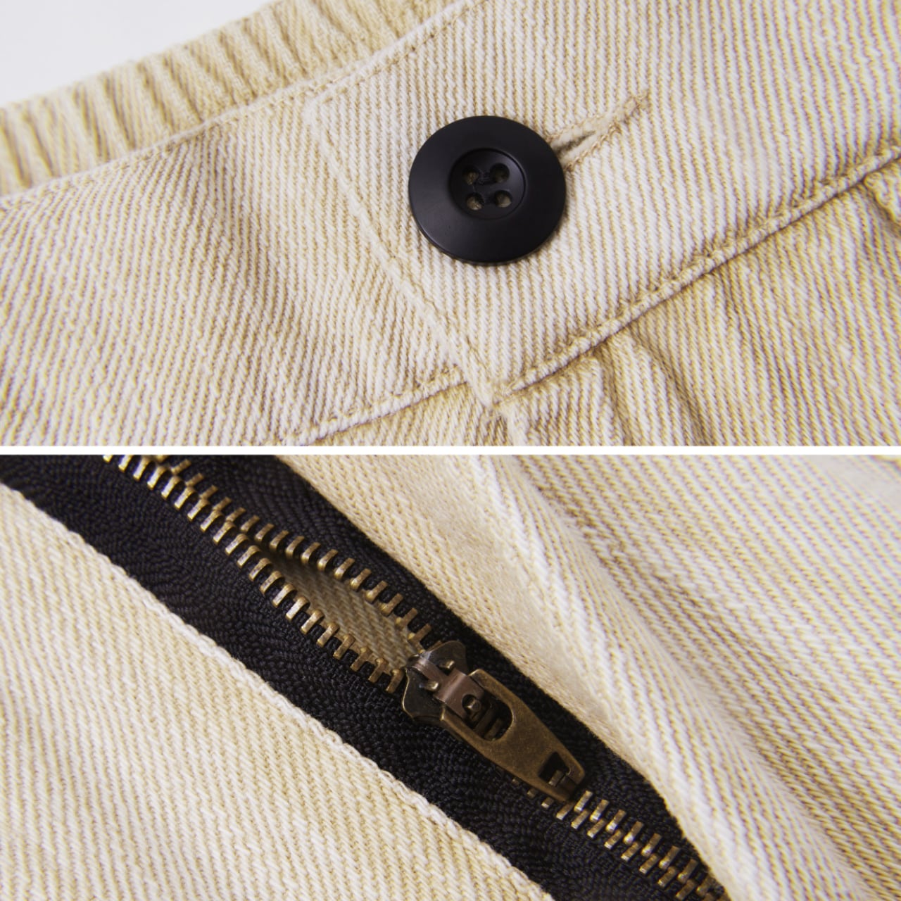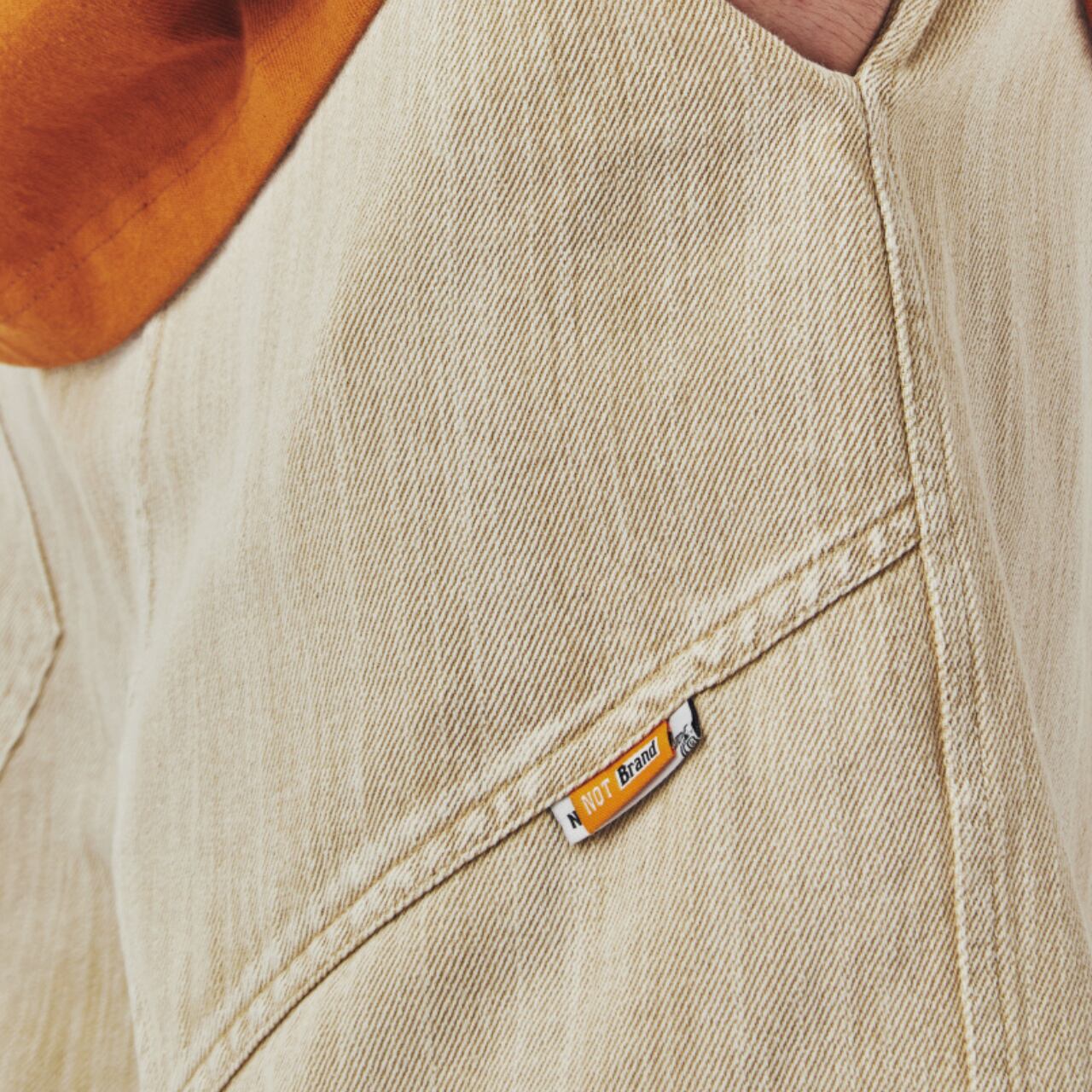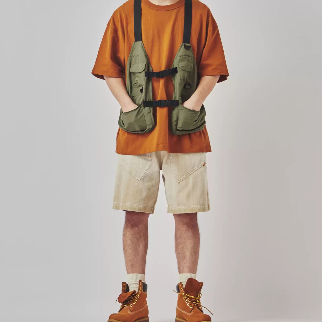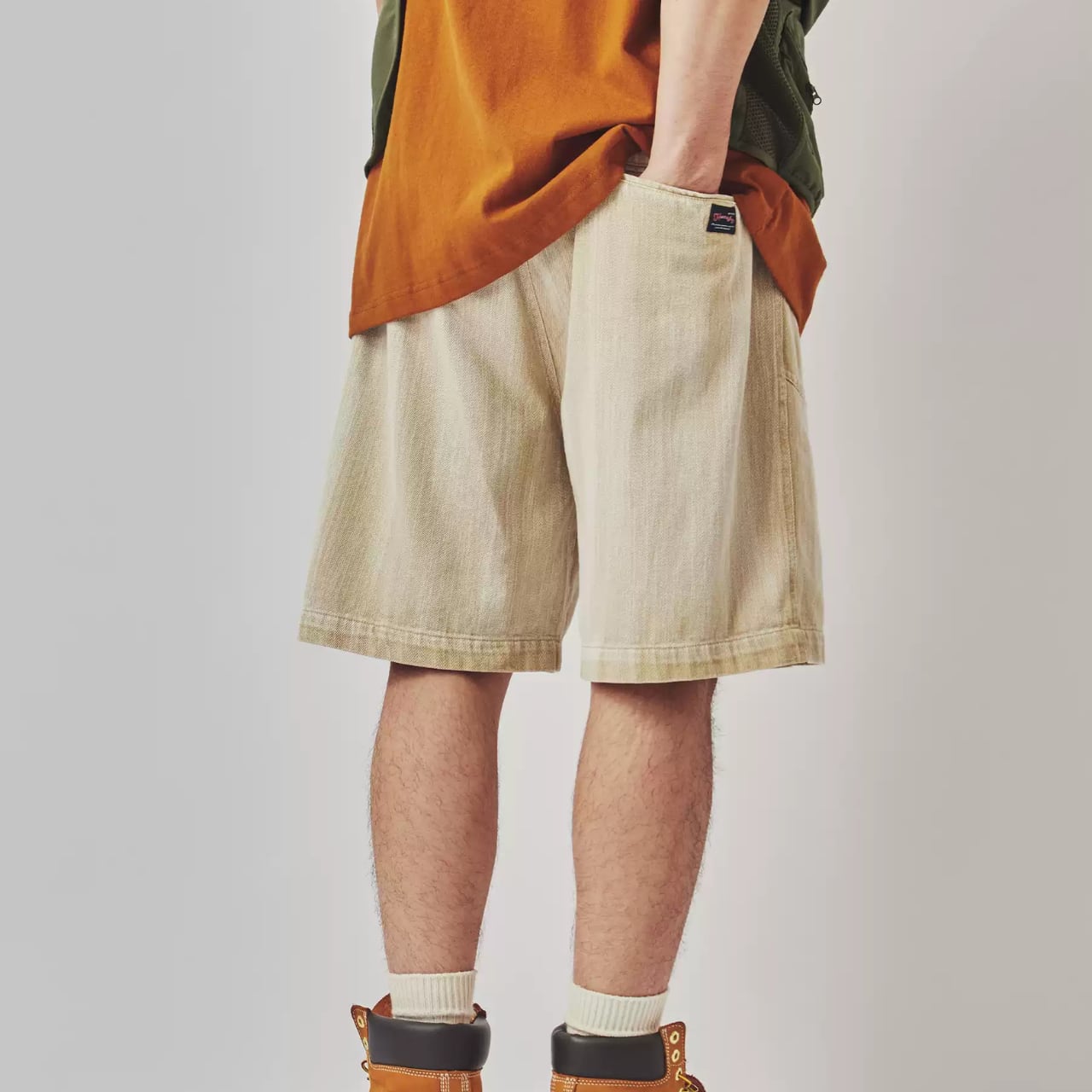 洗い加工を施したベージュトーンのデニムショーツ。太めのシルエットと斜めにデザインされたフロントポケットが特徴。ワーク感のあるディテールながらもナチュラルなカラーで、Tシャツやワークブーツとの相性も抜群。カジュアルからアウトドアスタイルまで幅広く活躍します。
