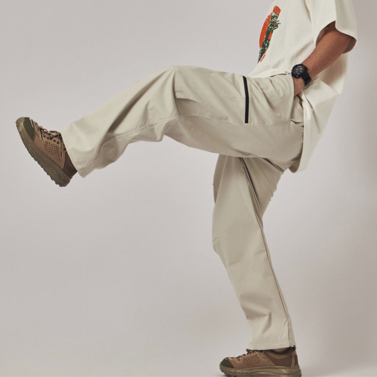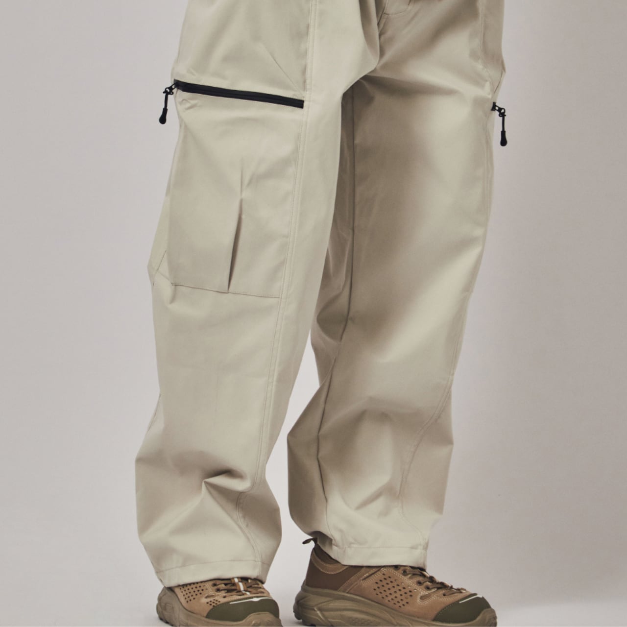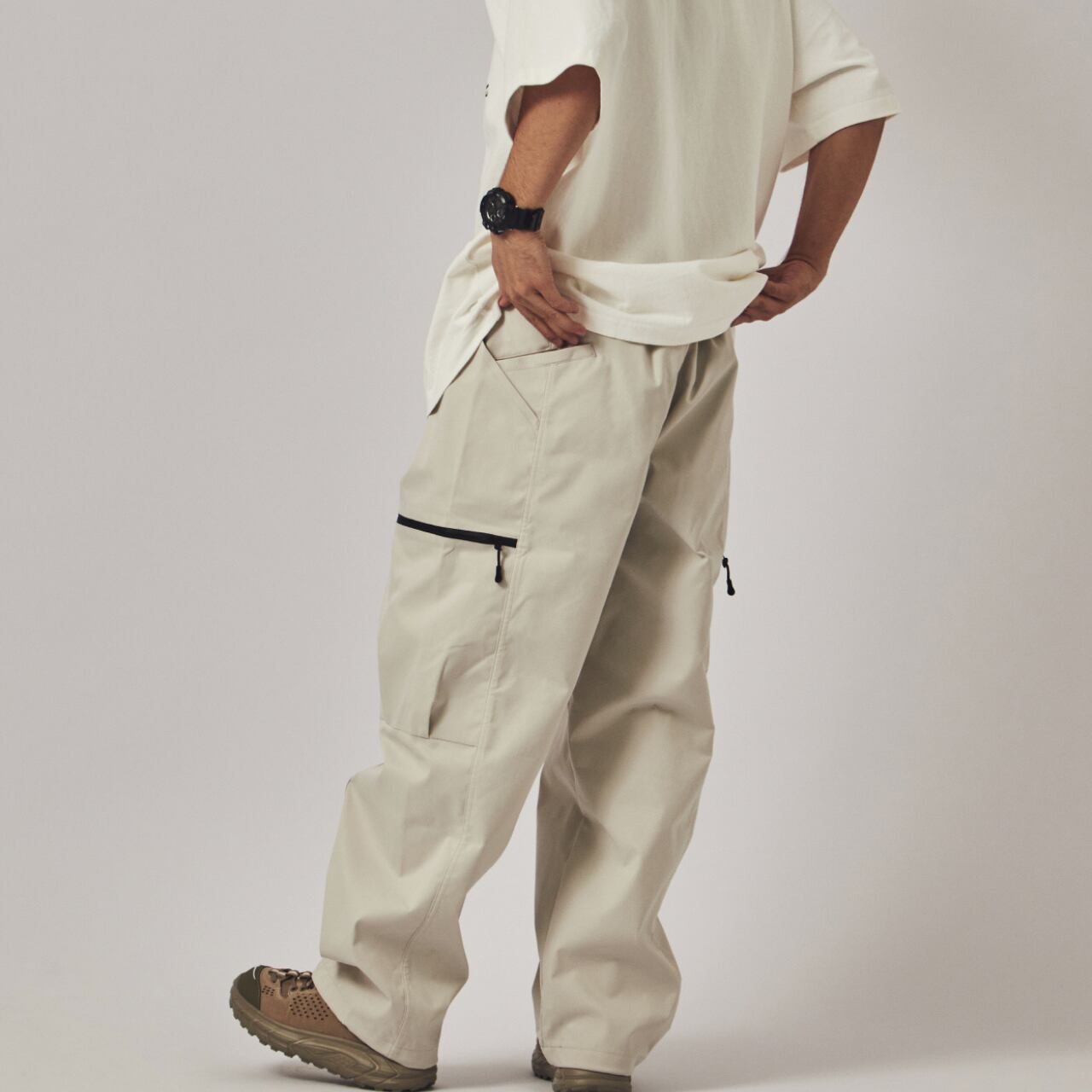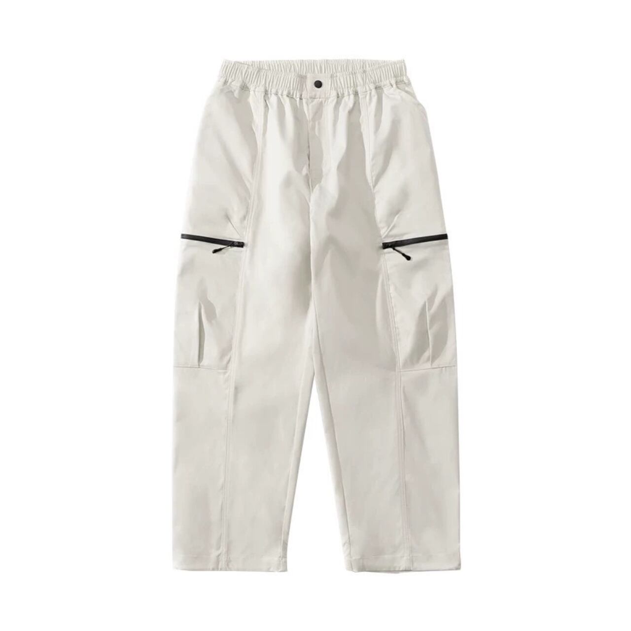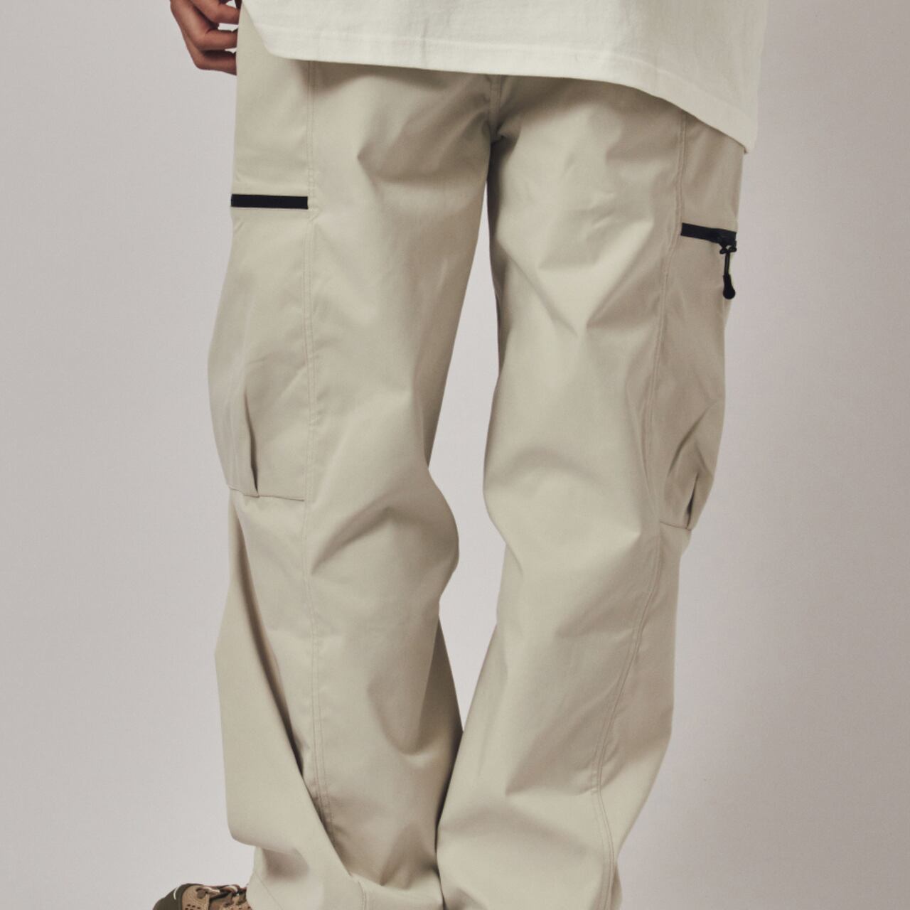 快適な着心地のイージーパンツ。サイドにファスナー付きのカーゴポケットを配置し、機能性とデザイン性を両立。軽量で耐久性のある素材を使用し、アウトドアやカジュアルな普段着に最適。