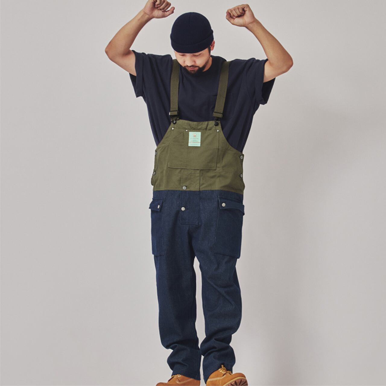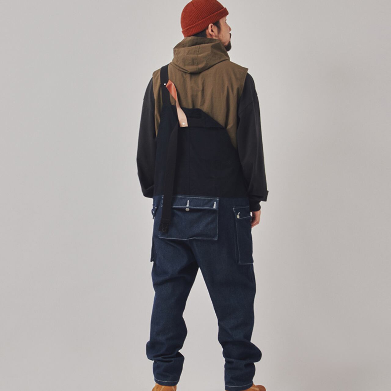 ワークウェアとアウトドアテイストを融合させたフィッシングオーバーオール。ハリ感のあるデニムと切り替えデザインが特徴。フロントの収納力や、背中のレザーループなど、実用性とディテールを兼ね備えた一着。