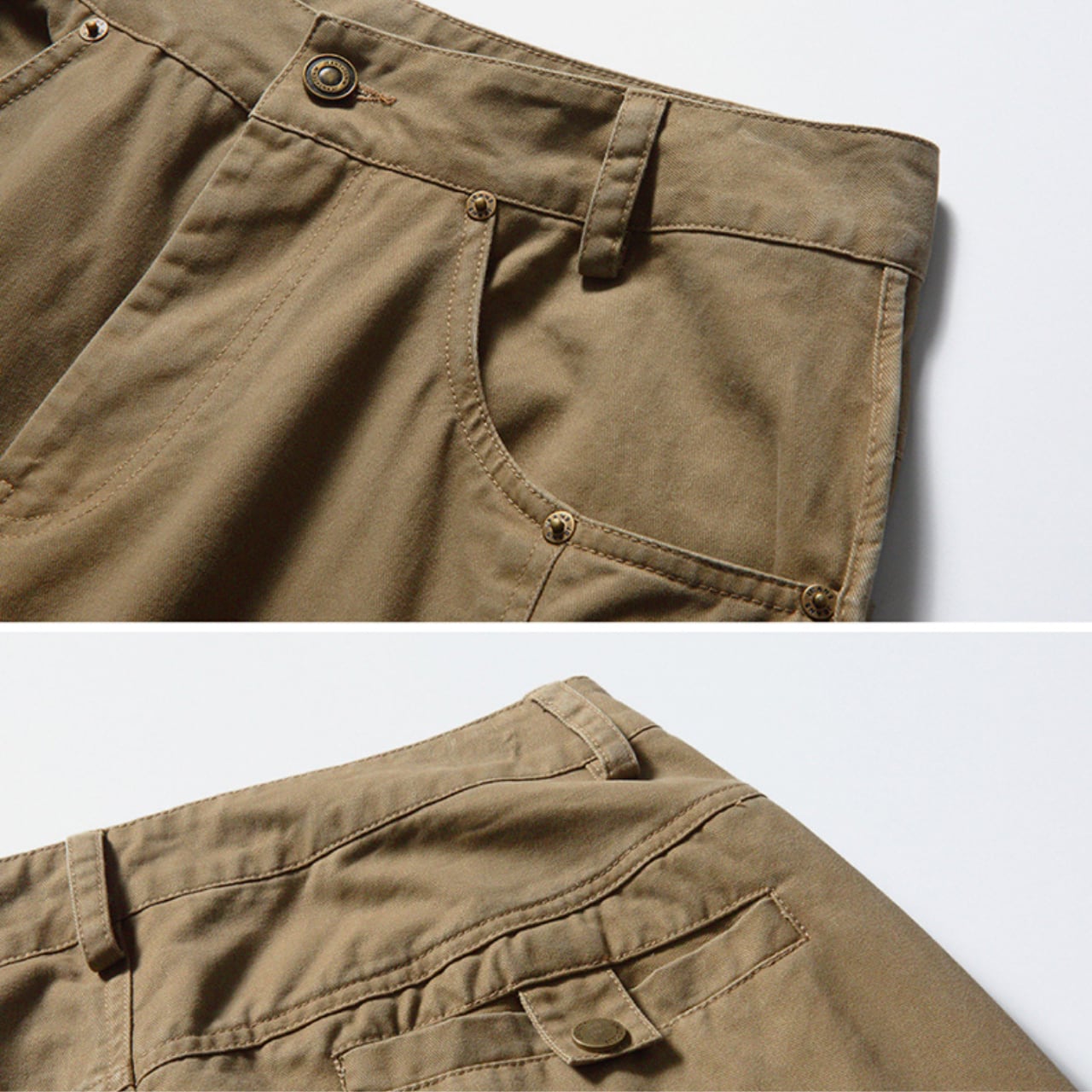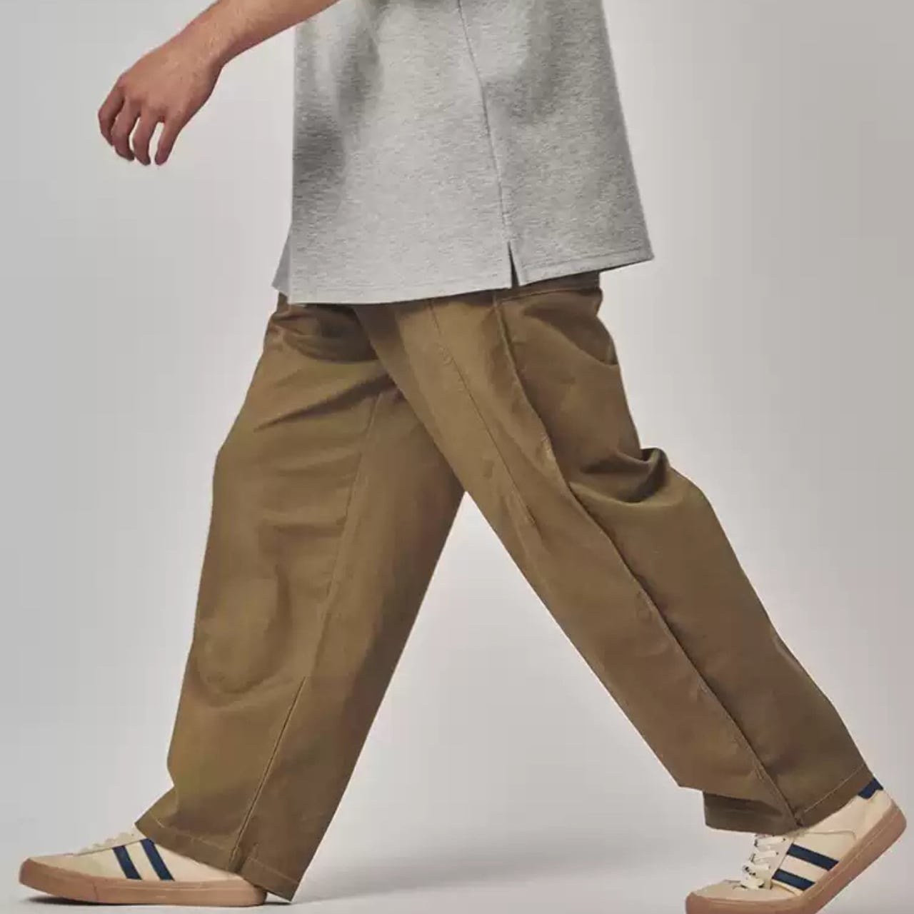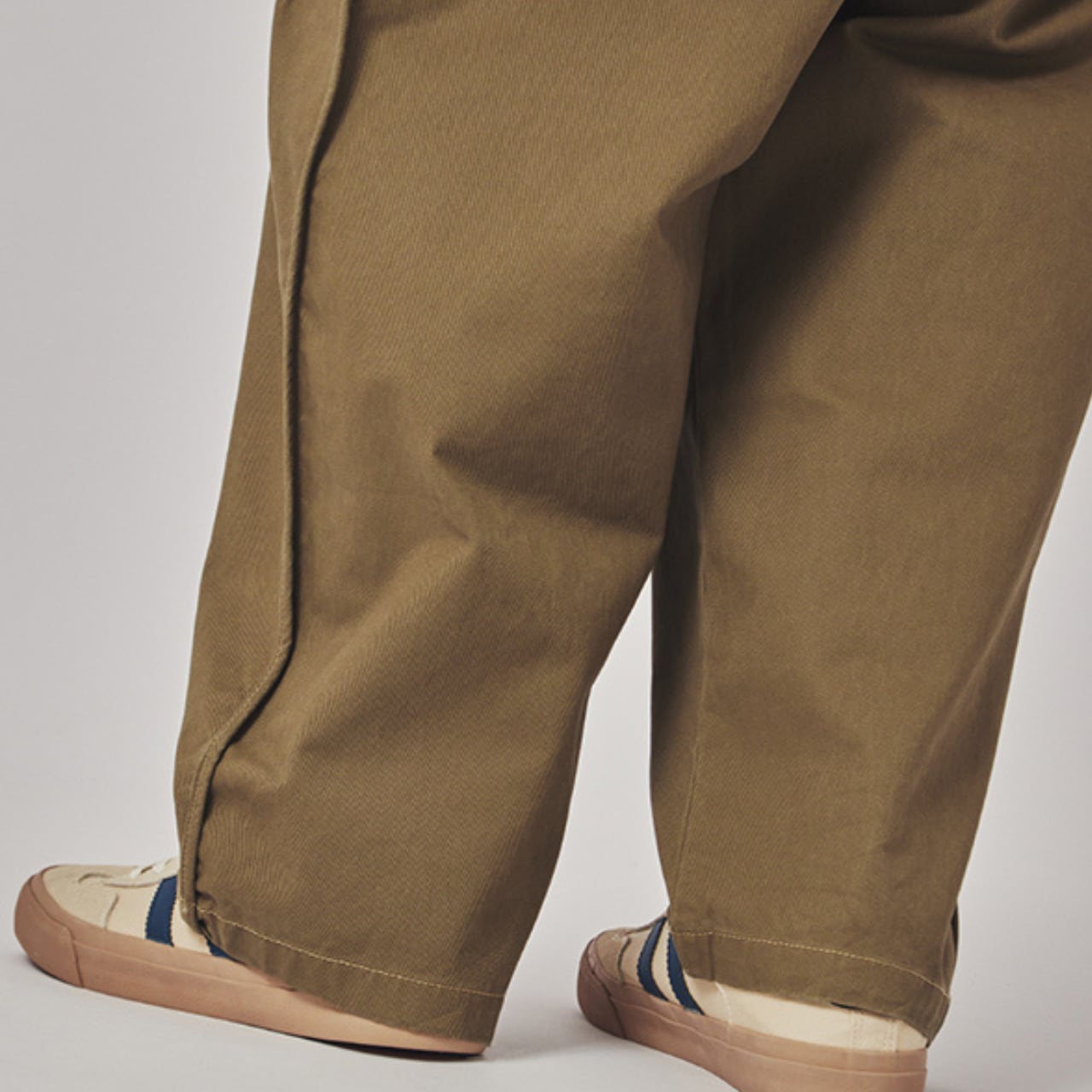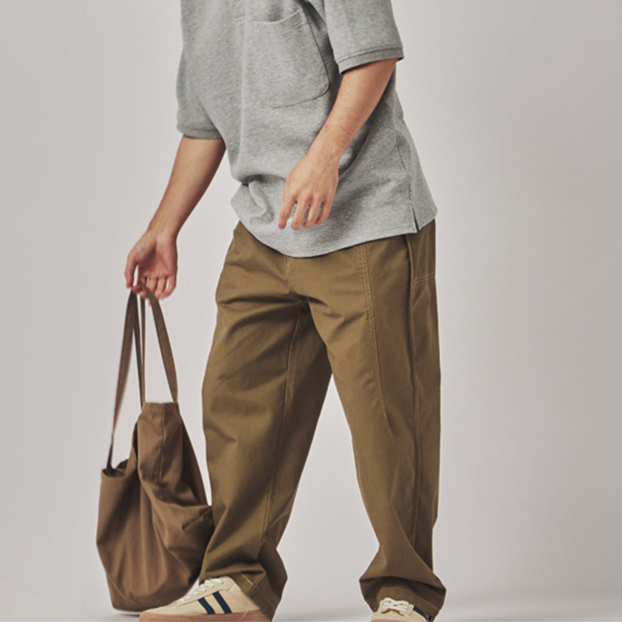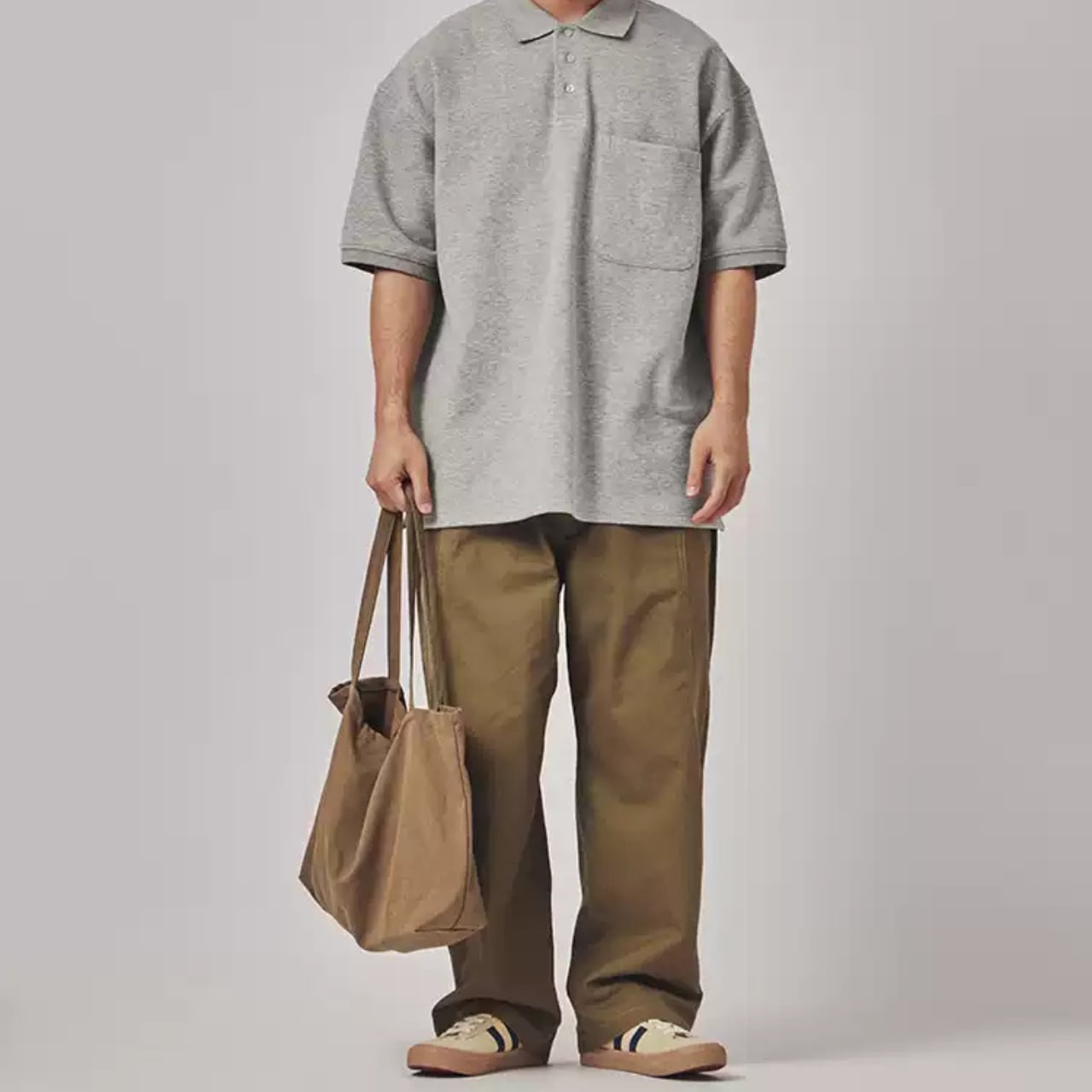 ゆったりとしたシルエットで快適な着心地を実現し、カジュアルなポロシャツやスニーカーとの相性が良い。後ろ姿や歩行時の自然な動きも捉えた多角的なビジュアル。