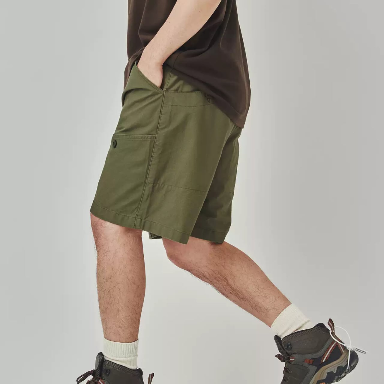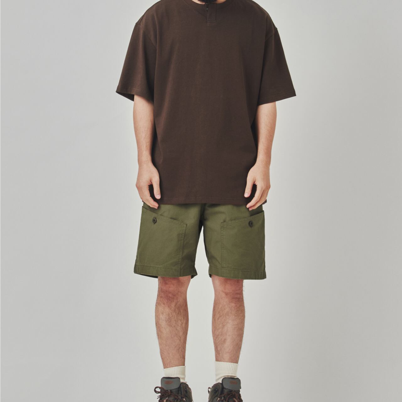 機能性とデザイン性を兼ね備えたマルチポケット付きのワークショーツ。やや厚手のコットン素材で、アウトドアからタウンユースまで幅広く対応。ボタン付きの斜め配置フラップポケットが特徴で、アクセントと実用性を両立。