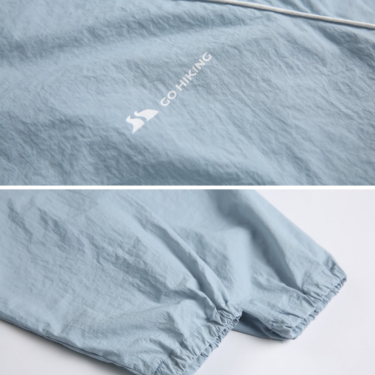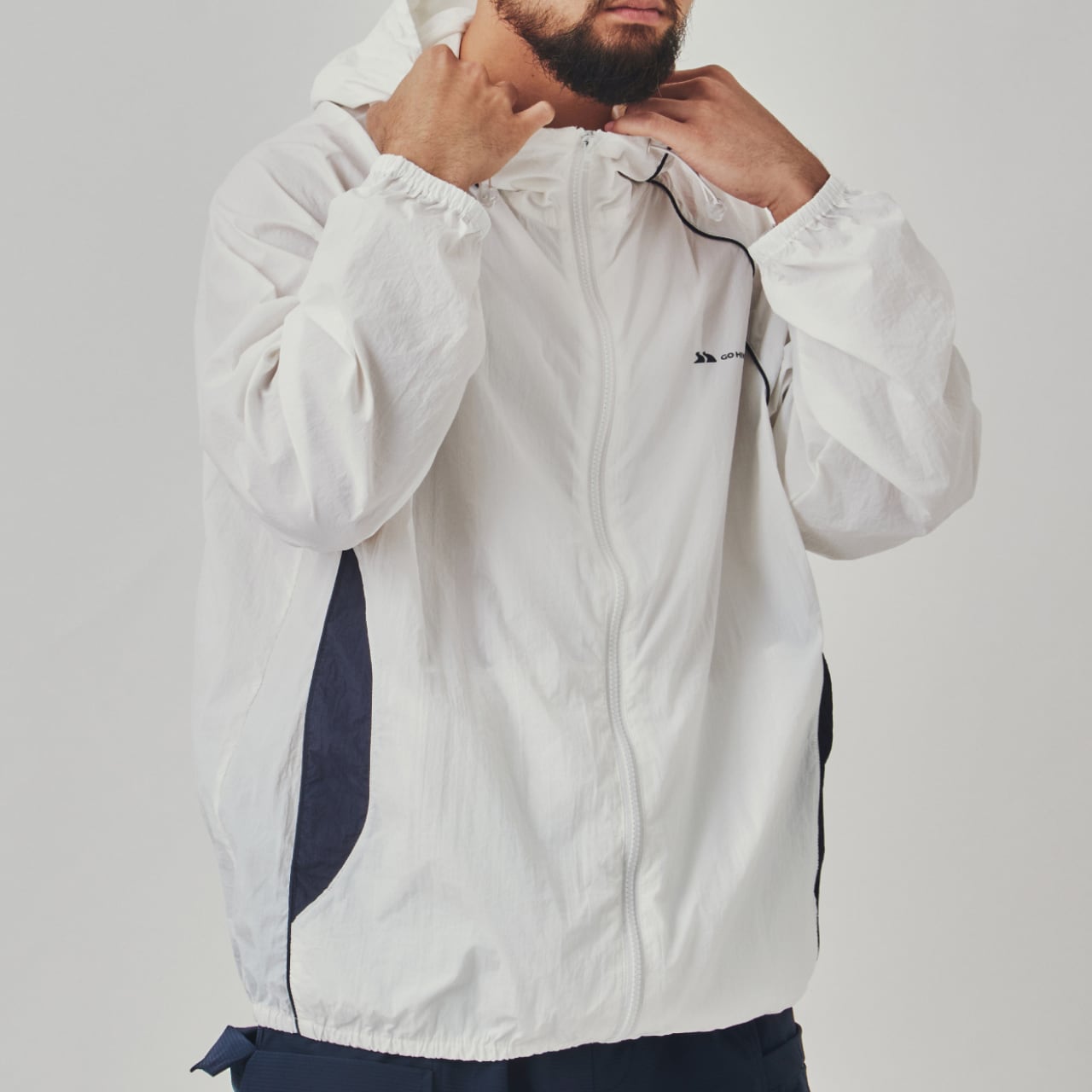 軽量で通気性のあるナイロン素材を使用したフーディジャケット。