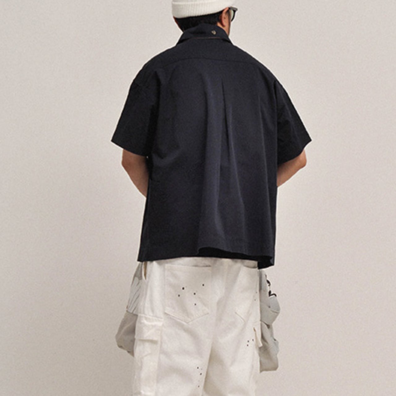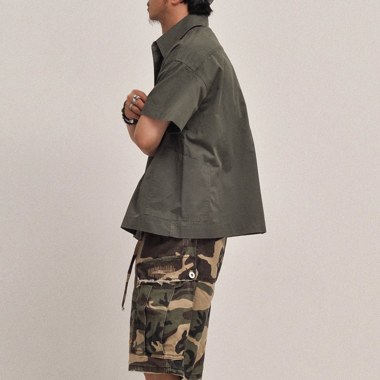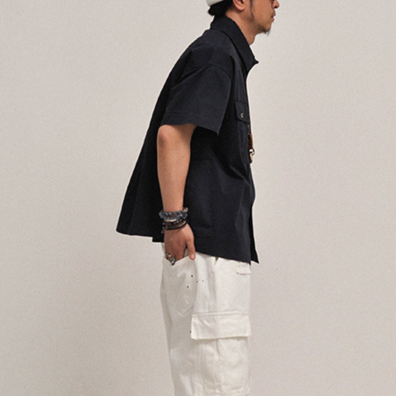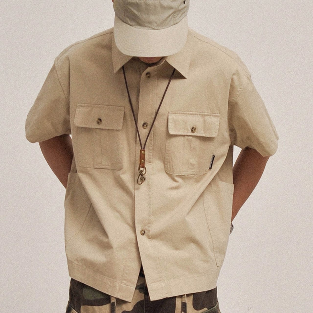 ショート丈のボックスシルエットと、両胸のフラップポケットが特徴のワークテイストシャツ。ナチュラルな色味とやや硬めのコットン素材が、ミリタリーやアウトドアスタイルにぴったり。カーゴパンツやワイドショーツとの相性も抜群です。