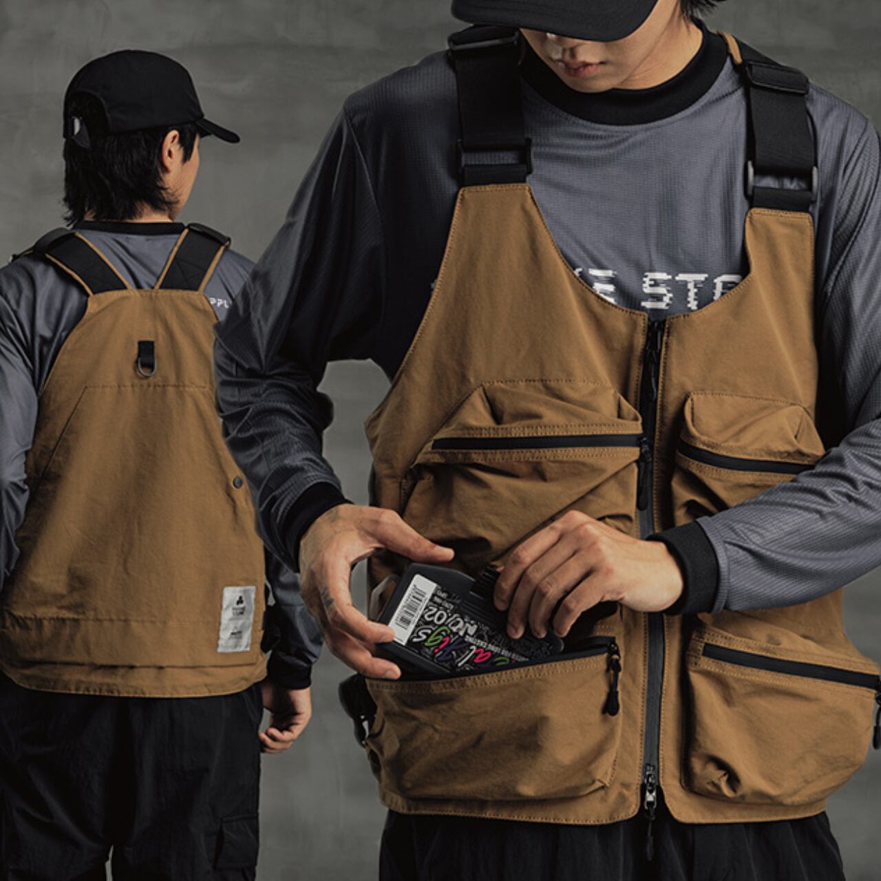 防潑水加工を施した高密度ナイロン素材を使用し、小雨や釣りの水しぶきも気にせず着用可能。調節可能なショルダーストラップで、快適なフィット感を実現。前後合わせて複数の大型ポケットを配置し、ギアや小物を収納可能。背面には斜め開口ポケットやマルチハンギングループ、反射タグを備え、安全性と機能性を両立した一着です。