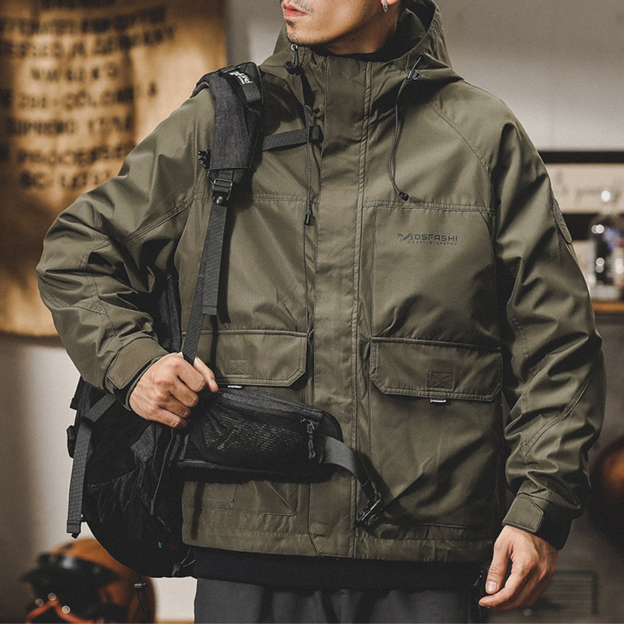 フロントには大容量のフラップポケットを搭載し、スマホや財布、グローブなどをラクラク収納。ドローコード付きのフードが冷たい風や小雨をしっかりガードします。
