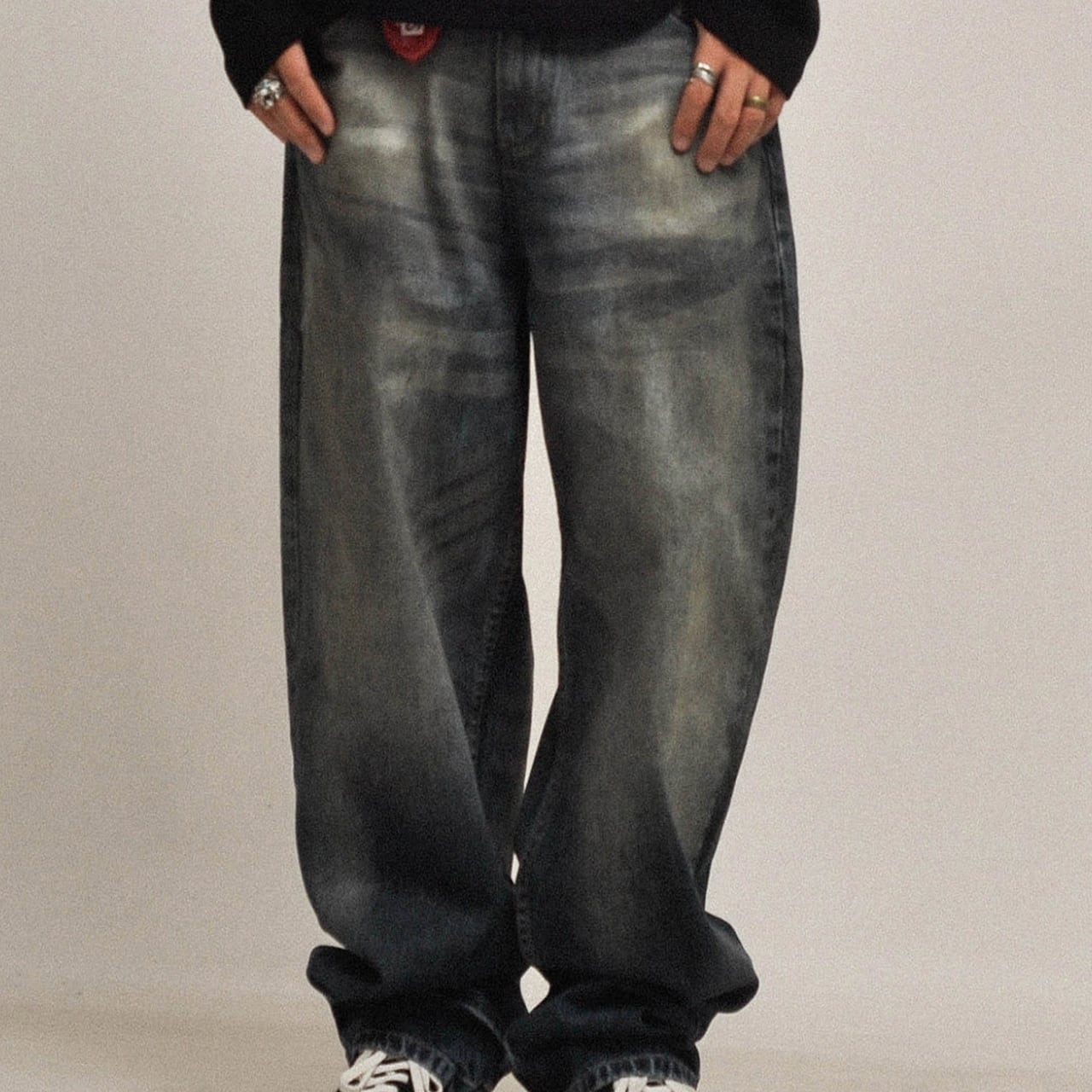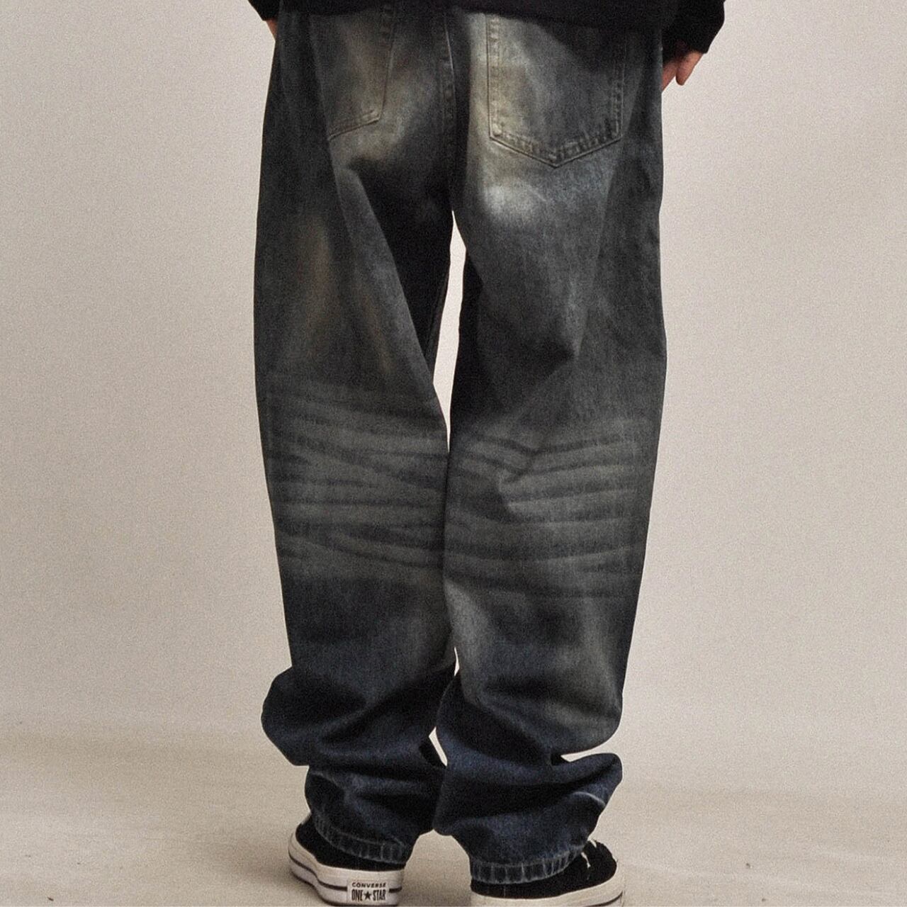 ヴィンテージ感漂う水洗いブルーデニムパンツ。ゆったりとしたシルエットで、ストリートからカジュアルまで幅広く活躍。経年変化を感じさせる色落ち加工が、大人の余裕と存在感を演出します。