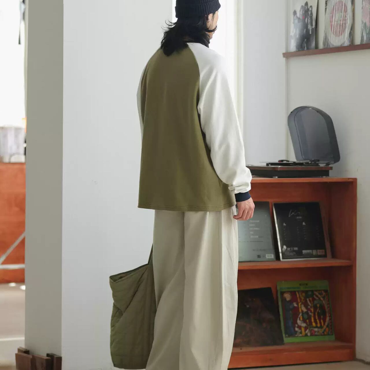 配色ラグランスリーブが目を引く。胸元にはユニークな立体ポケットデザインを施し、遊び心と実用性を兼ね備えています。