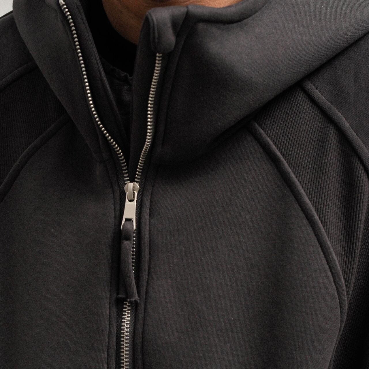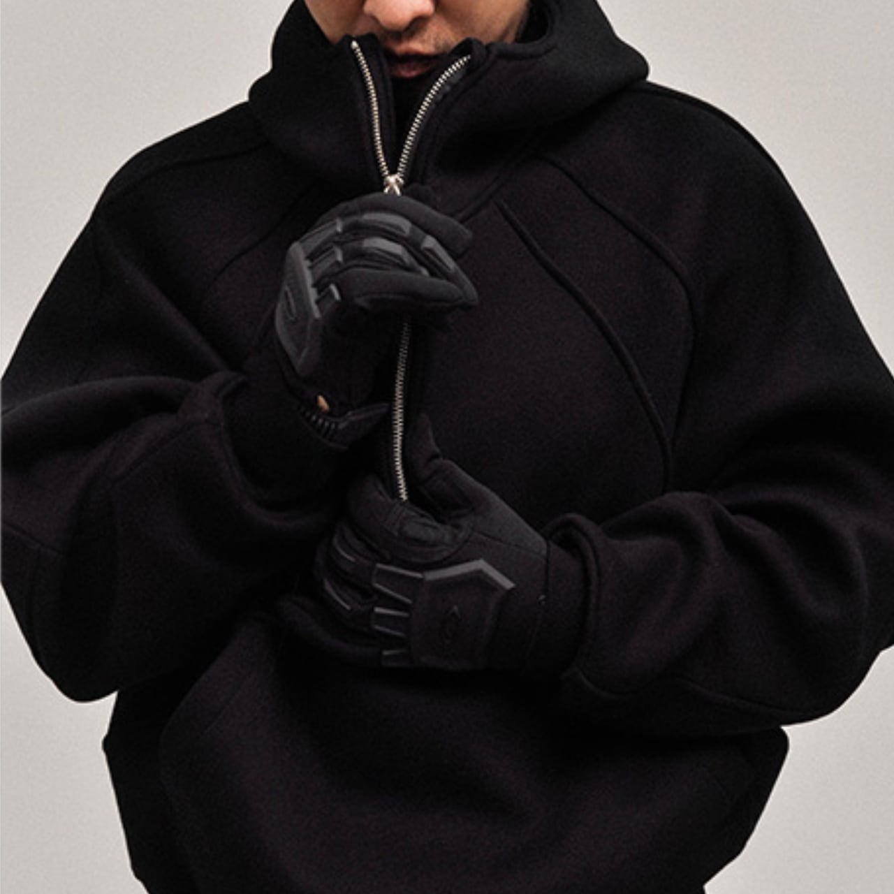 胸元のジップが着脱をスムーズにし、シンプルながら立体的なシルエットでストリートスタイルに映える一着です。