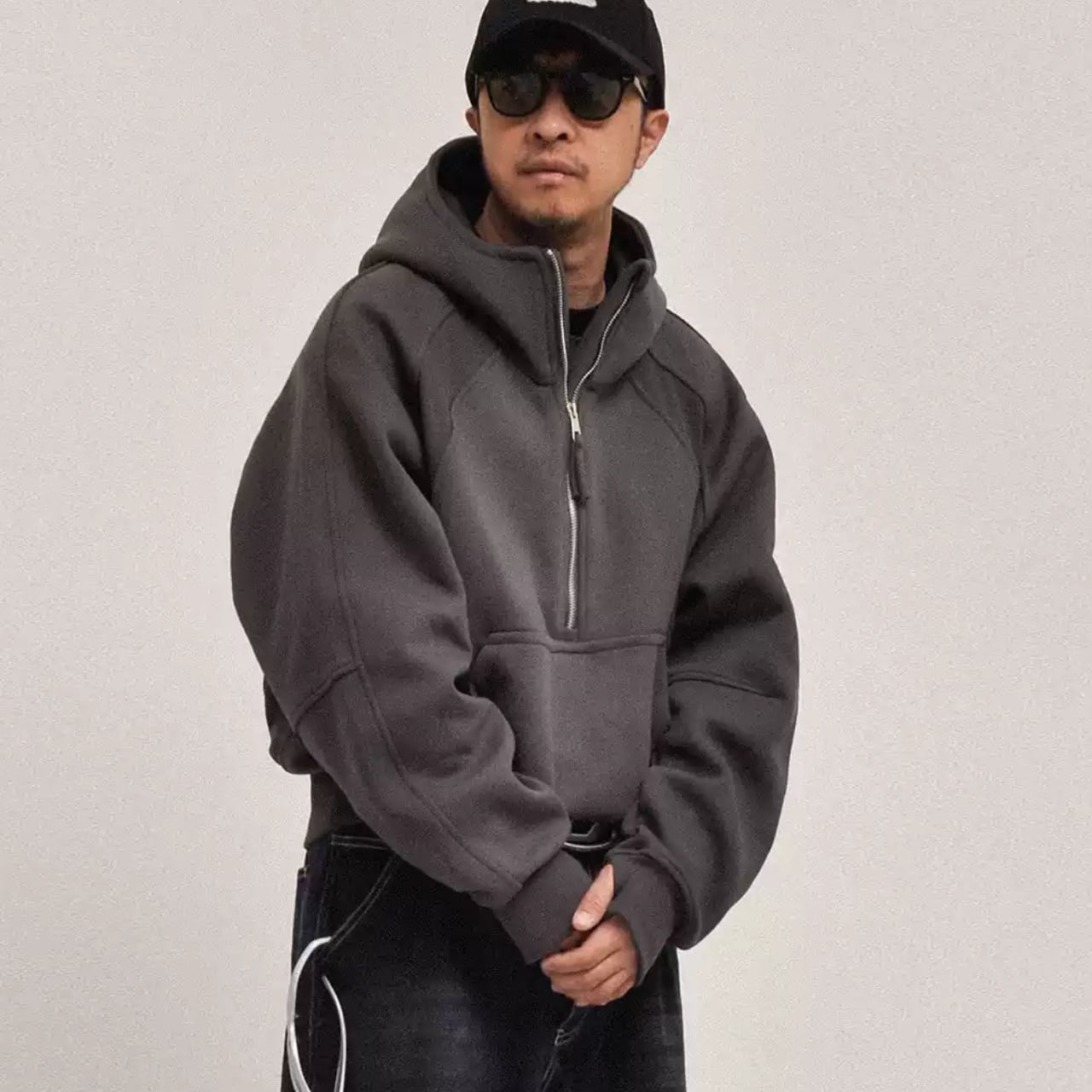 都会的な雰囲気を持ちながらもリラックス感のあるハーフジップフーディ。
