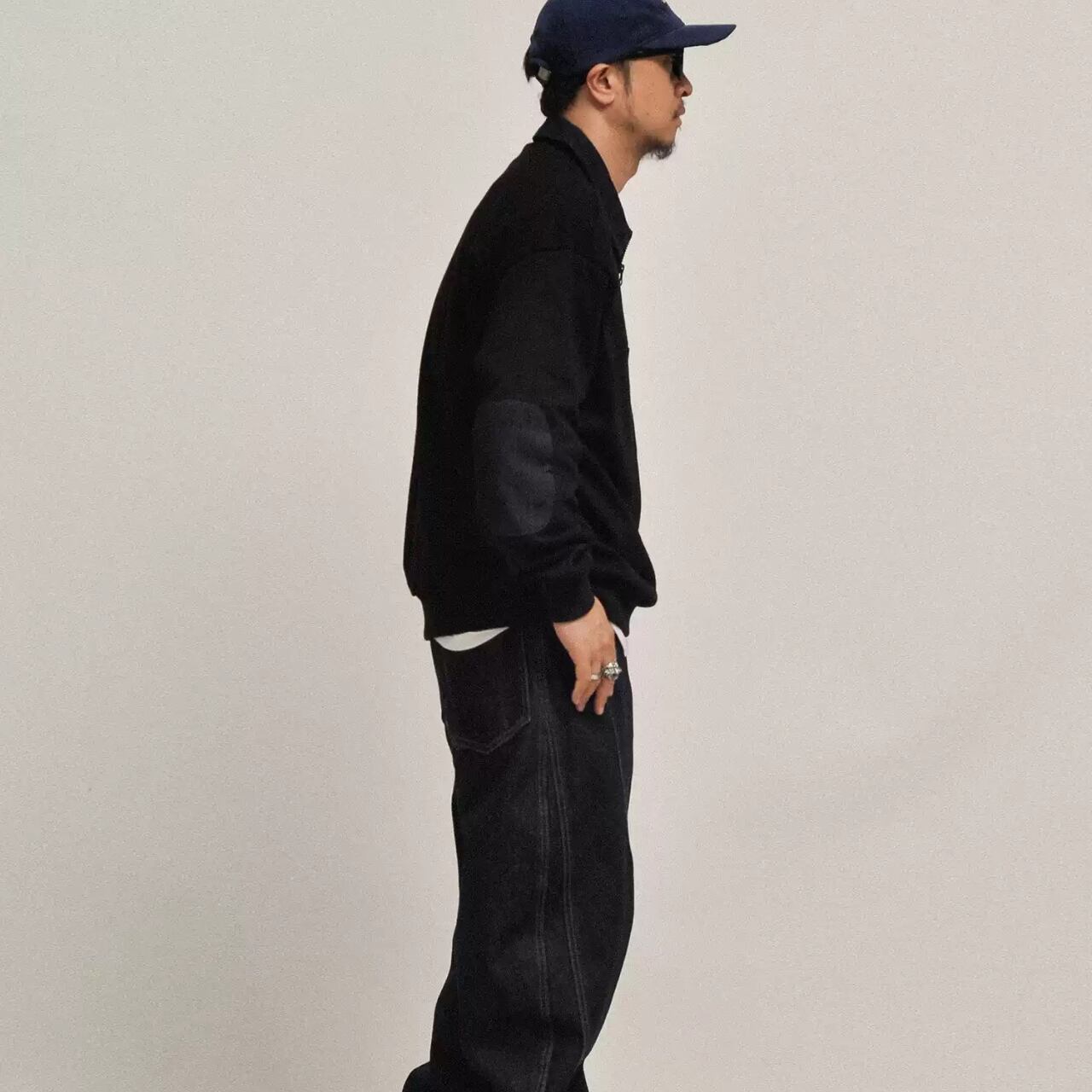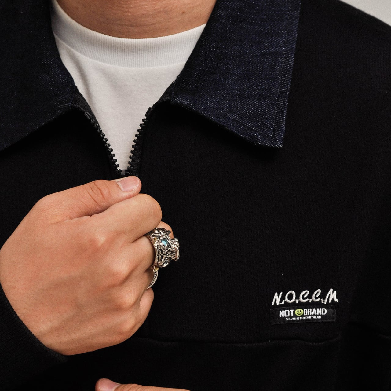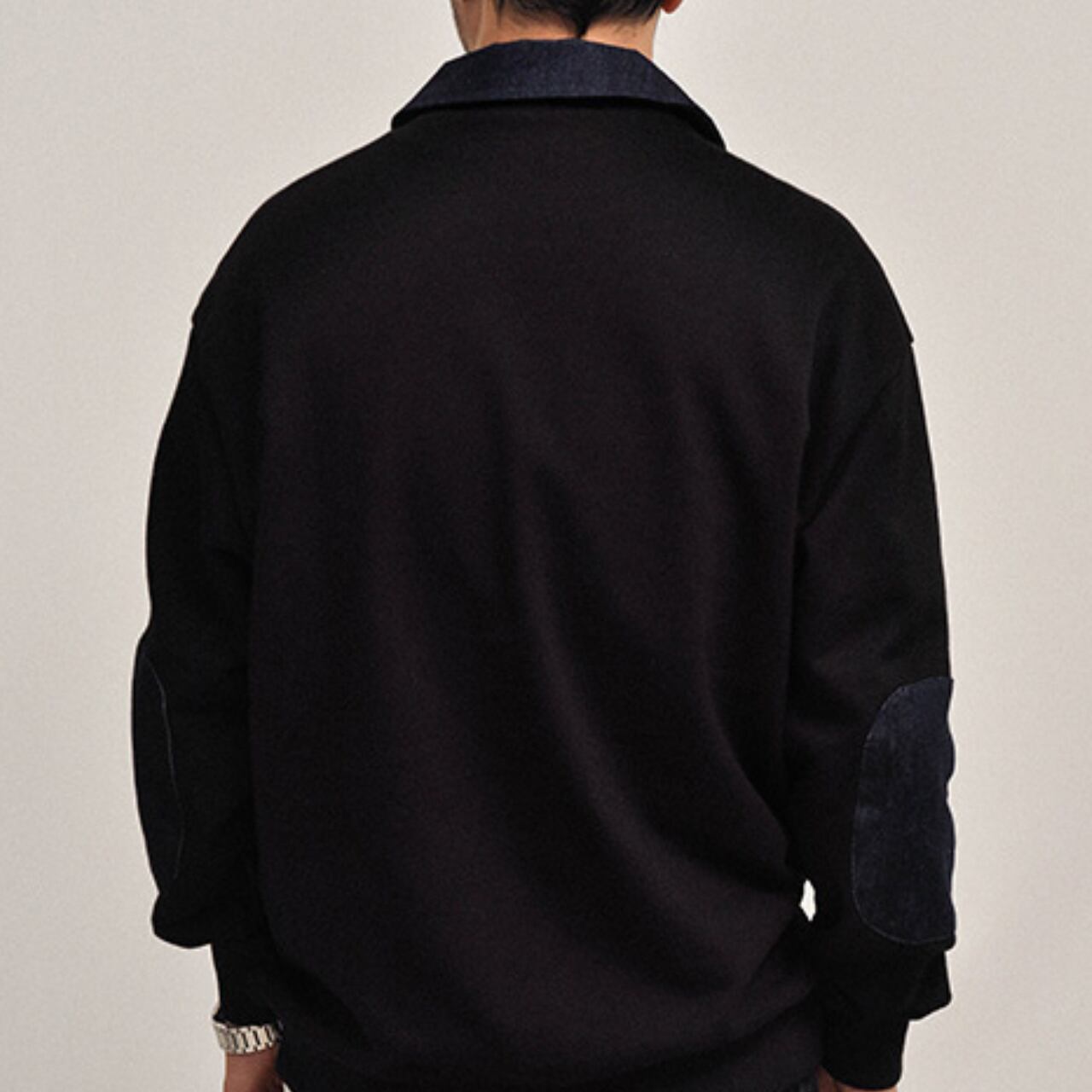 デニム素材の襟とエルボーパッチがアクセントになったスウェットプルオーバー。