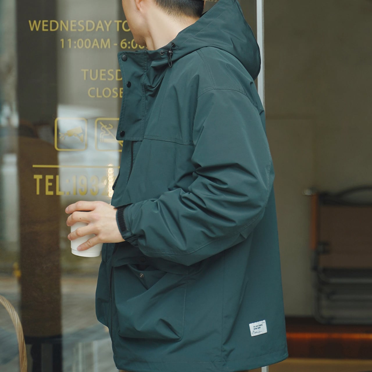 耐久性のある生地を使用したフード付きジャケット。胸ポケット・大型フロントポケット・ジッパーポケットなど多機能な収納を備え、街でもアウトドアでも使いやすいデザイン。ゆったりとしたシルエットで、カジュアルにもスポーティーにも合わせやすい一着です。
