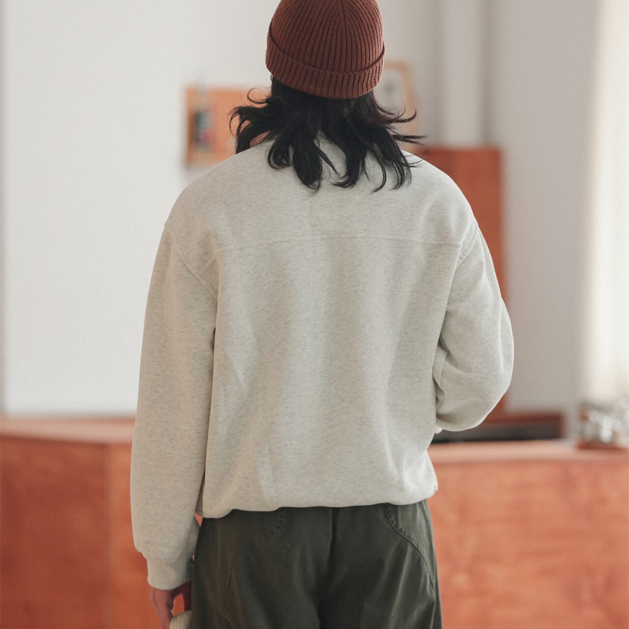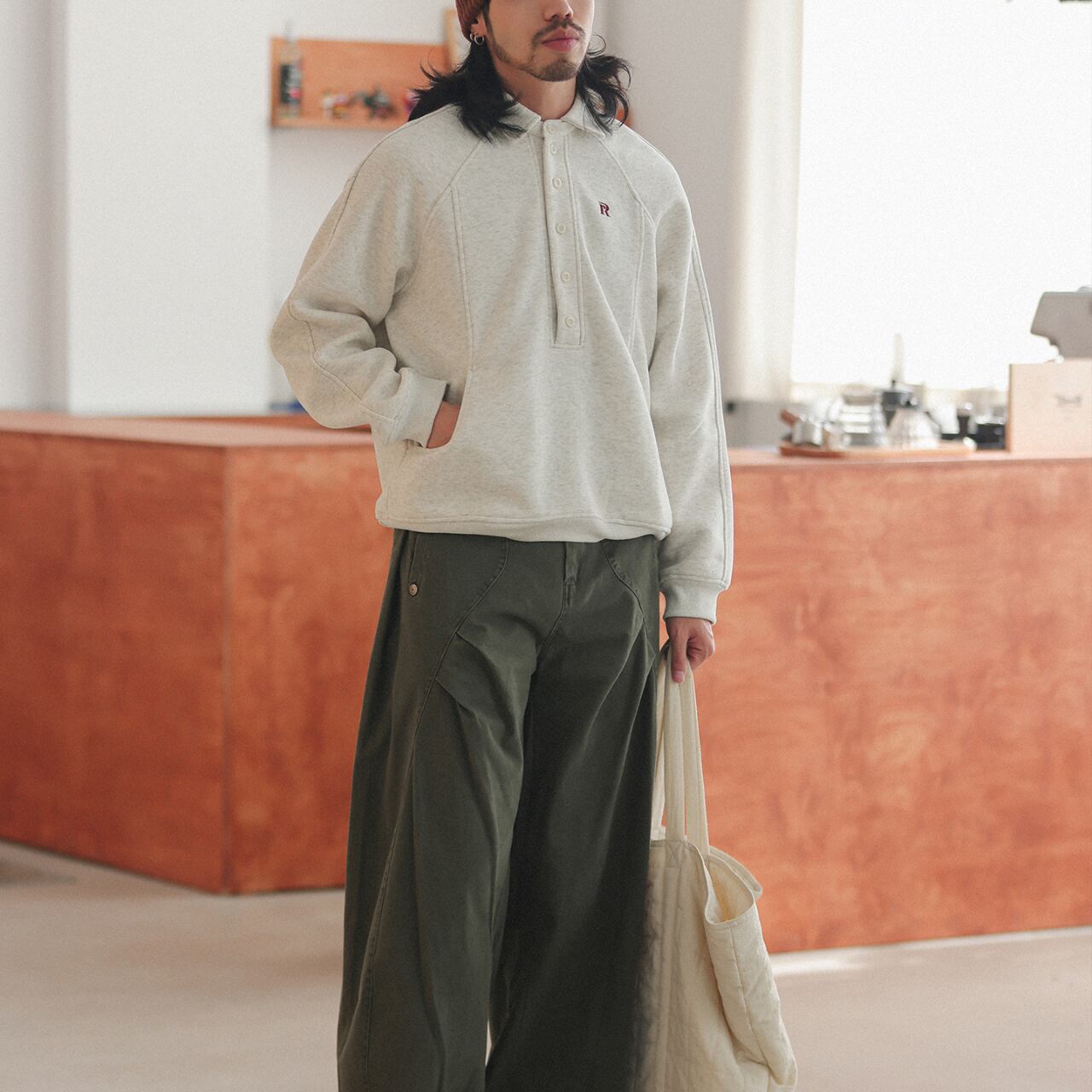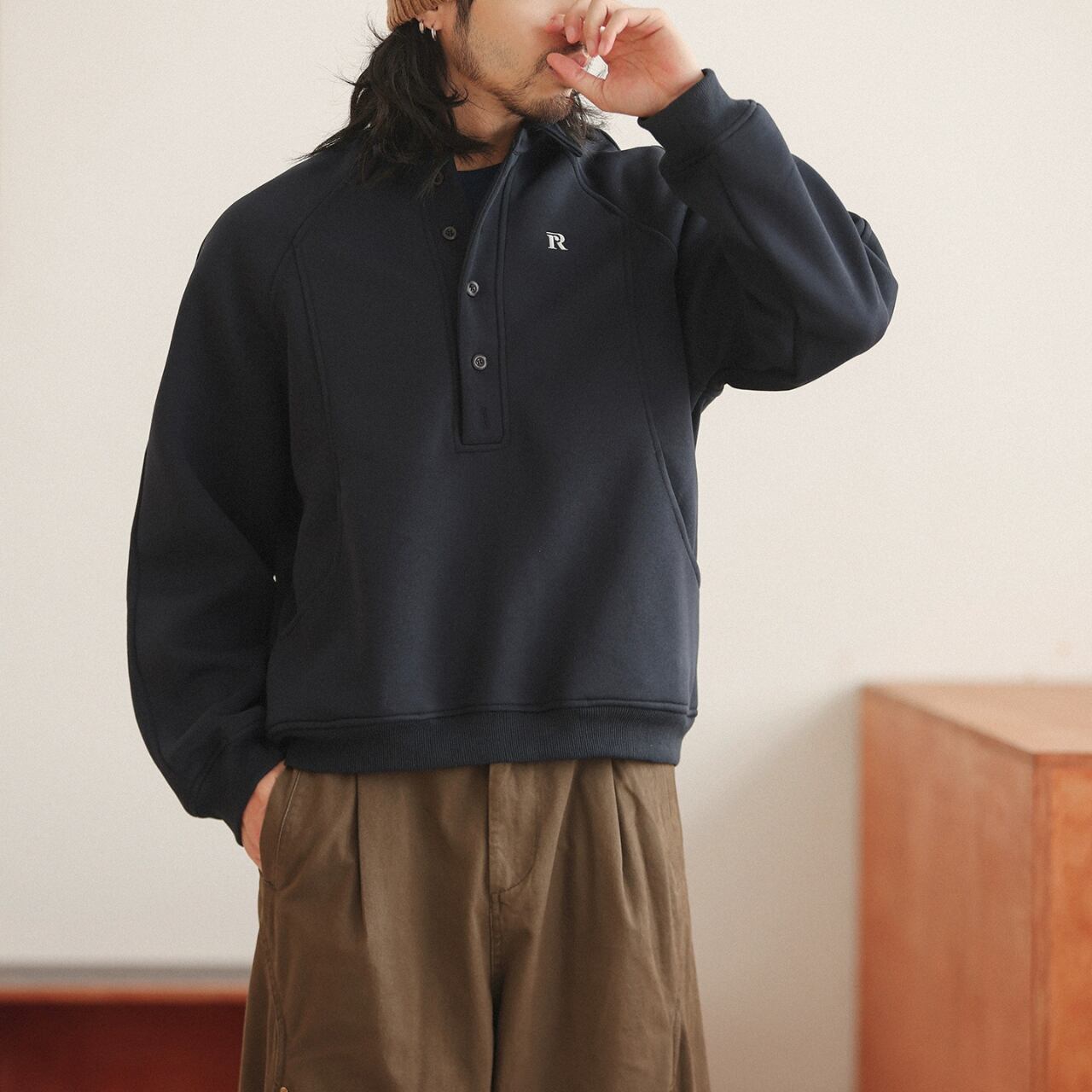 胸元の「R」刺繍がワンポイントのヘンリーネックスウェット。程よい厚みのあるコットン×ポリエステル素材で、柔らかさと耐久性を両立。襟付き×ボタンデザインでカジュアルながらも上品な印象に。ゆったりしたシルエットで、ストリートからデイリーコーデまで幅広く活躍します。