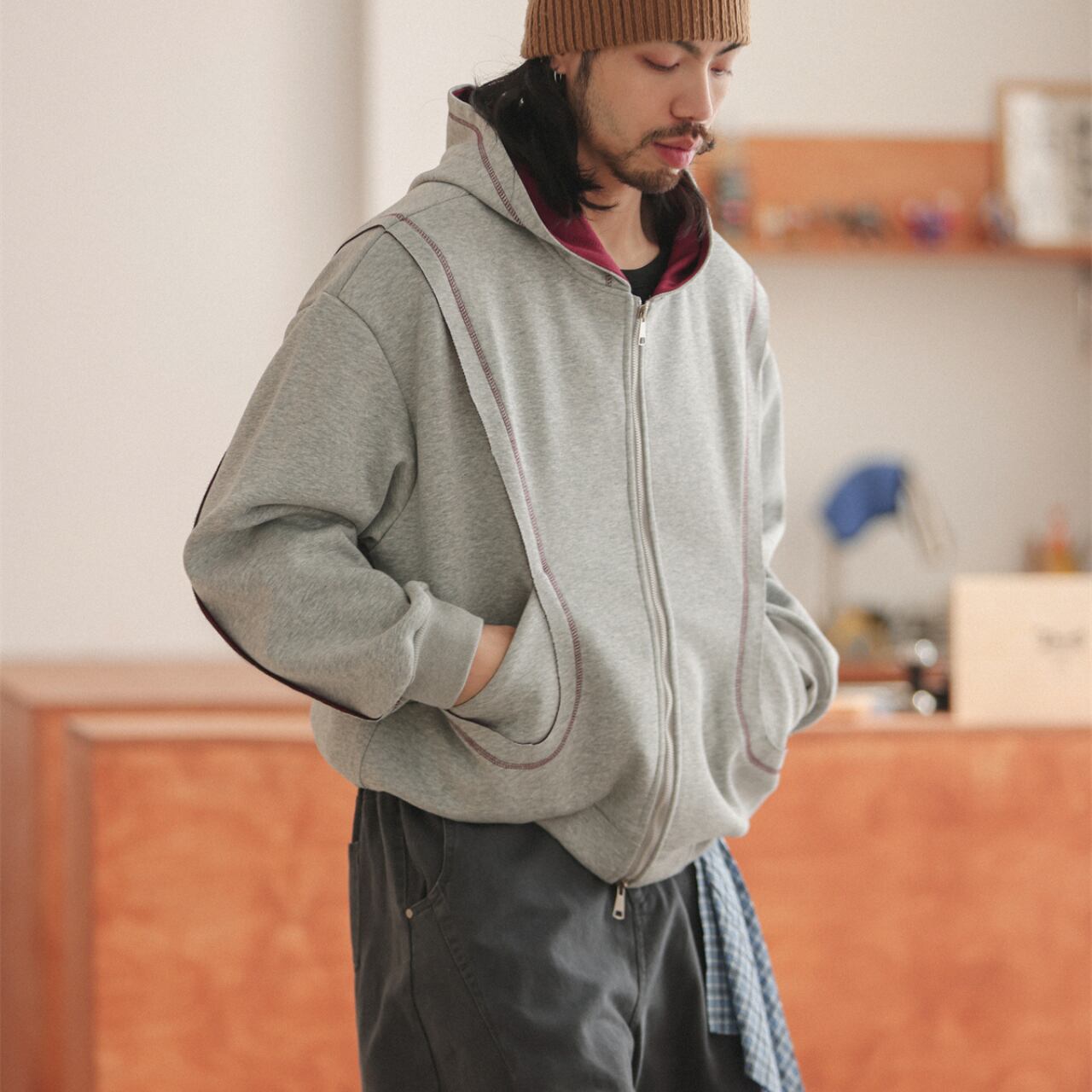 配色ステッチと立体的なポケットデザインが特徴のジップアップパーカー。フード内側の配色切り替えがアクセントになり、シンプルながら個性のある仕上がり。程よく厚みのあるコットン×ポリエステル素材で、デイリーからストリートまで幅広く活躍します。