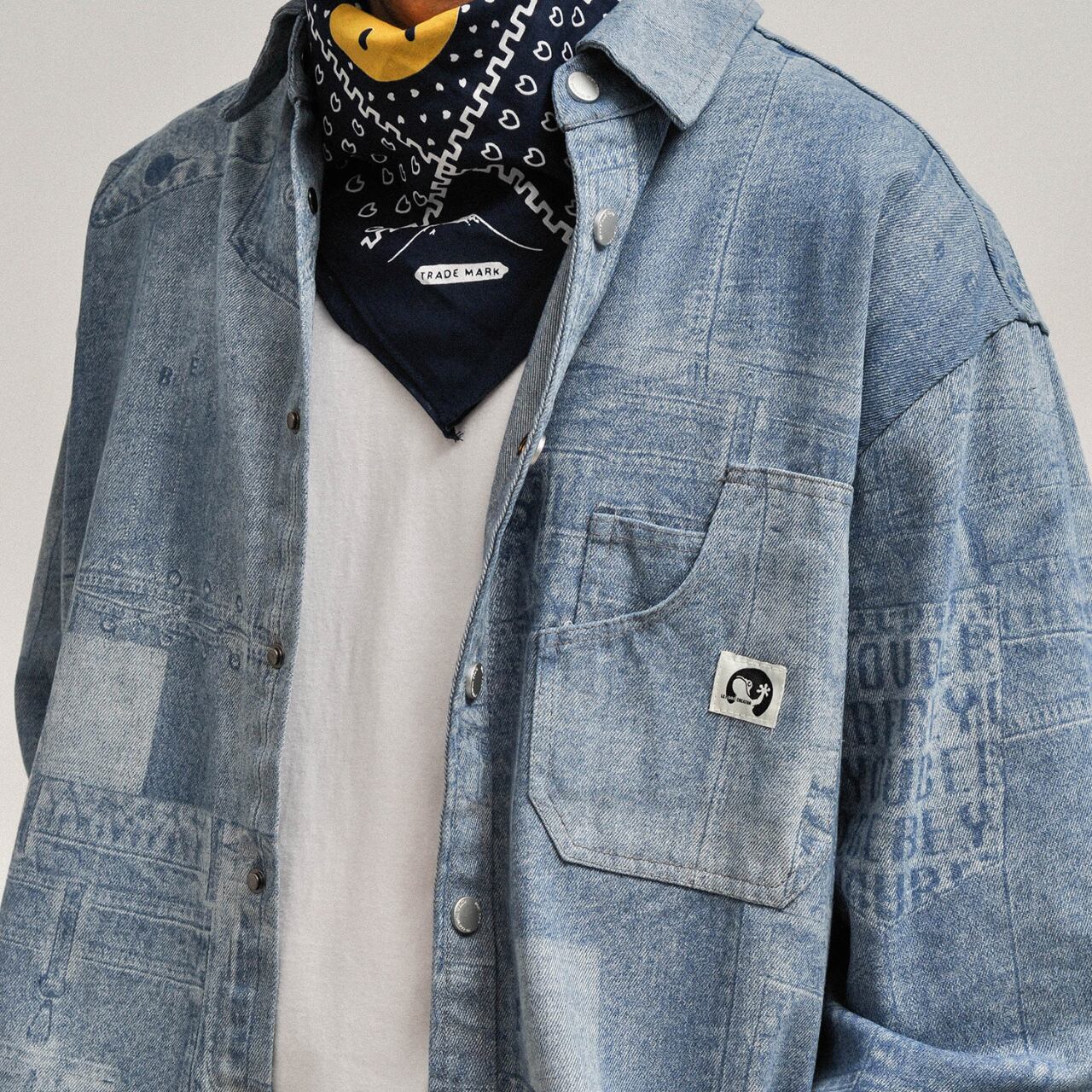独特のウォッシュ加工とプリント柄が魅力のデニムシャツ。ゆったりとしたシルエットで羽織りとしてもインナーとしても活躍します。ストリートスタイルにもヴィンテージ感を演出できる1着です。