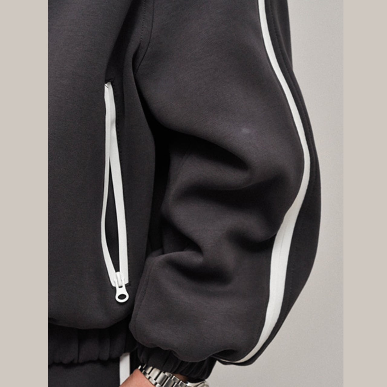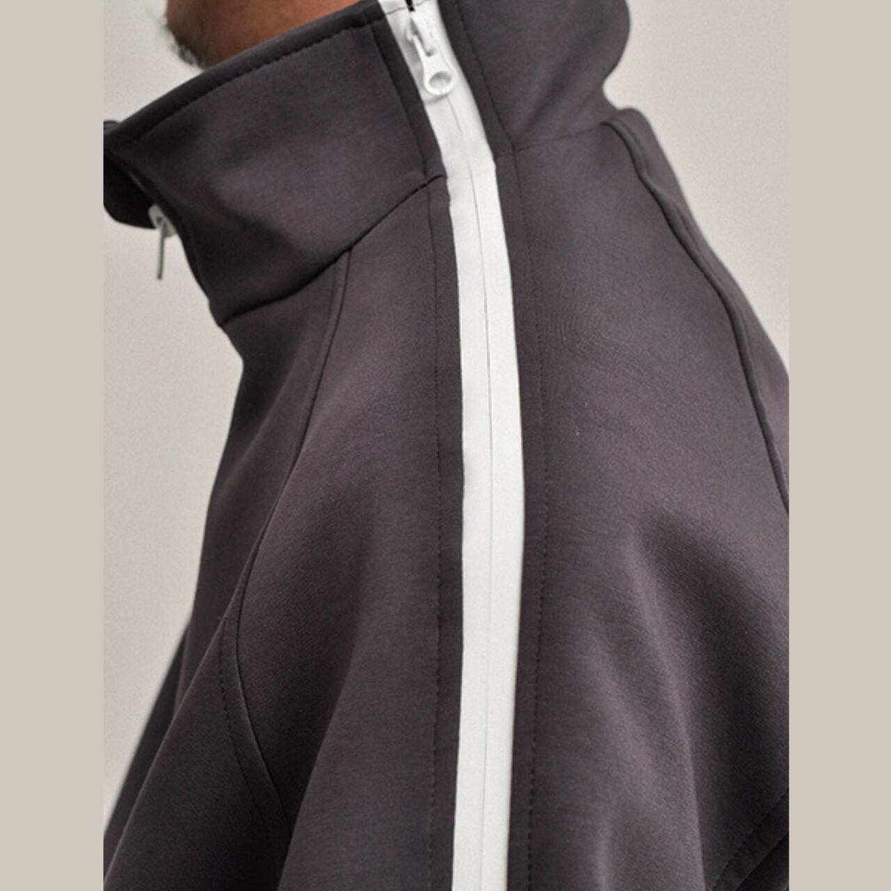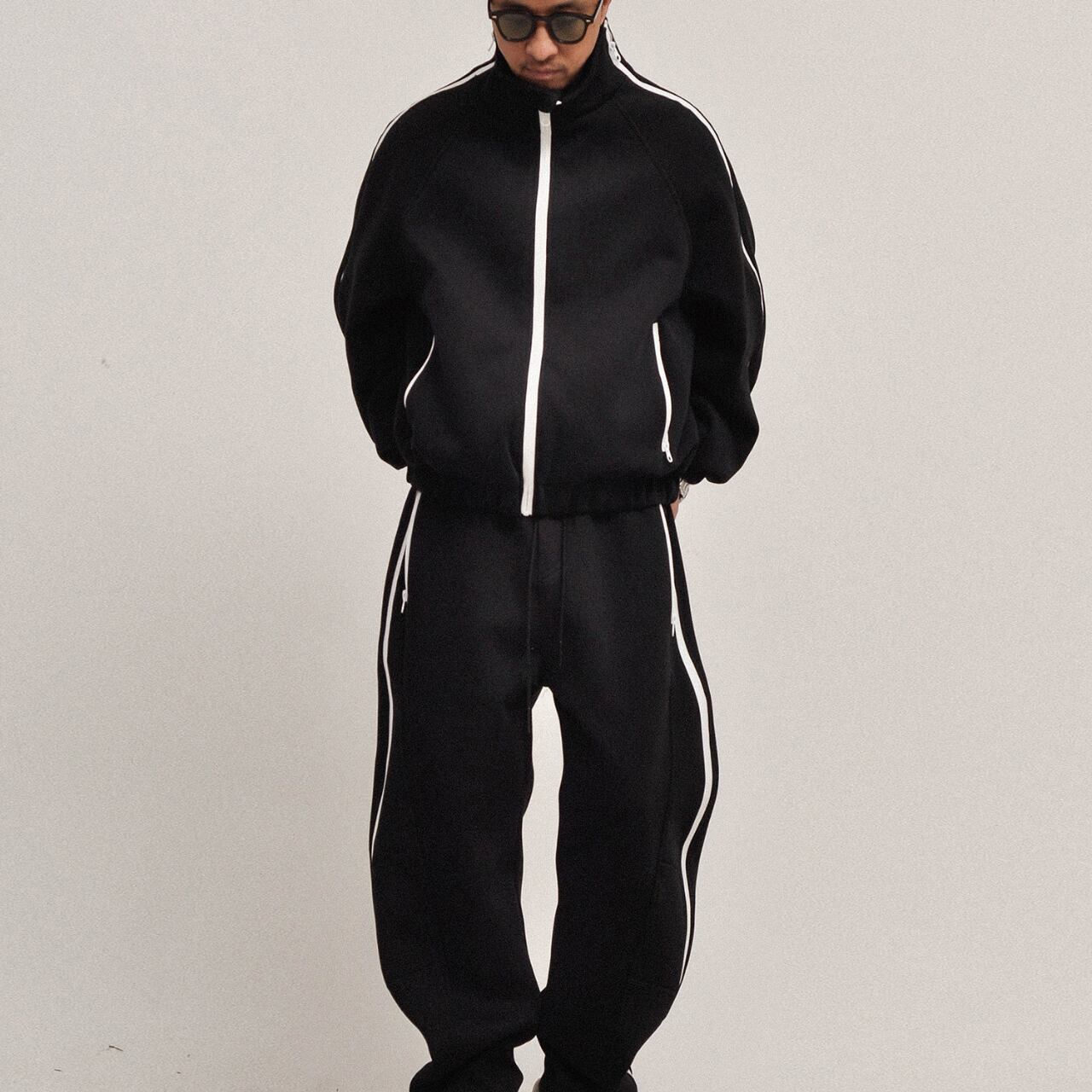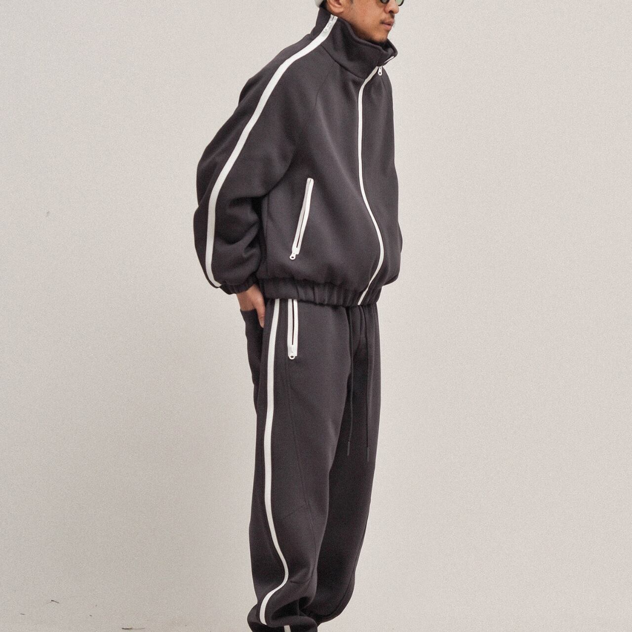 スポーティーなデザインのトラックジャケットとパンツのセットアップ。スタンドカラーとフロントジップ、バイカラーディテールが特徴で、ストリートからスポーツシーンまで幅広く着用可能。ゆったりとしたシルエットで動きやすさも抜群です。