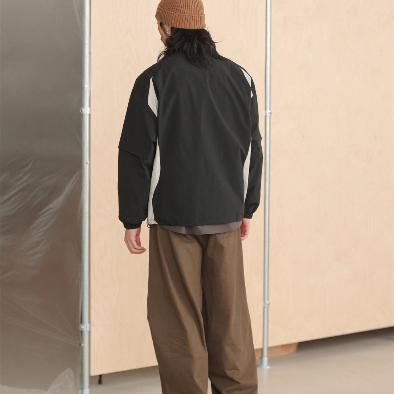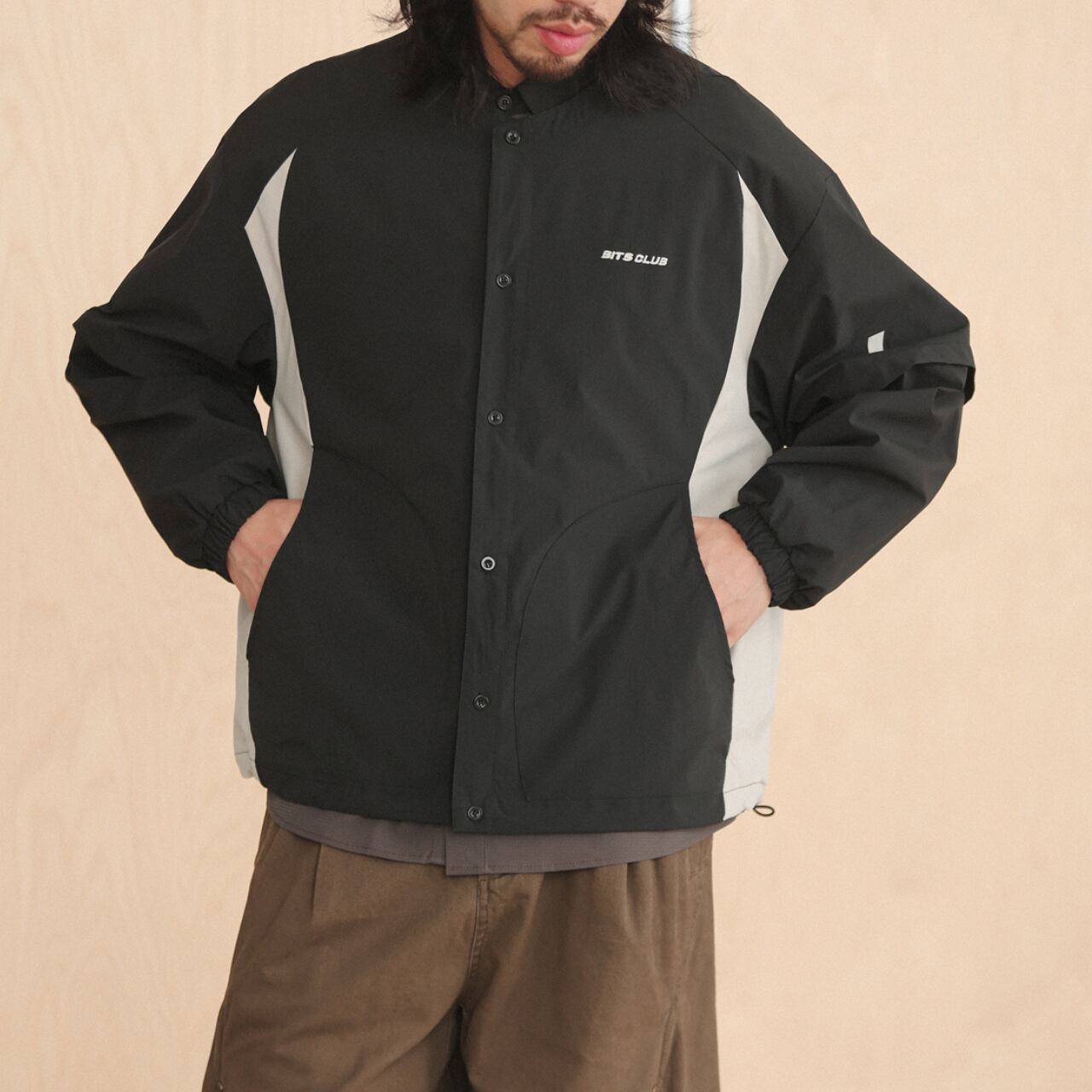 ノーカラーのシンプルなデザインに、両サイドの切り替えカラーが映えるライトジャケット。軽量なポリエステル素材でさらっと羽織れ、裾のドローコードでシルエット調整も可能。ストリートにもアウトドアにも活躍する万能アイテムです。