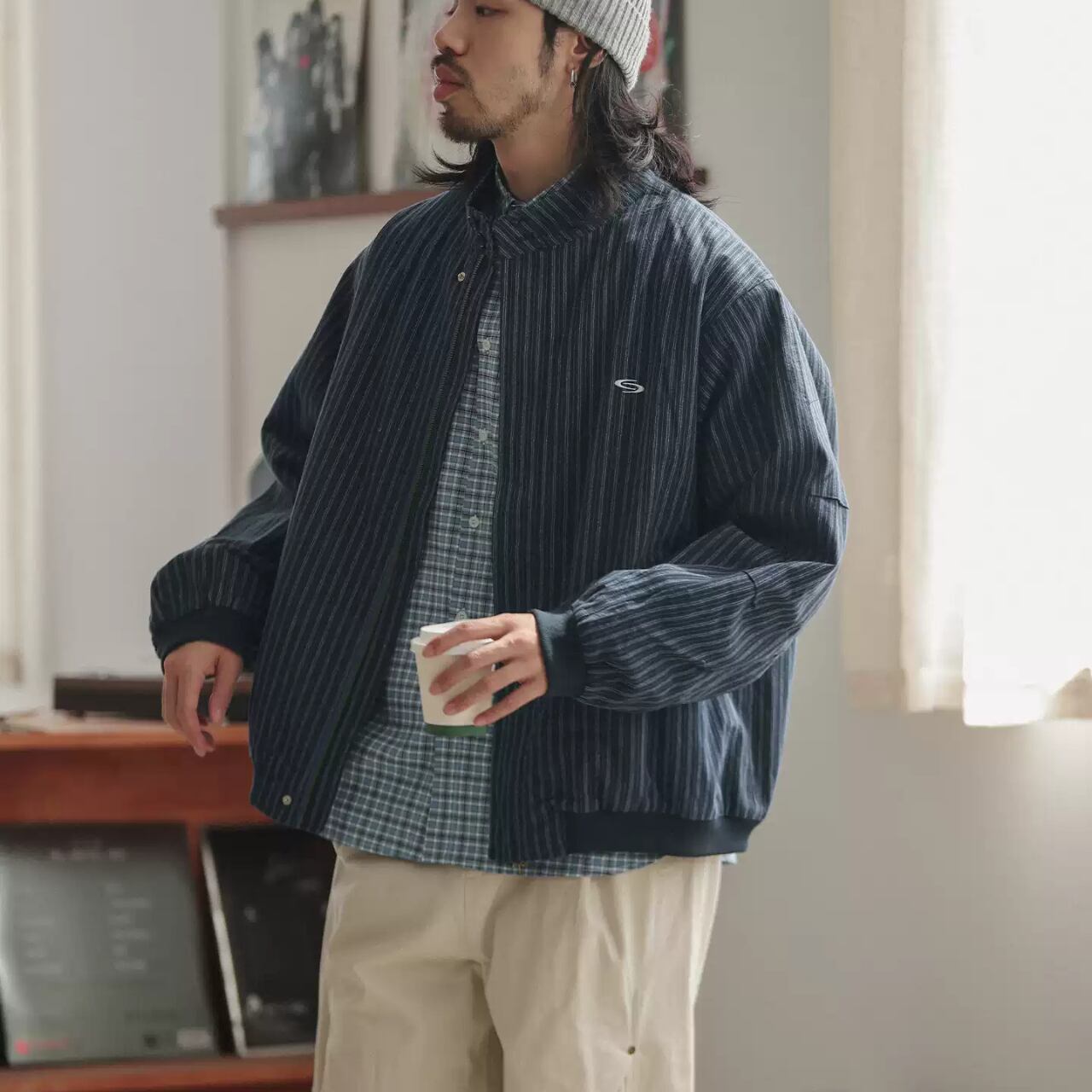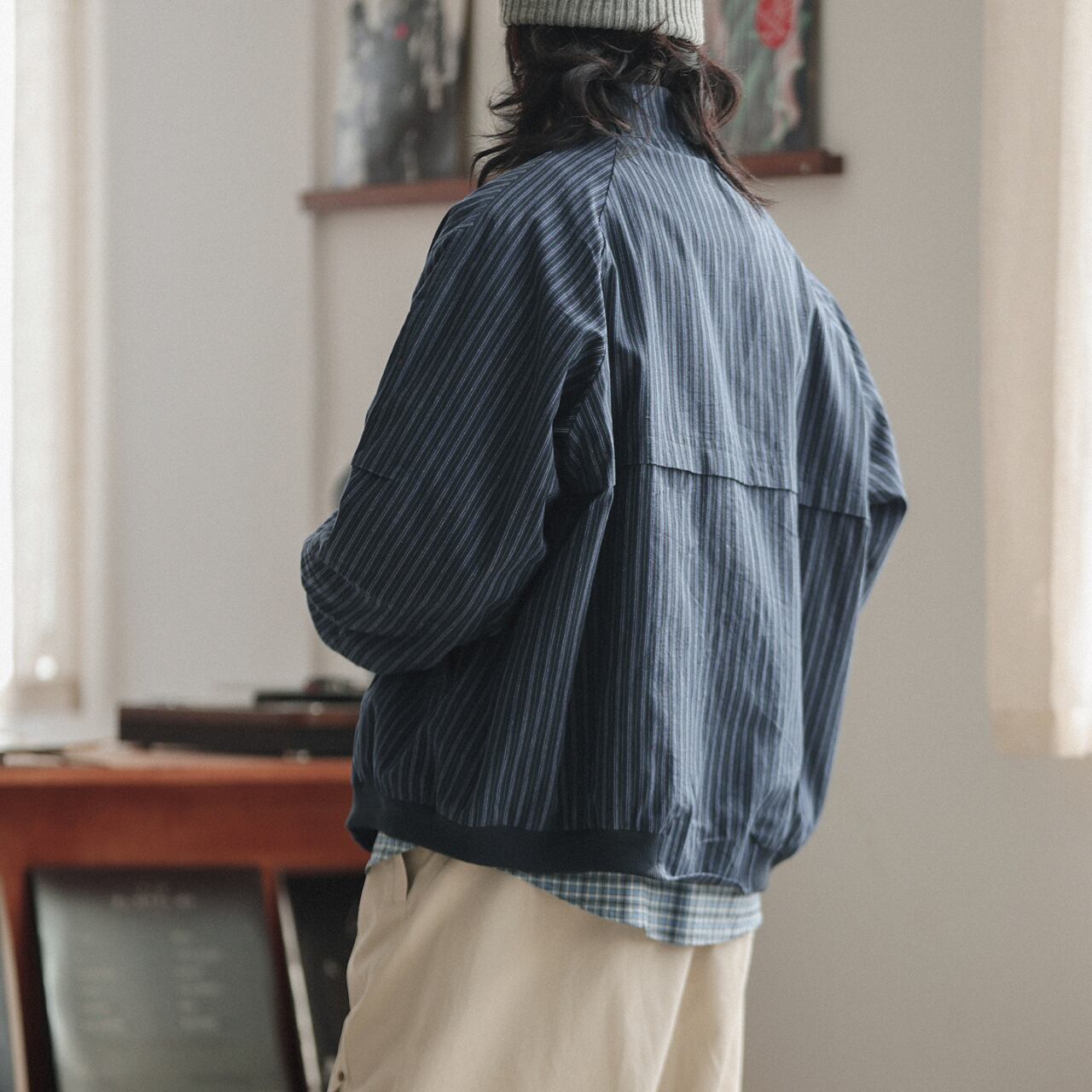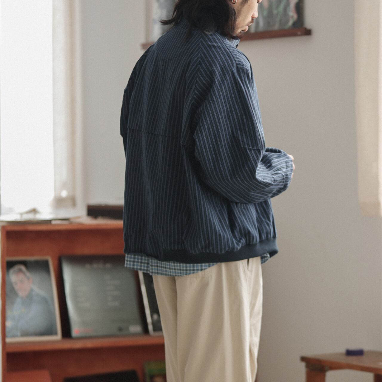 細かなストライプ柄が特徴のスタンドカラージャケット。軽やかなコットン素材を使用し、シャツやカットソーの上にさらっと羽織れる一枚。程よいゆとりのあるシルエットで、ストリートからカジュアルまで幅広いスタイリングにマッチします。