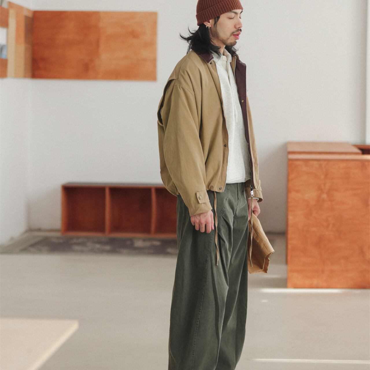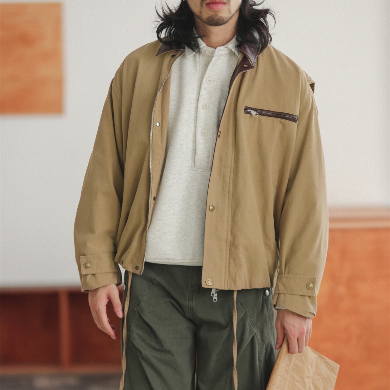 コットン素材にレザー調の襟を組み合わせたデザインジャケット。胸元にはジップ付きポケット、裾にはドローコードを備え、ディテールにこだわった一着。程よくゆとりのあるシルエットで、都会的なスタイルからカジュアルまで幅広く対応します。