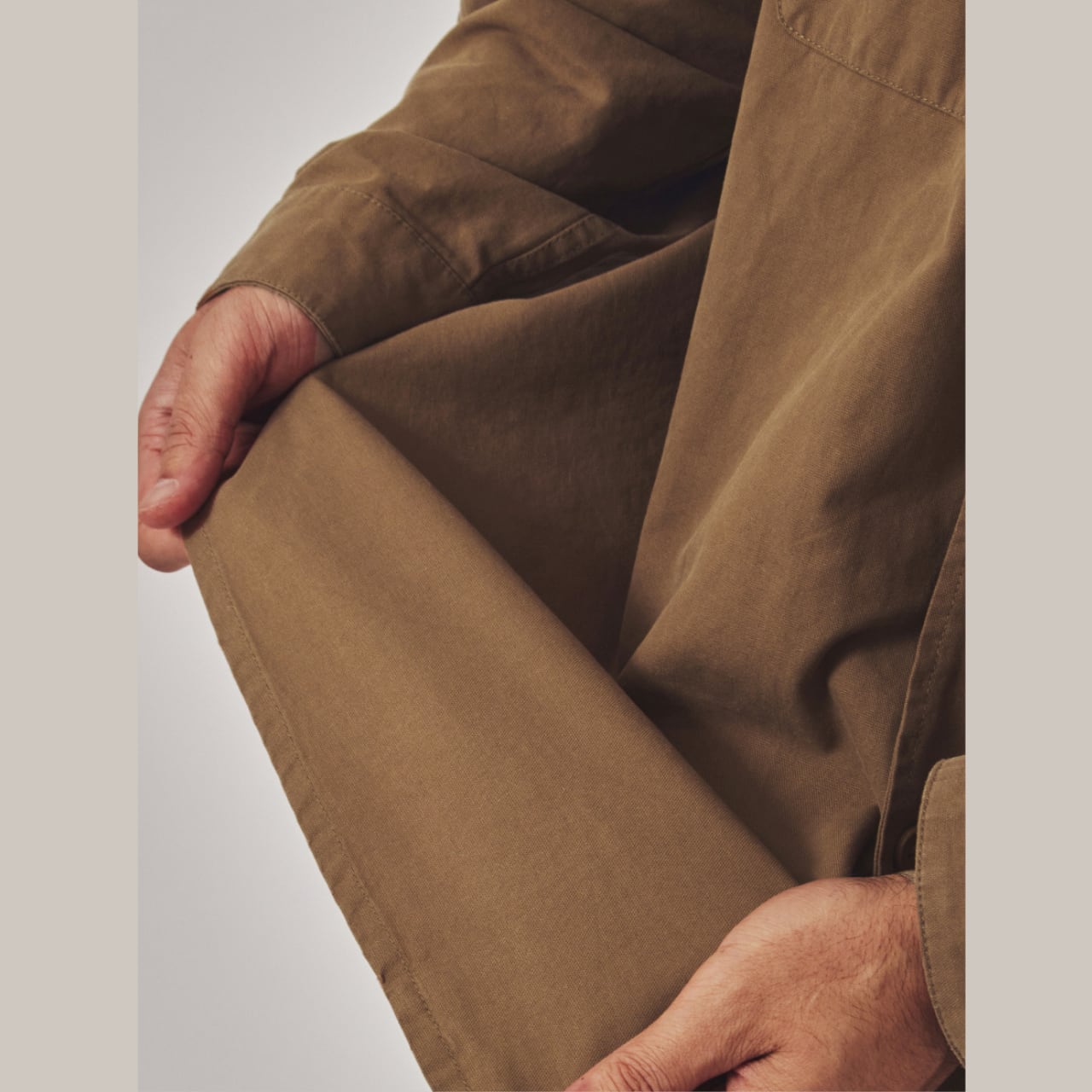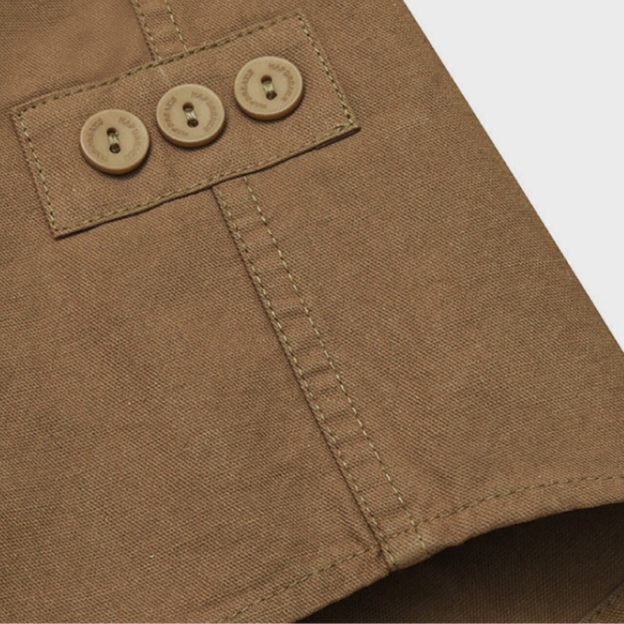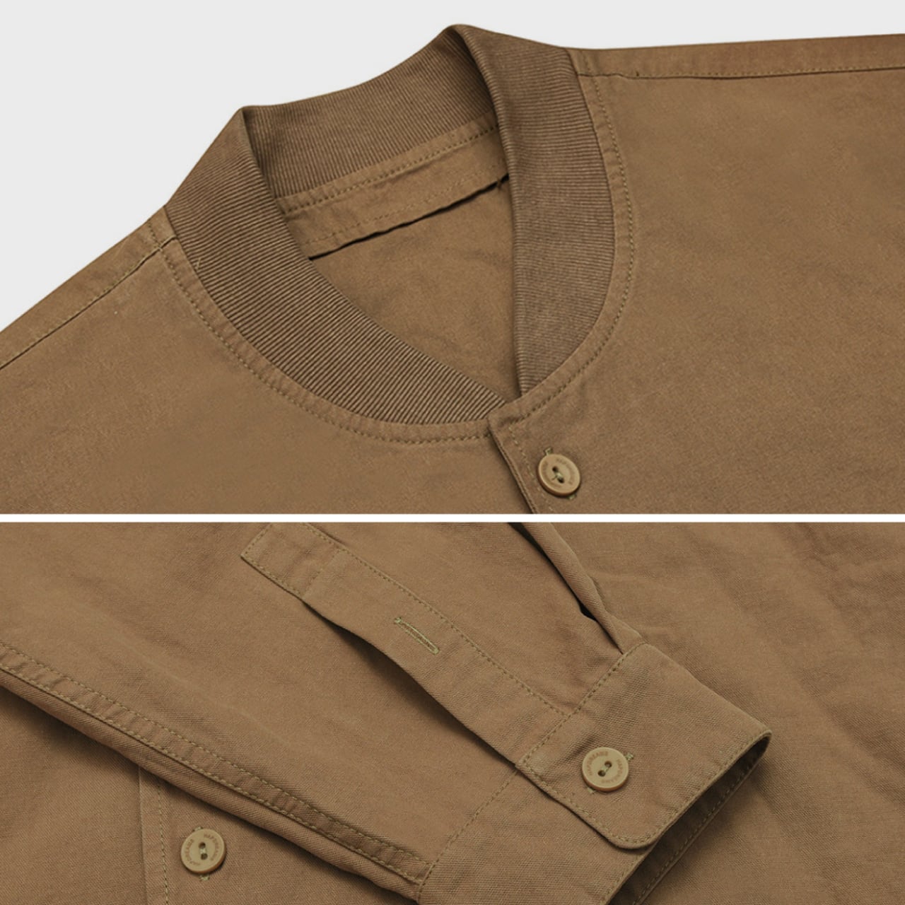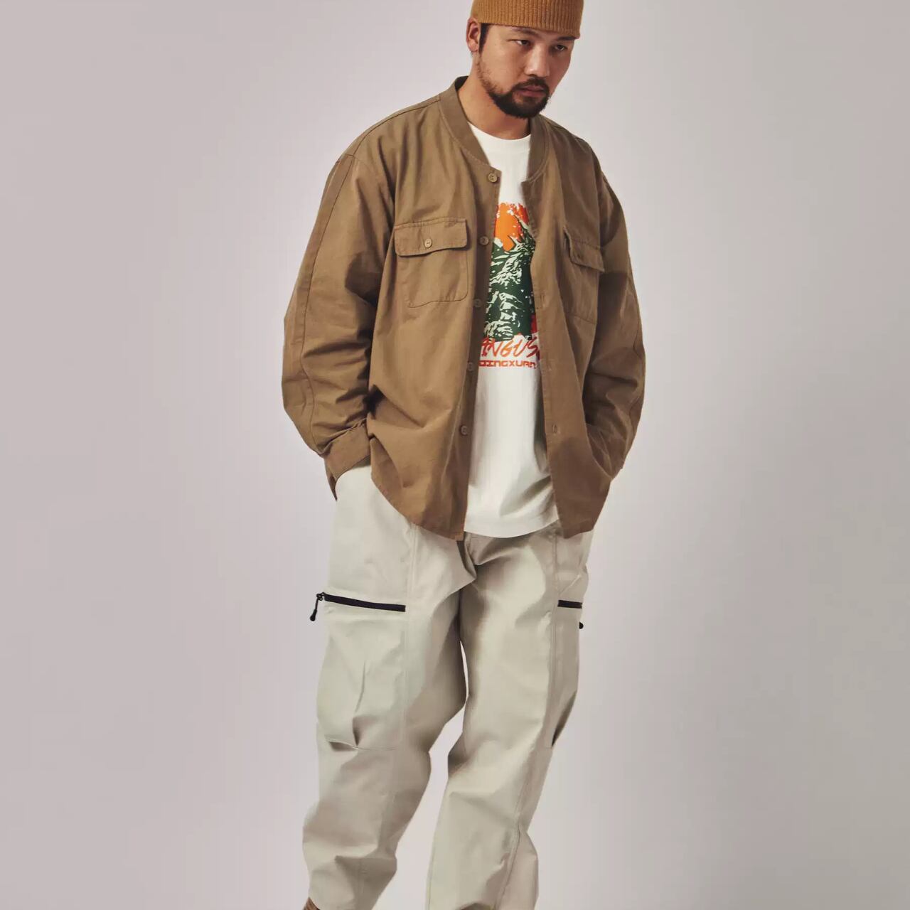 ワークジャケットの要素を取り入れたシャツスタイルのアウター。襟なしのスッキリとしたデザインと、大きめのフロントポケットが特徴。コットン100%の素材で快適な着心地を保ちながら、タウンユースにもアウトドアにも馴染む万能アイテムです。ワイドパンツやカーゴパンツとの相性も抜群。