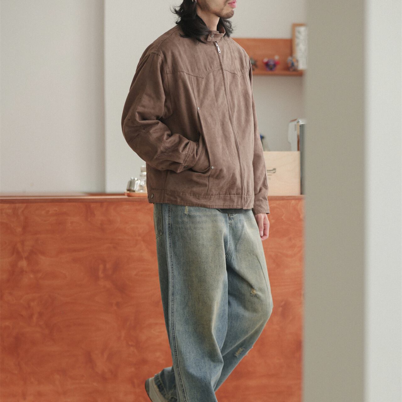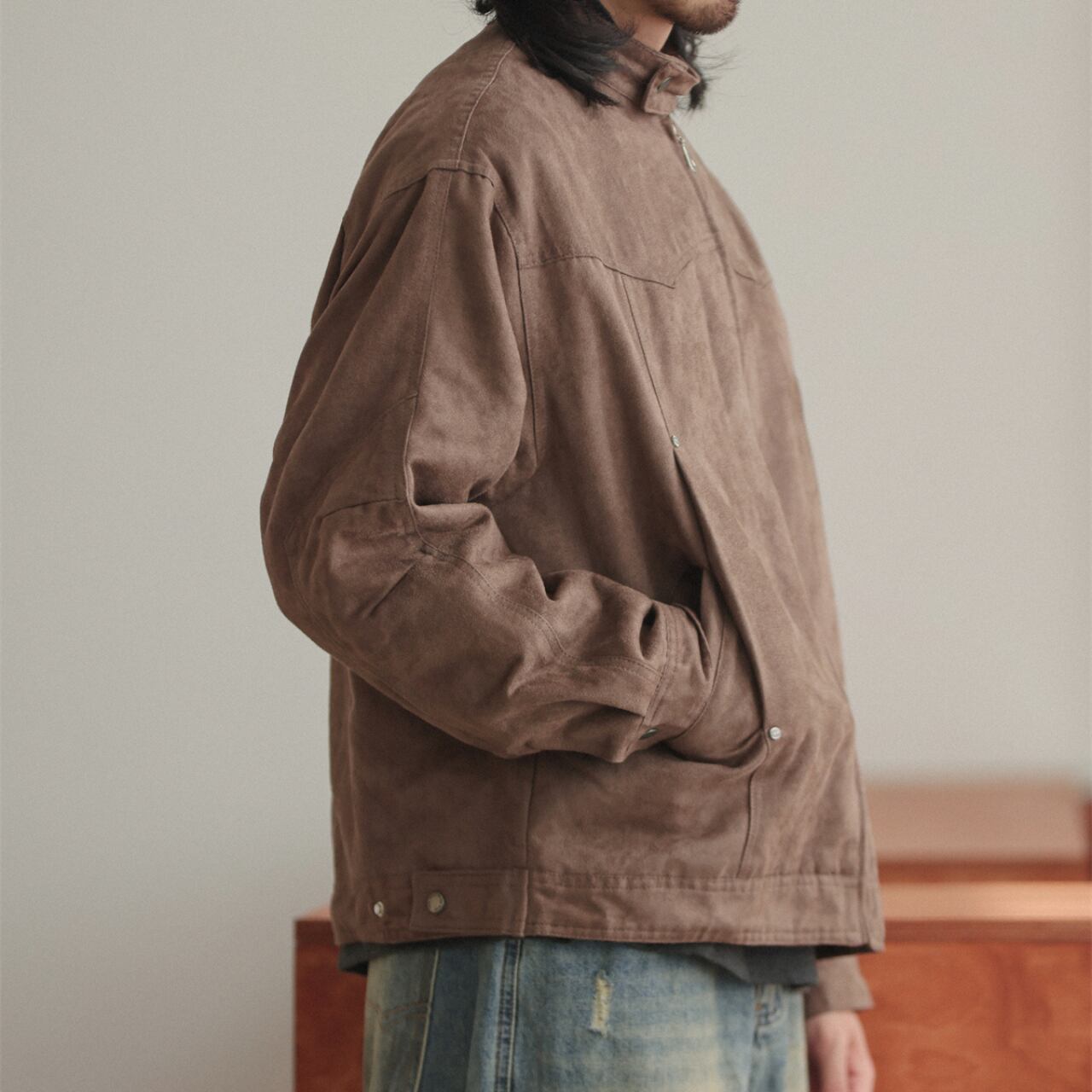 滑らかなスエード調素材を使用したスタンドカラージャケット。フロントはジップとボタン留め仕様で防風性とデザイン性を両立。両サイドに実用的なポケットを配置し、都会的な雰囲気とカジュアルなリラックス感を兼ね備えています。デニムやワイドパンツと合わせやすく、秋冬のストリートスタイルに最適。