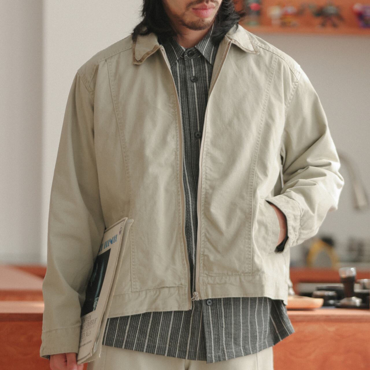 シンプルながらも存在感のあるコットンツイルジャケット。ややルーズなシルエットで、ストライプシャツやワイドパンツとのレイヤードにも相性抜群。都会的にもカジュアルにも着こなせます。秋の街歩きにぴったりのアイテムです。
