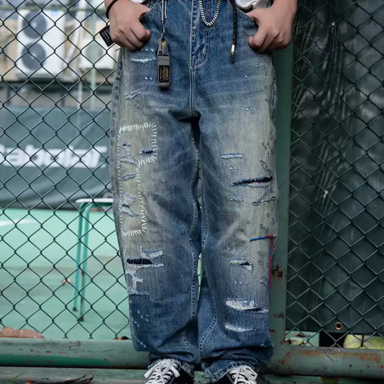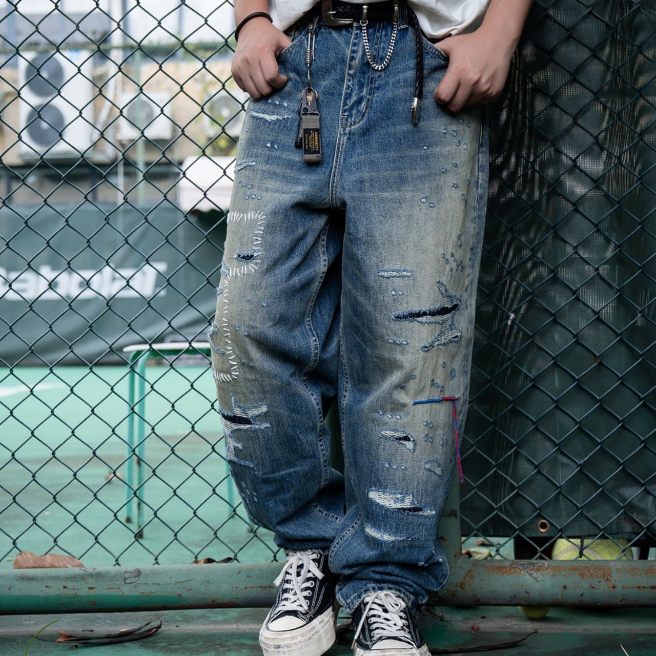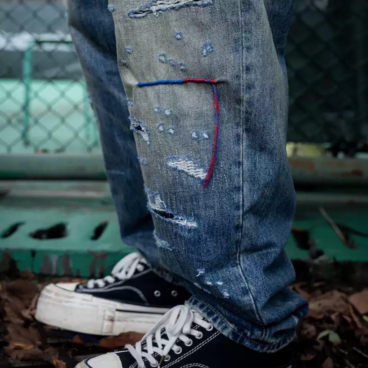 大胆に施されたクラッシュ加工とステッチワークが特徴で、ユーズド感漂う風合いに仕上がっています。随所に見られるリメイク調のディテールが存在感を引き立て、ストリートコーデにアクセントをプラス。Tシャツやスニーカーと合わせるだけでこなれた雰囲気を演出できます。