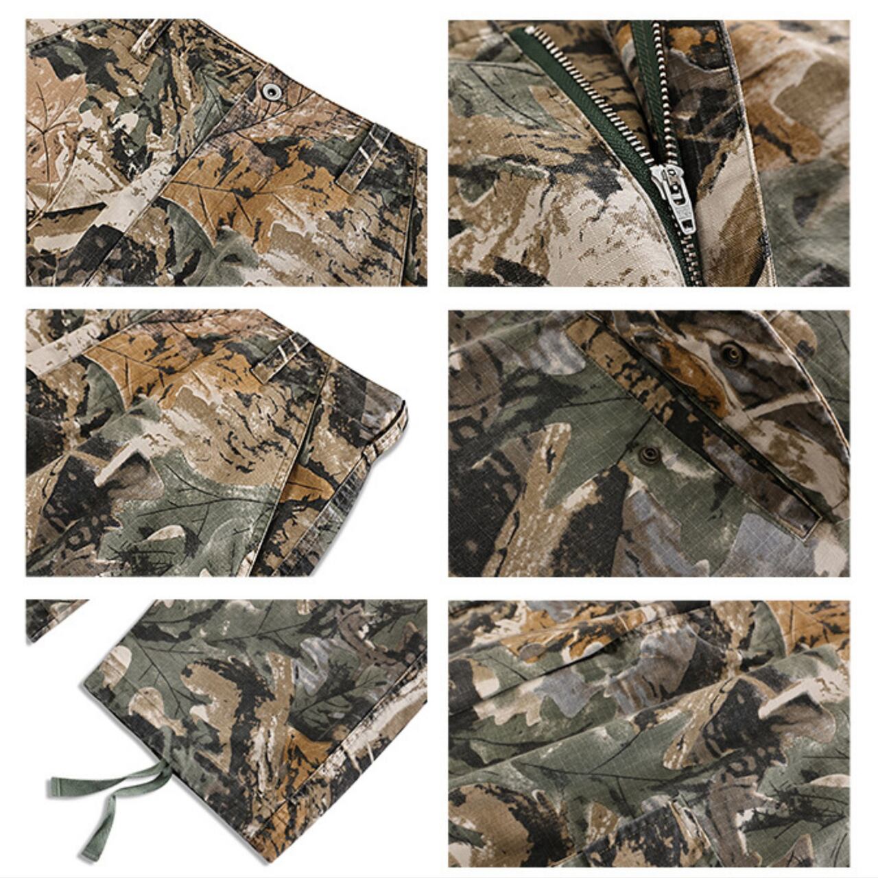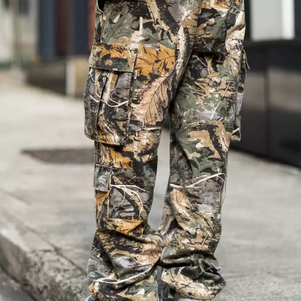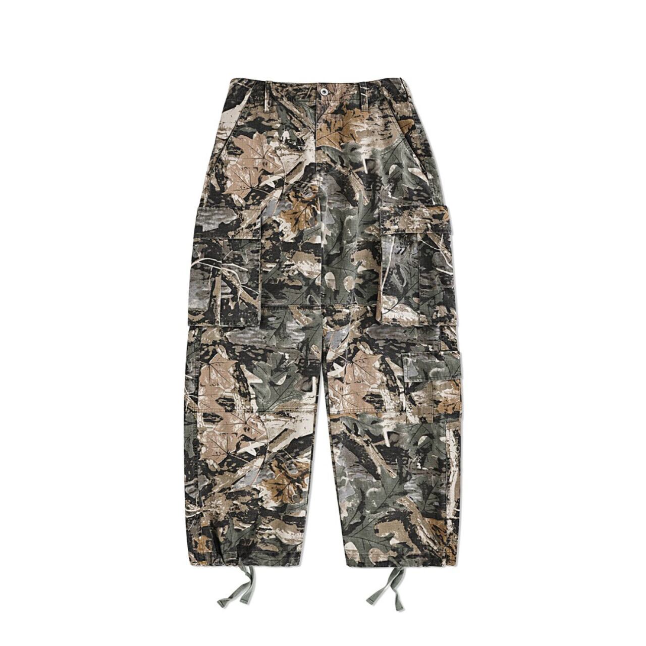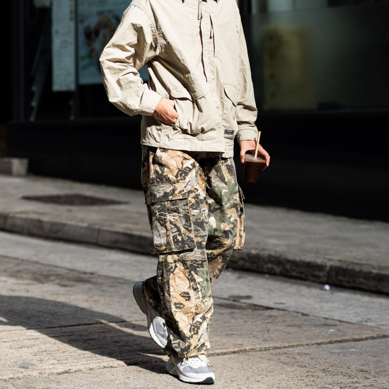 タフな素材感に加え、リアルなカモフラージュ柄が存在感を放ちます。複数のポケットを備えた実用的なデザインで、街中のストリートスタイルからアウトドアシーンまで幅広く活躍。裾のドローコードでシルエット調整も可能です。
