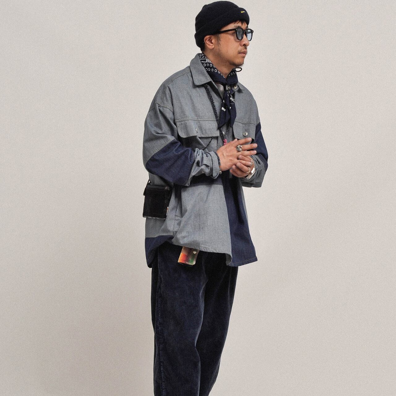 異なる色味のデニム生地を組み合わせたパッチワークデザインのシャツ。