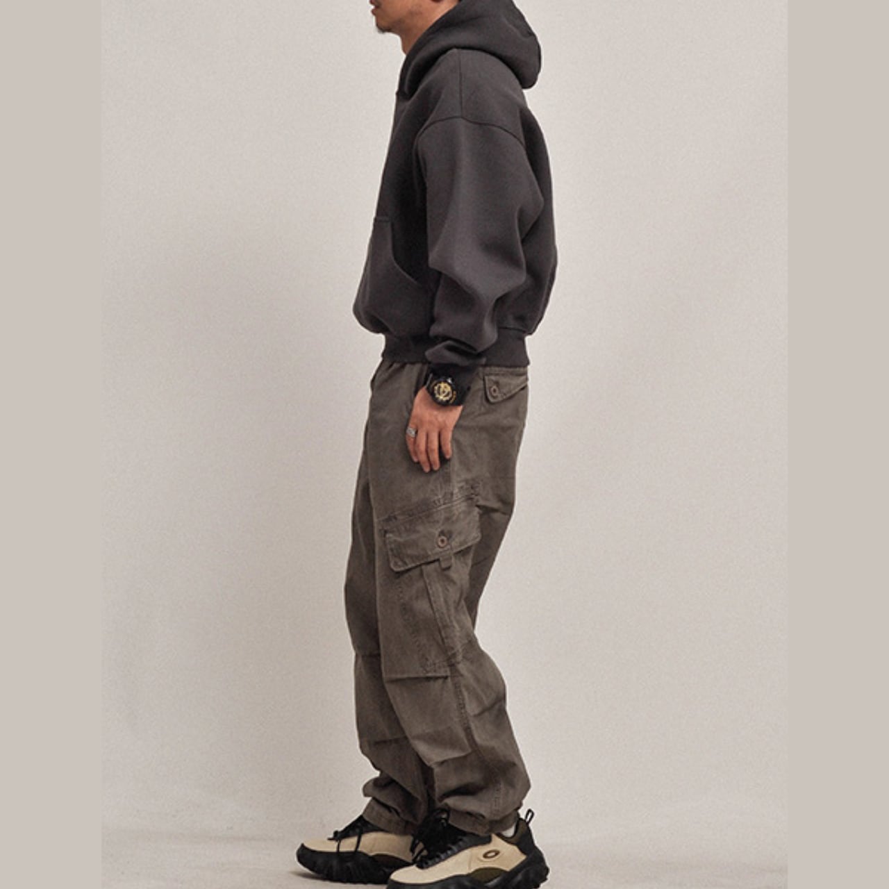 無骨な雰囲気を漂わせるヘビーウォッシュ仕上げのカーゴパンツ。深みのある色合いと立体的なシルエットが、ストリートからアウトドアまで幅広いスタイルにマッチします。大容量のポケットはデザイン性だけでなく実用性も兼ね備え、日常使いからアクティブなシーンまで活躍する一本。ワードローブに加えるだけで、即戦力となるアイテムです。