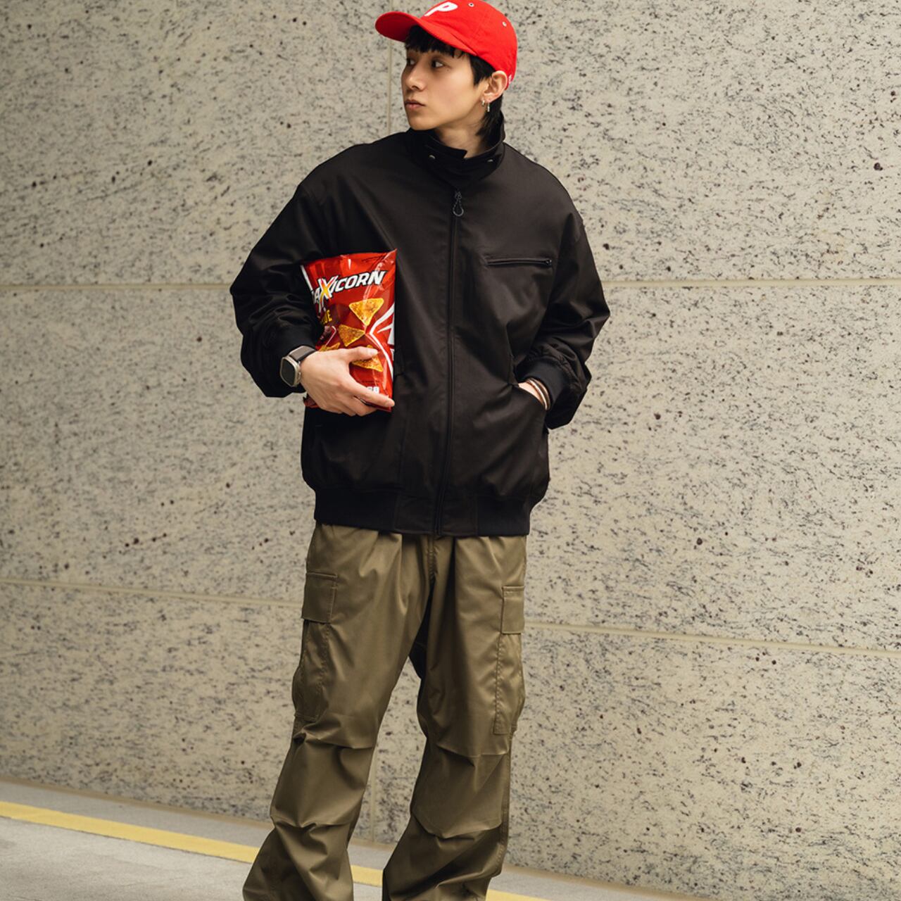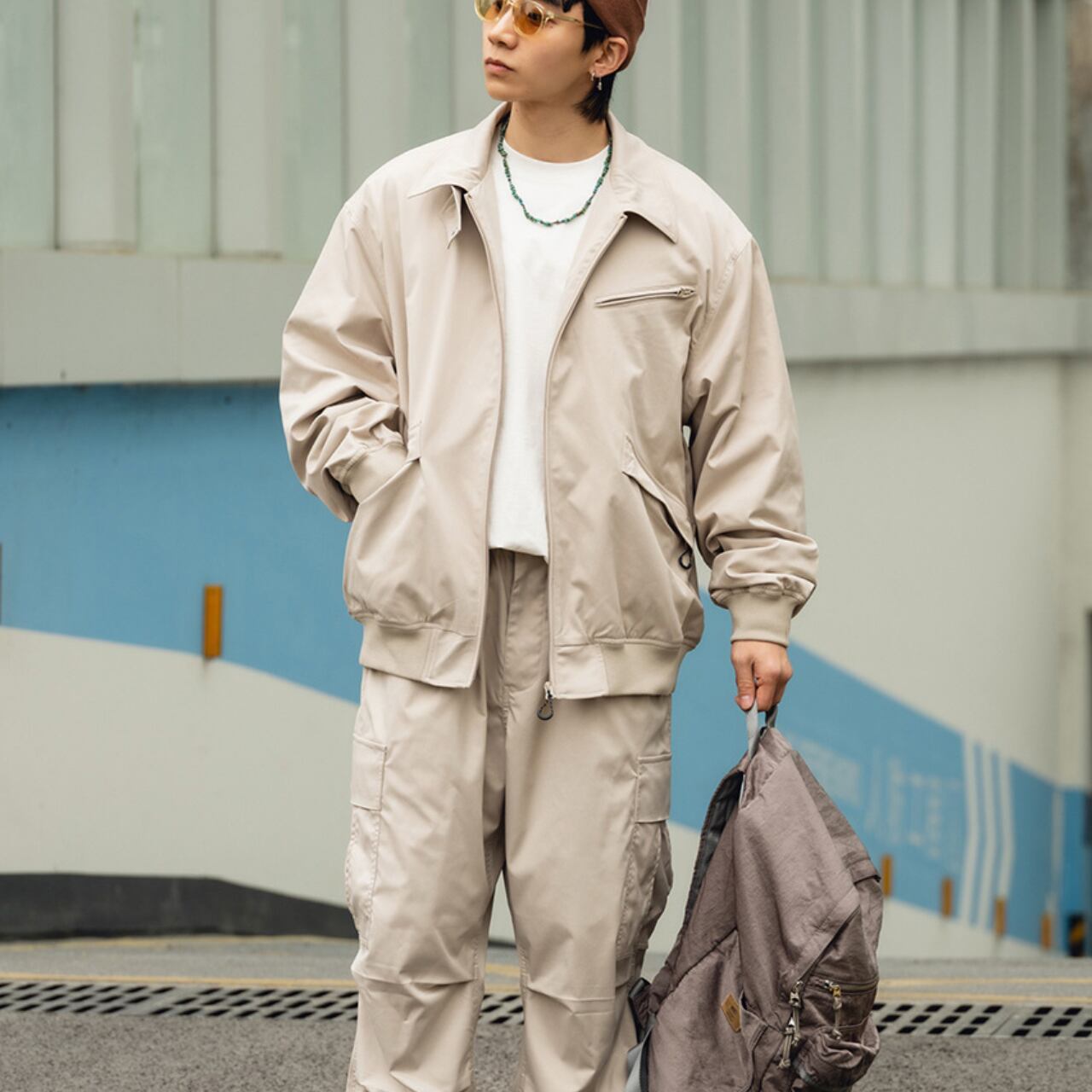 ゆったりとしたシルエットとスタンドカラーのデザインが都会的な雰囲気を演出し、