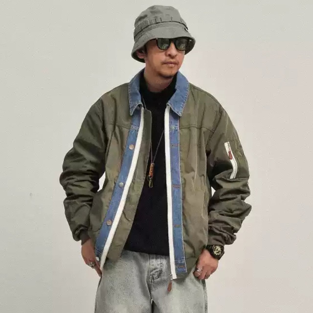 デニムとナイロンを組み合わせたツートーンデザインのフライトジャケット。ストリートからアウトドアまで幅広く対応。存在感のある切り替えデザインが都会的なムードを演出し、ゆったりとしたシルエットでレイヤードも自在。