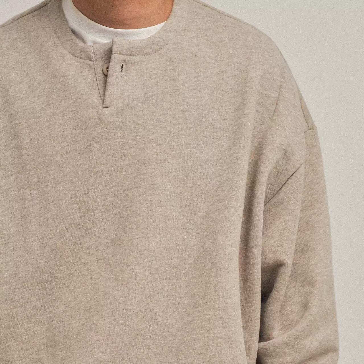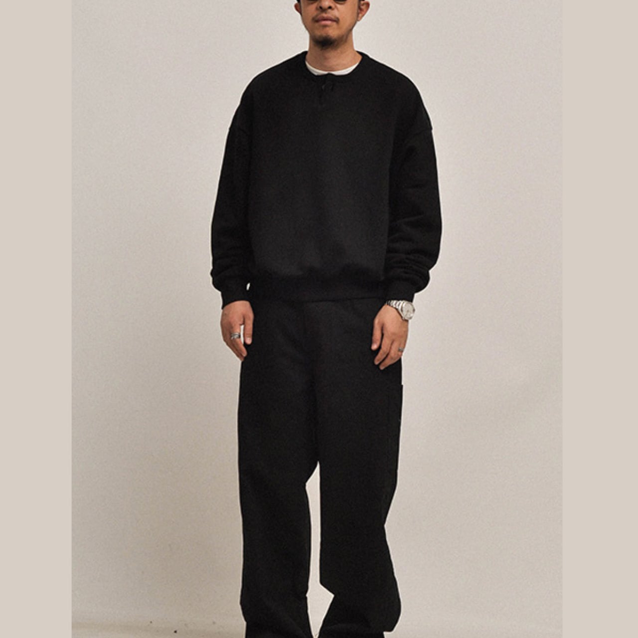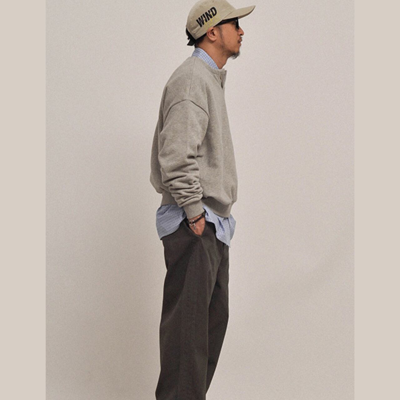 ミニマルかつ無骨なデザインが魅力のBOXYシルエットのハーフジップスウェット。肩が落ちるゆったりとしたドロップショルダー仕様で、トレンドのレイヤードスタイルとも相性抜群。中厚手の素材感で春秋は1枚で、冬はインナーとしても活躍。襟元のスナップボタンがスタイリングにアクセントをプラス。カジュアル、ストリート、シティボーイ系におすすめの一着です。