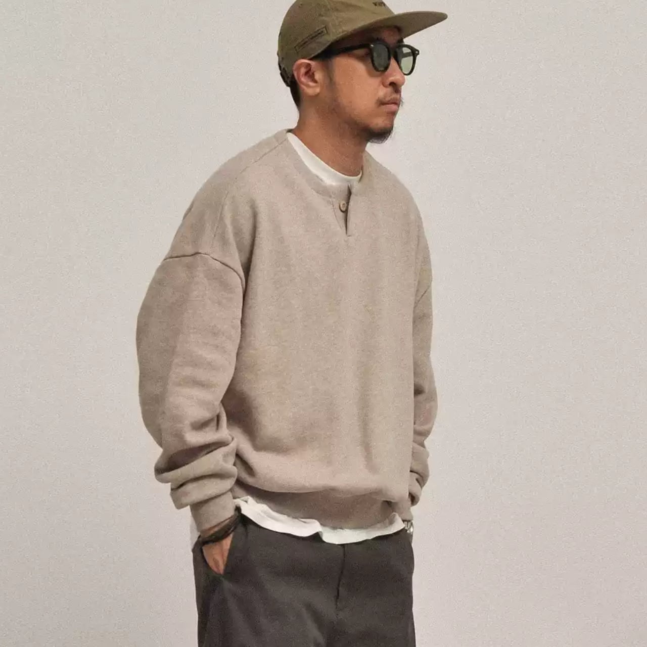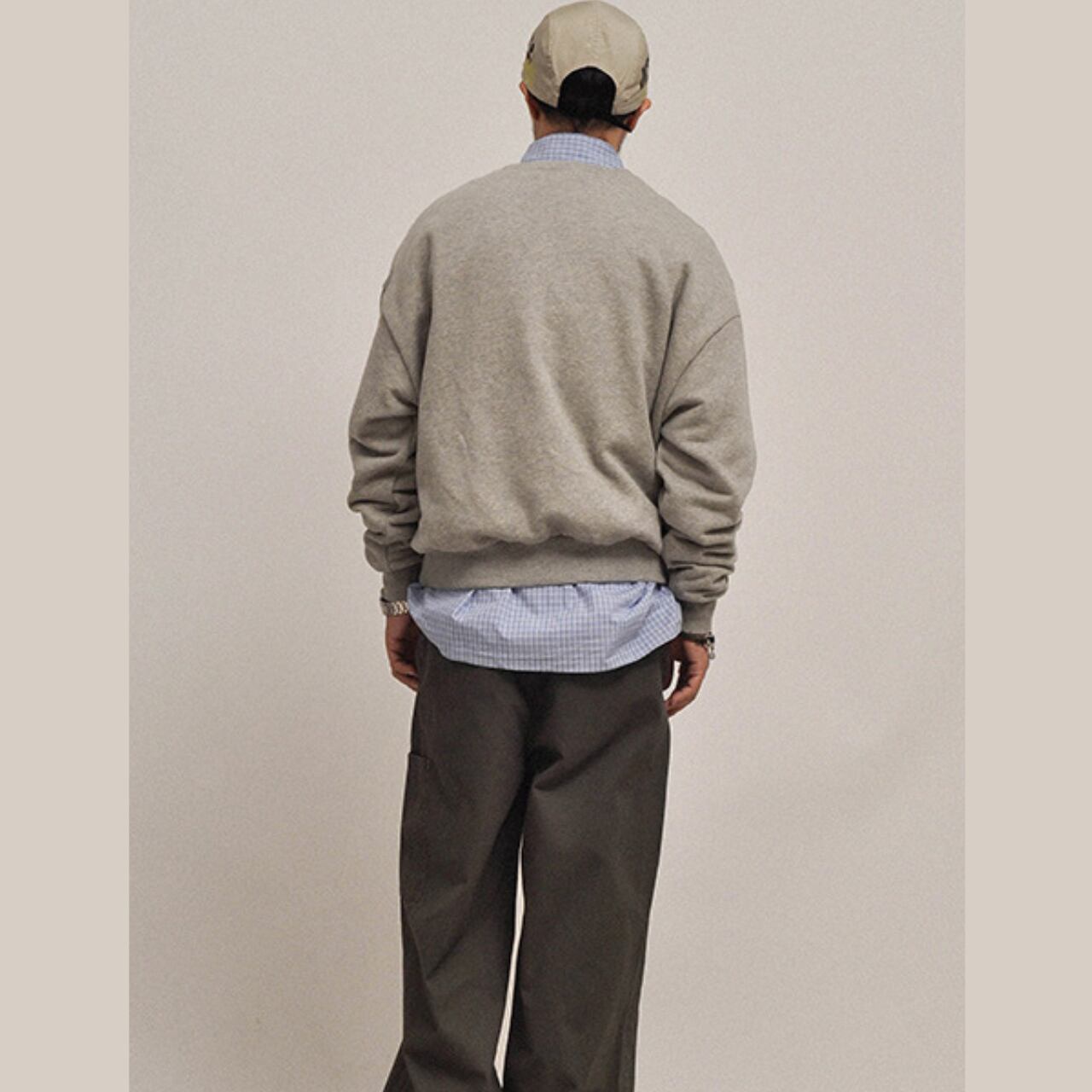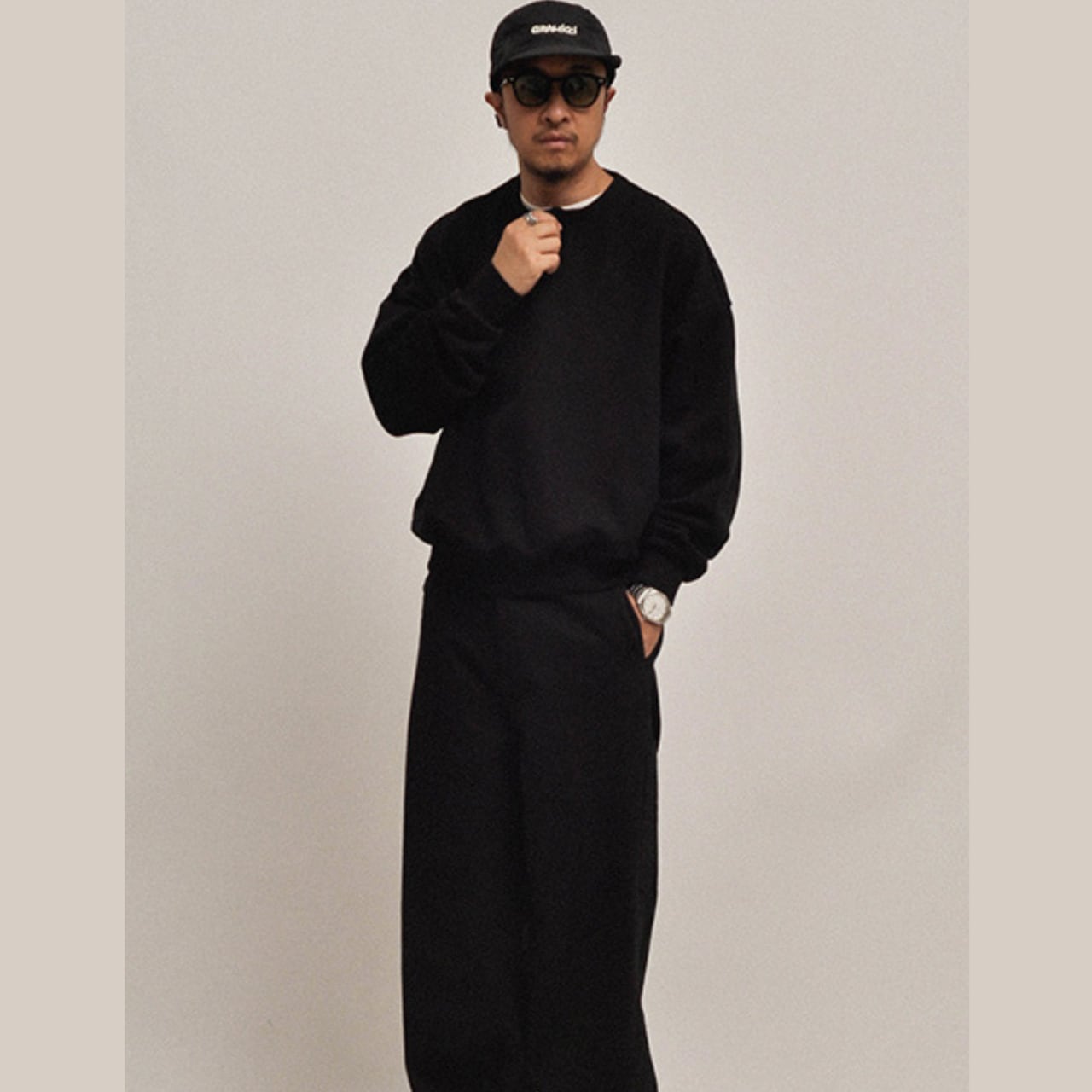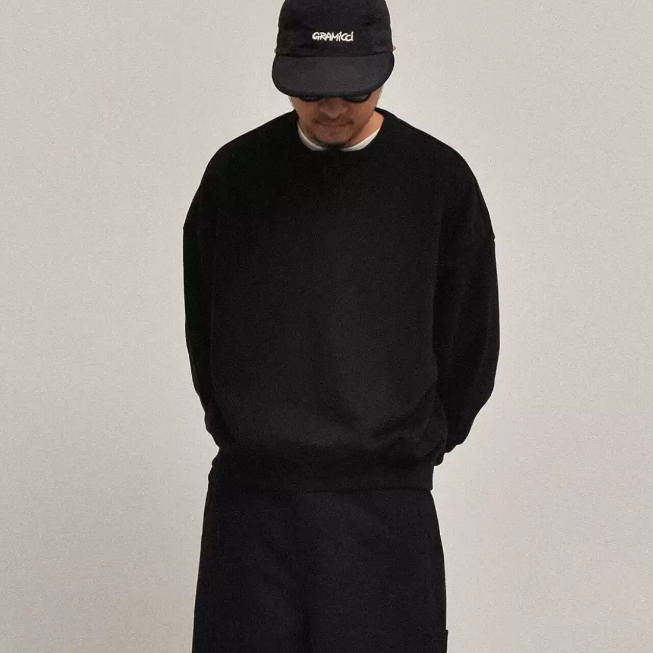 ミニマルかつ無骨なデザインが魅力のBOXYシルエットのハーフジップスウェット。肩が落ちるゆったりとしたドロップショルダー仕様で、トレンドのレイヤードスタイルとも相性抜群。中厚手の素材感で春秋は1枚で、冬はインナーとしても活躍。襟元のスナップボタンがスタイリングにアクセントをプラス。カジュアル、ストリート、シティボーイ系におすすめの一着です。