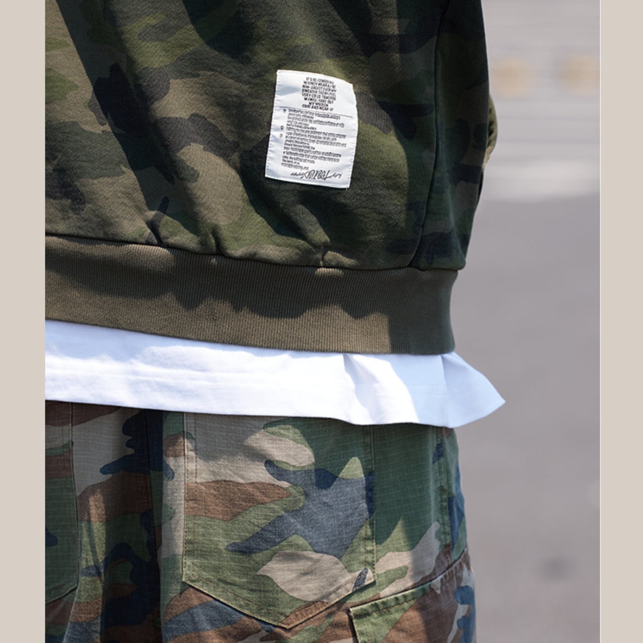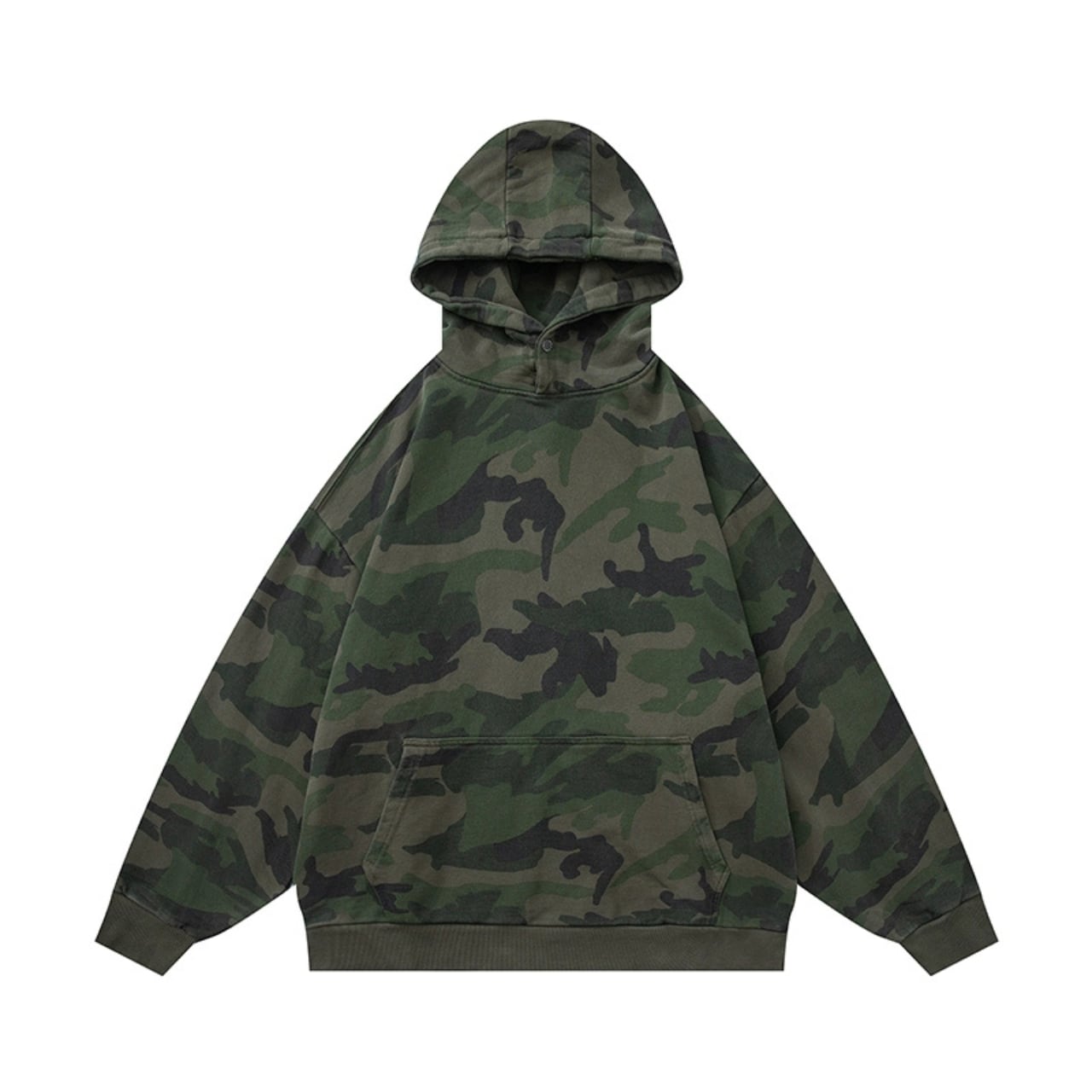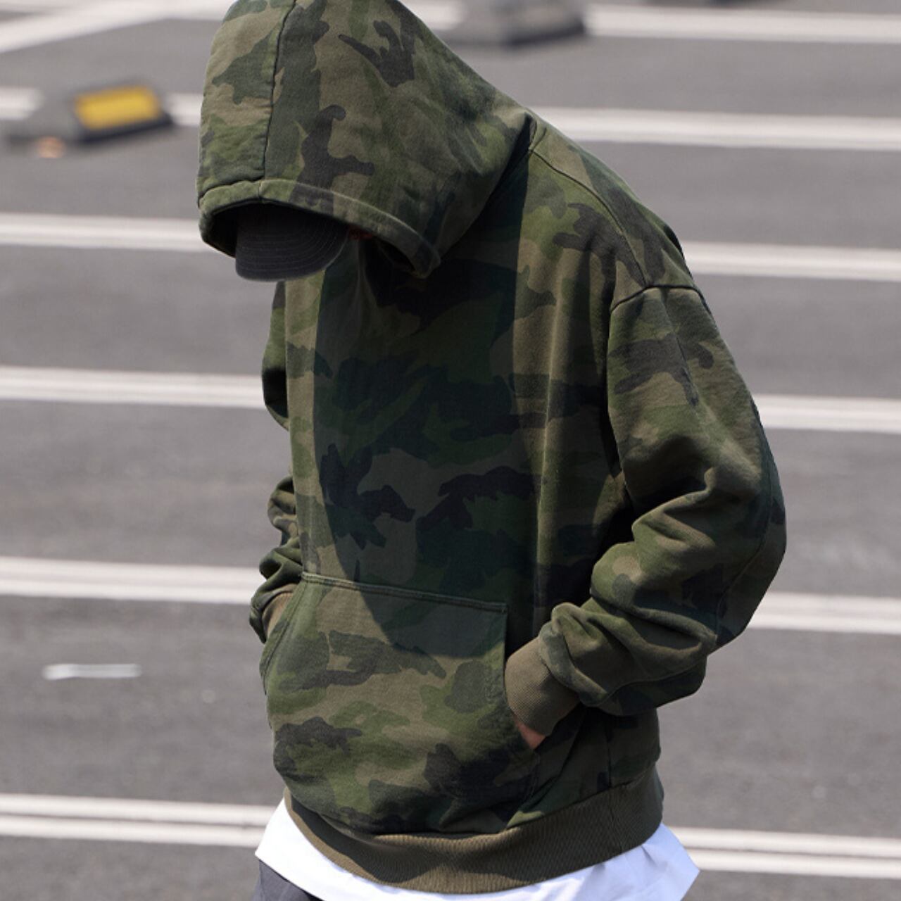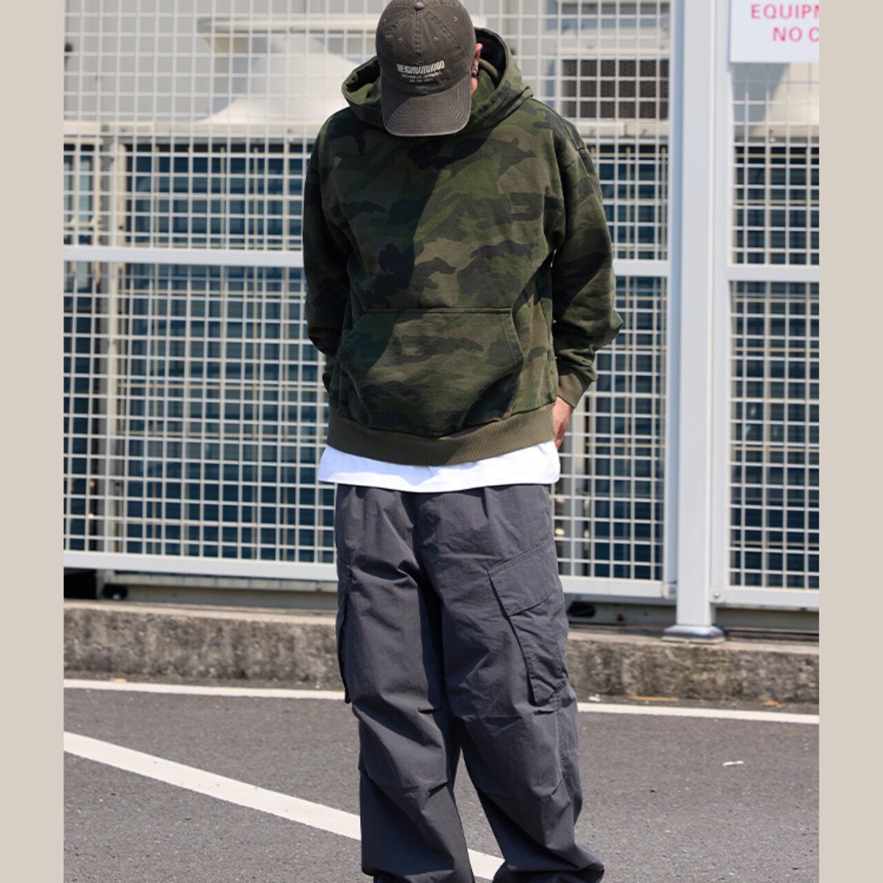 500gのヘビーウェイト裏毛コットンを使用した、タフで存在感のあるカモフラージュ柄パーカー。ゆったりとしたシルエットに加え、ストリート感のあるフードデザインと大きめのカンガルーポケットが特徴。シンプルながらも男らしさを引き立て、都会的な着こなしからアウトドアスタイルまで幅広く活躍する一着です。
