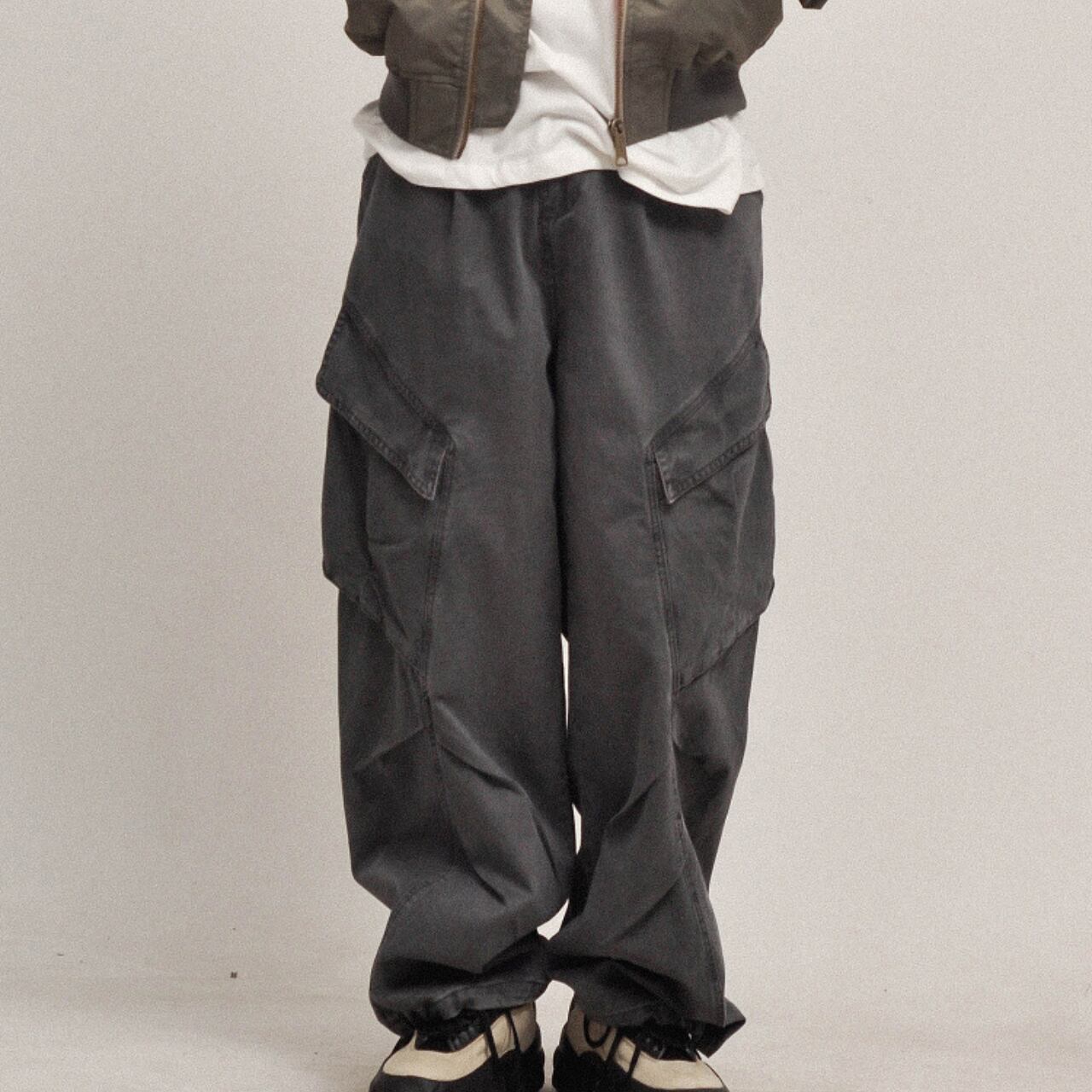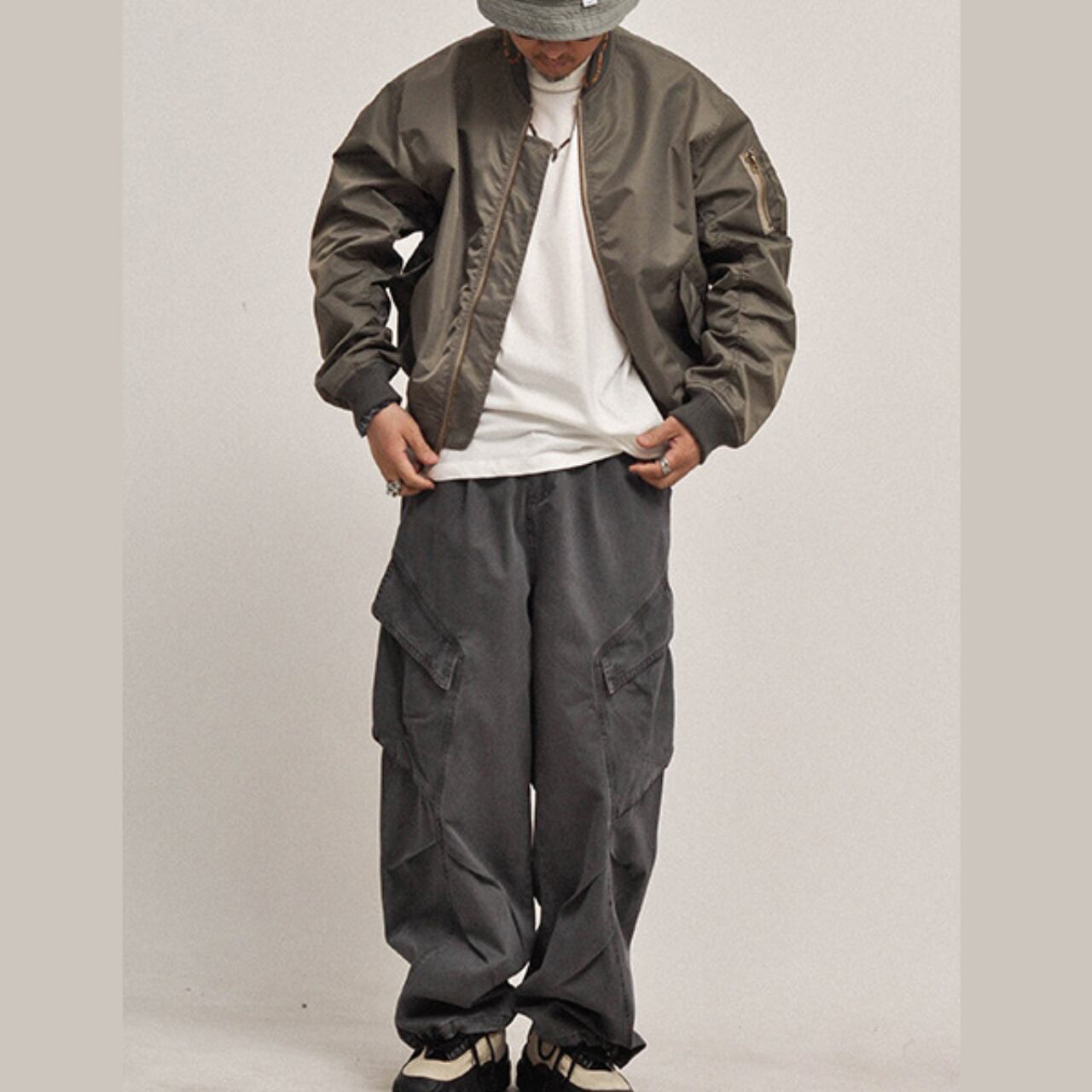 ヴィンテージ感漂うウォッシュ仕上げのカーゴパンツ。斜めに配置されたフラップポケットが特徴で、存在感のあるワイドシルエットはシティボーイスタイルからアウトドアまで幅広くマッチ。洗いをかけた独特の風合いとボリューム感がコーディネートの主役になる一本です。