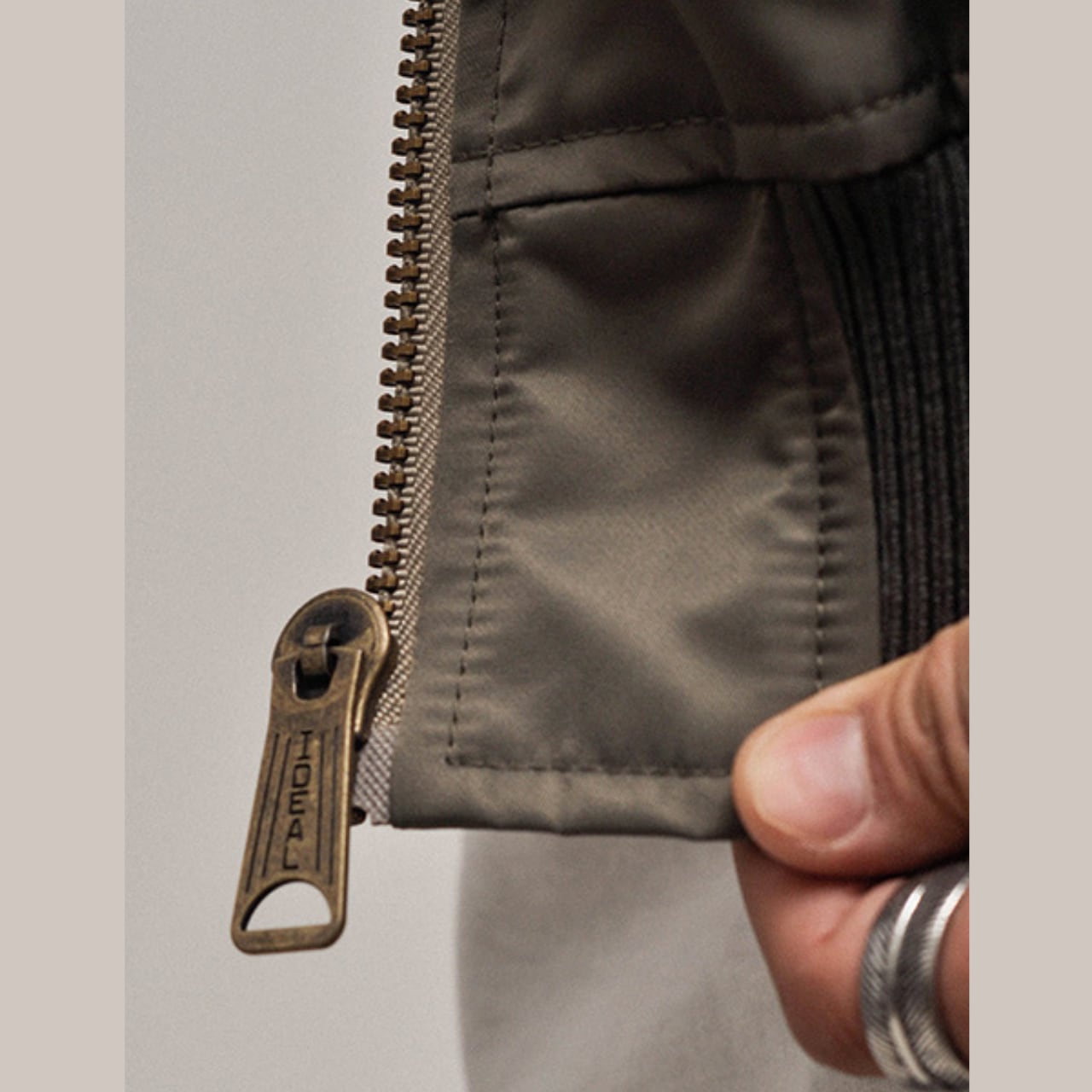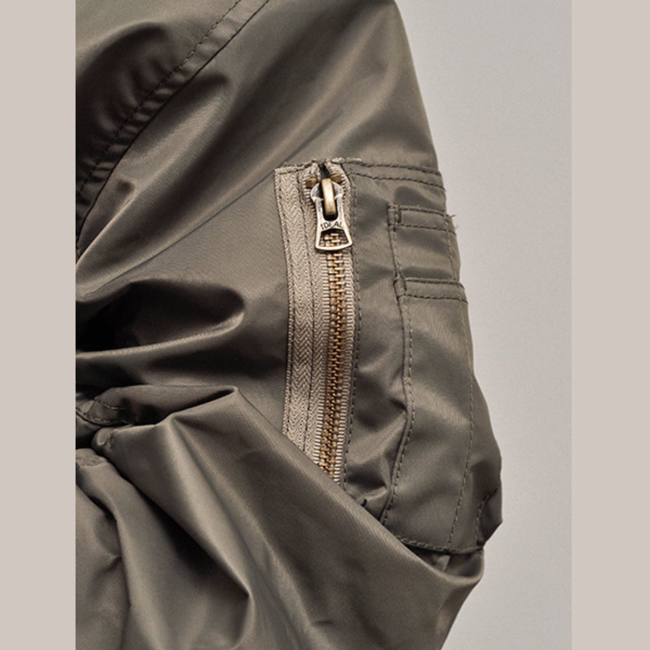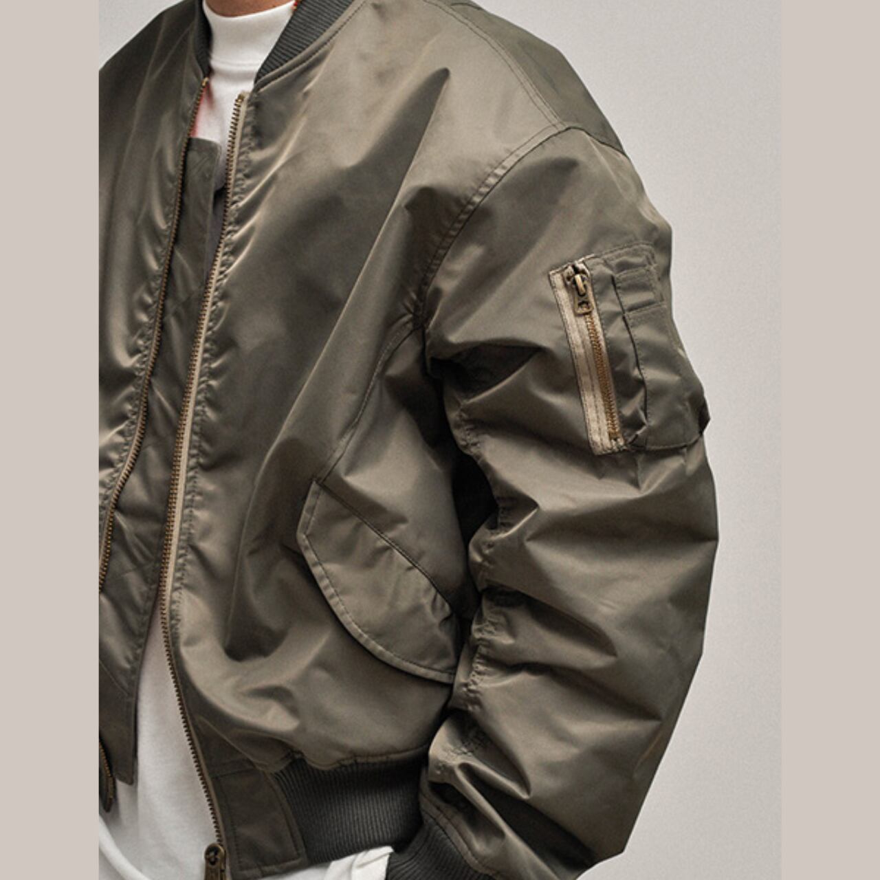 クラシックなシルエットを現代風にアップデートしたボンバージャケット。光沢感のある生地がストリートスタイルを引き立て、無駄のないデザインがミニマルな印象を与えます。ゆったりとしたサイズ感でレイヤードスタイルにも最適。ミリタリー由来のタフな雰囲気を持ちながらも、場所を選ばず、溶け込む万能アウターです。