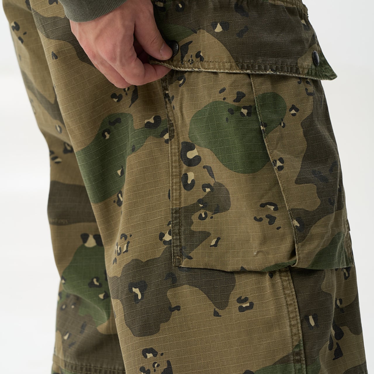 タフで存在感のあるミリタリーカモフラージュ柄が印象的なワイドカーゴパンツ。