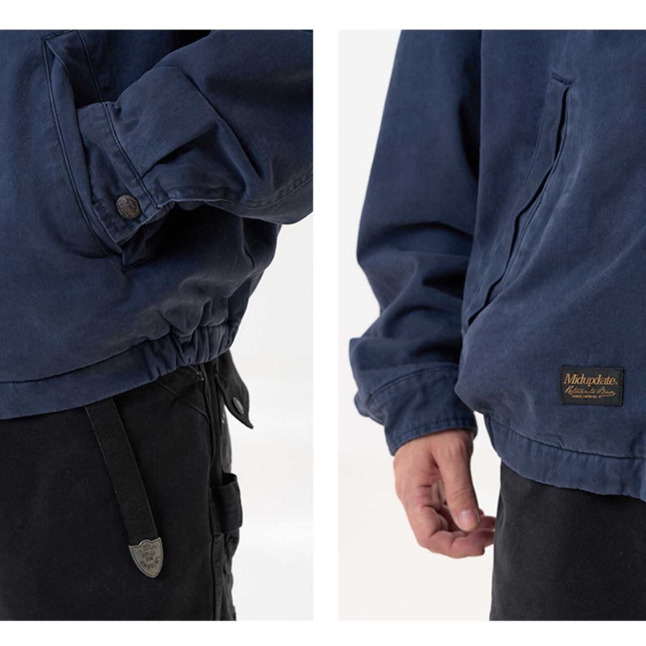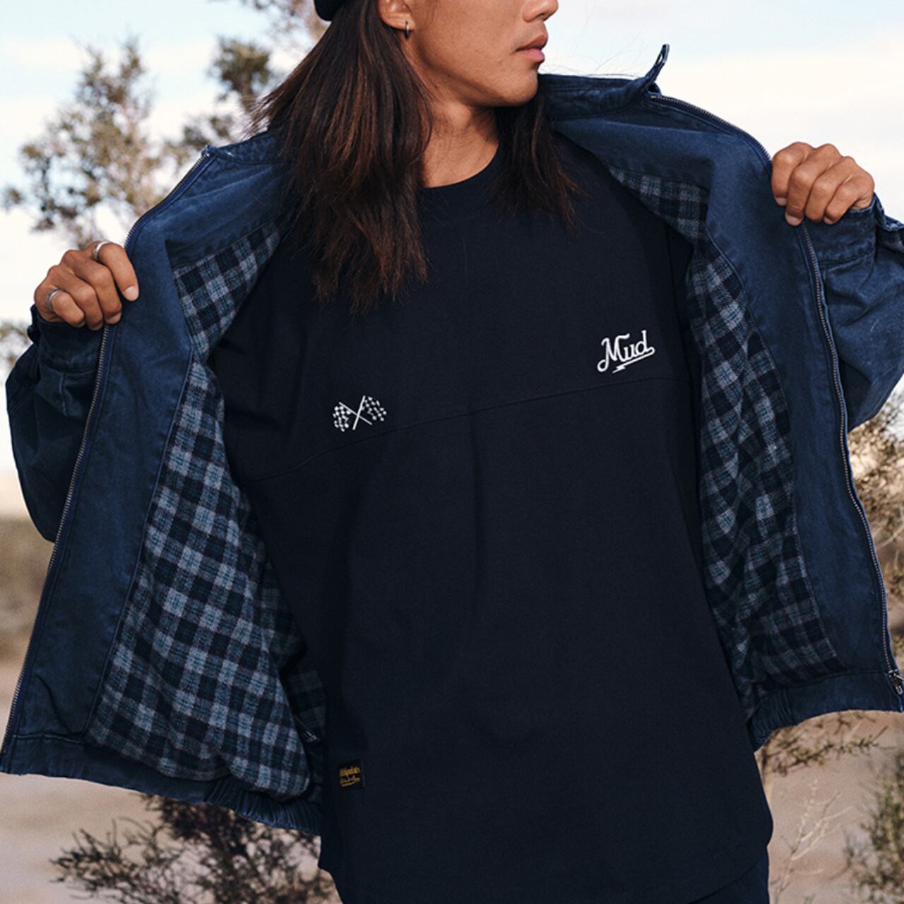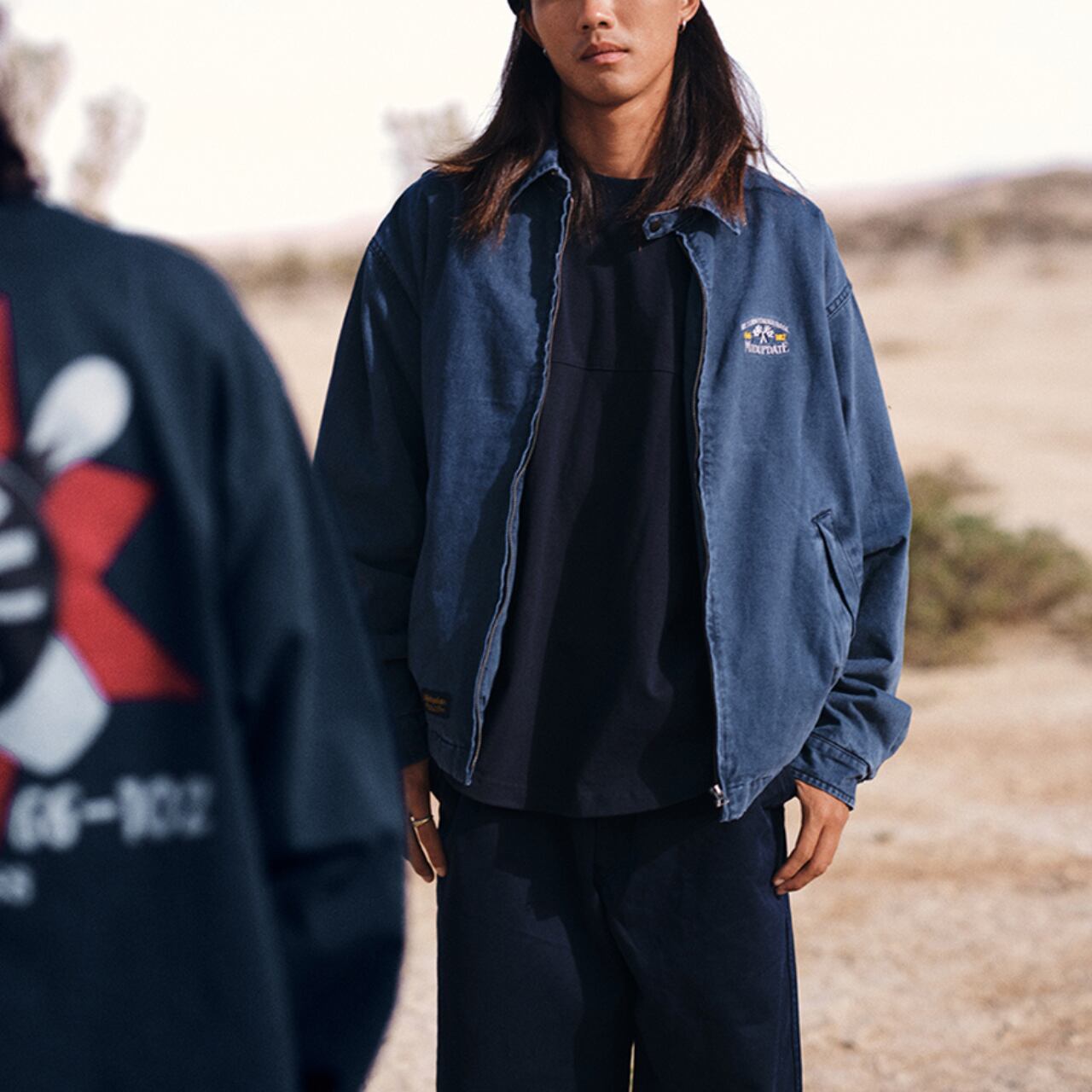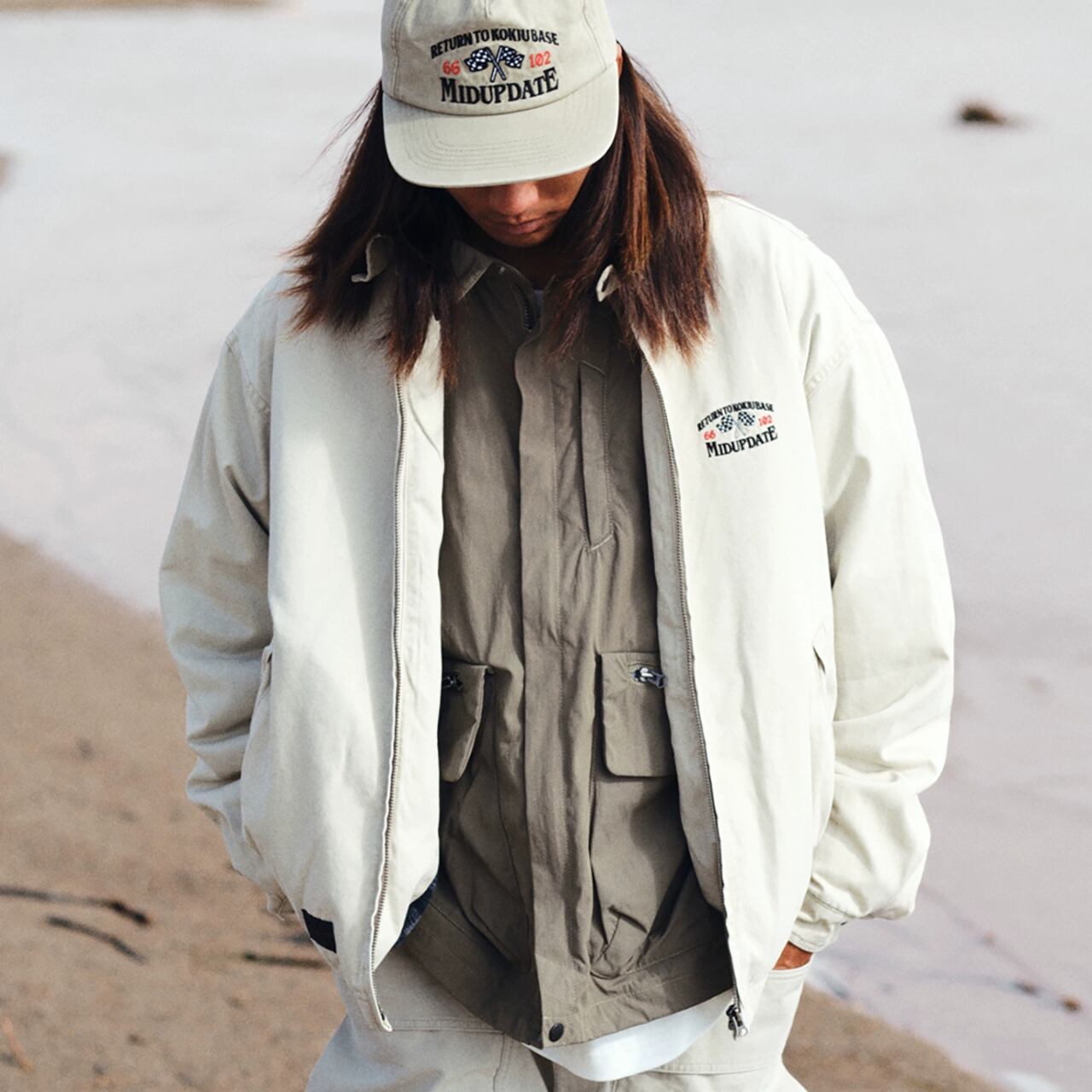 胸元にはブランドロゴの刺繍を配置し、ワークウェアらしい無骨さと都会的な洗練を両立しました。