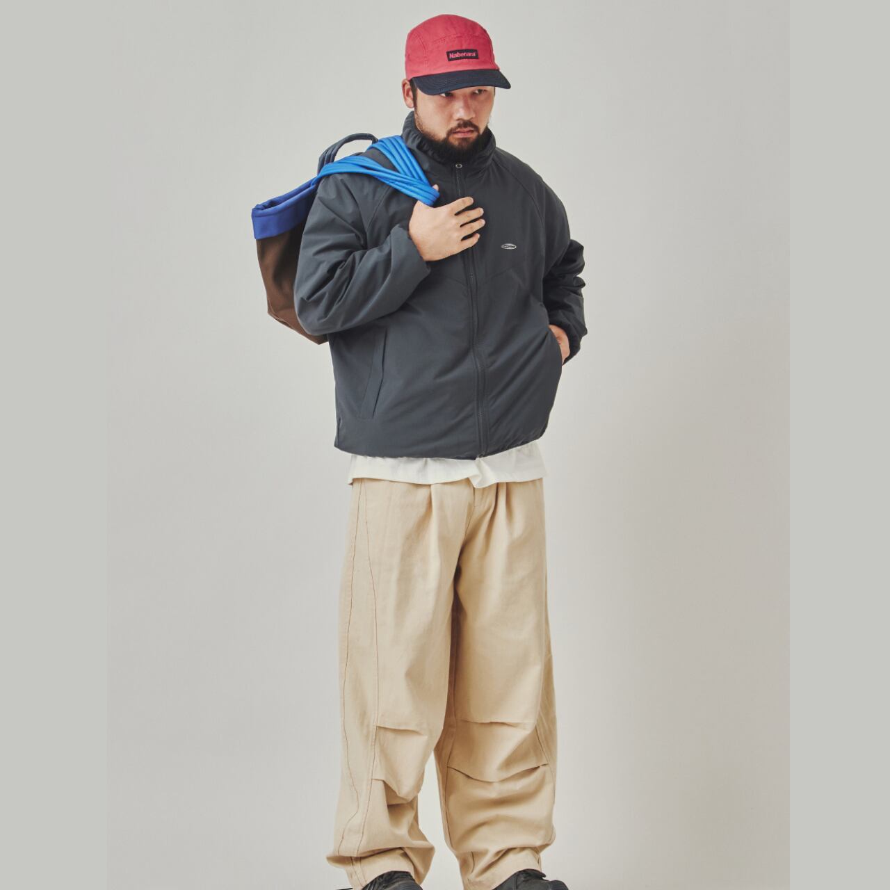 ゆとりのある身幅とラグランスリーブ設計で、インナーにスウェットやフーディを重ねてもストレスフリー。