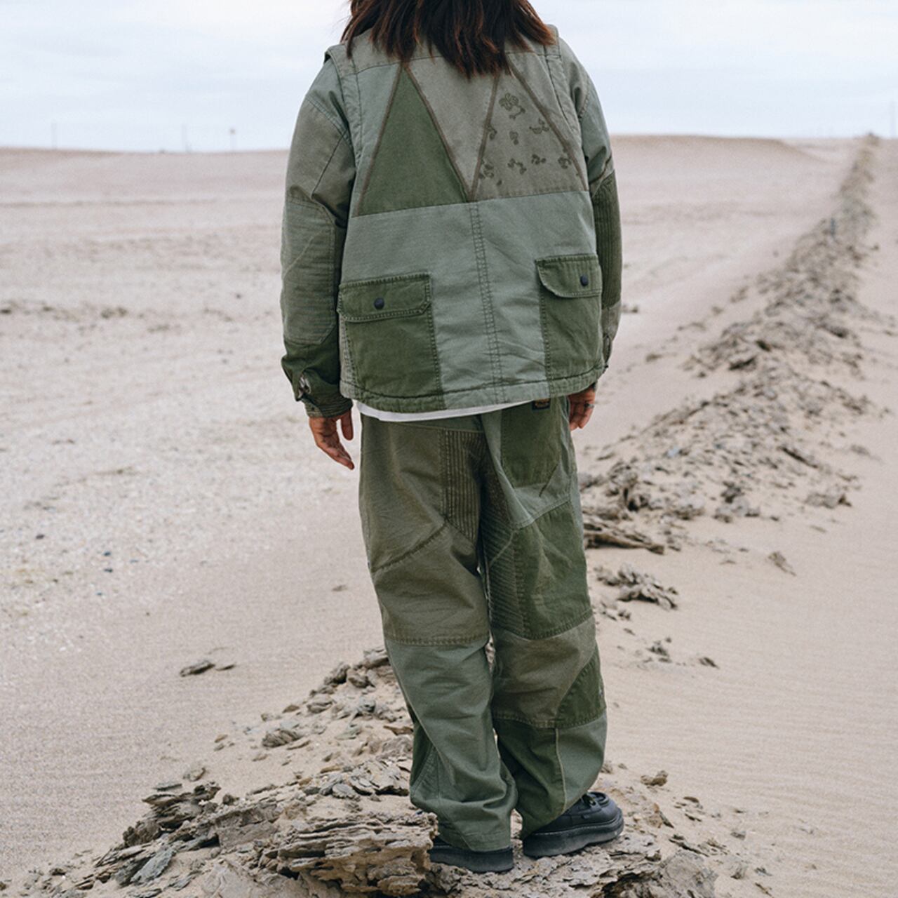 不規則なカットラインが生み出す立体感とリズムが特徴で、ワークウェアらしい重厚感の中に軽やかさを宿します。