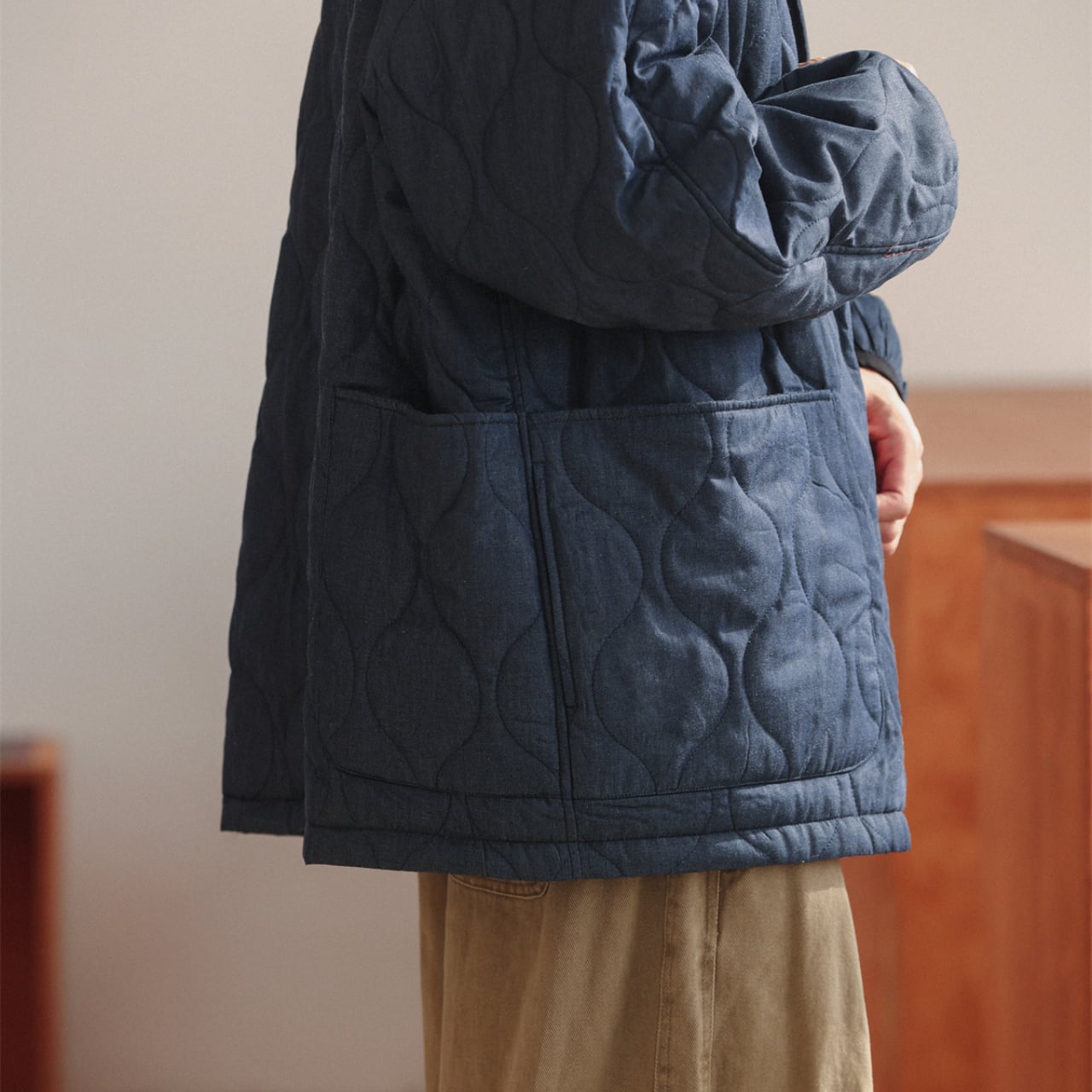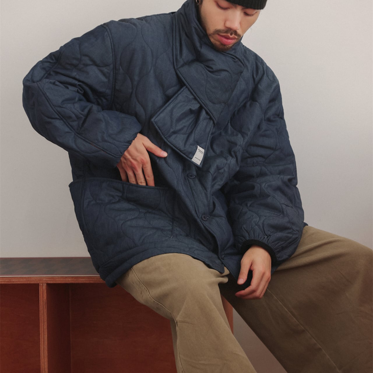 ボリューム感のある中綿入りで、真冬でも頼れる防寒力を発揮するキルトジャケット。丸みを帯びた独特なウェーブステッチが個性的で、シンプルながらも差がつく一着です。ノーカラー仕様でインナーの襟を見せるスタイリングや、ヴィンテージミリタリーを思わせる絶妙なネイビーカラーで、カジュアルにもシティスタイルにもマッチします。