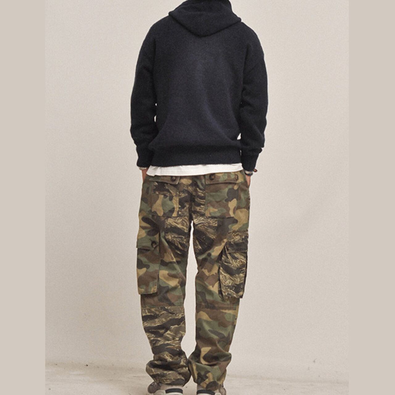 個性とタフさを兼ね備えた、パッチワーク迷彩のカーゴパンツ。異なるカモ柄を組み合わせることで、ミリタリー要素にストリートの空気感をミックス。ゆったりとしたシルエットに加え、大きめのカーゴポケットで機能性も抜群。裾はややテーパードしており、ボリュームのあるスニーカーとの相性も◎。フリースやスウェットとの組み合わせで、秋冬の主役ボトムとして活躍します。